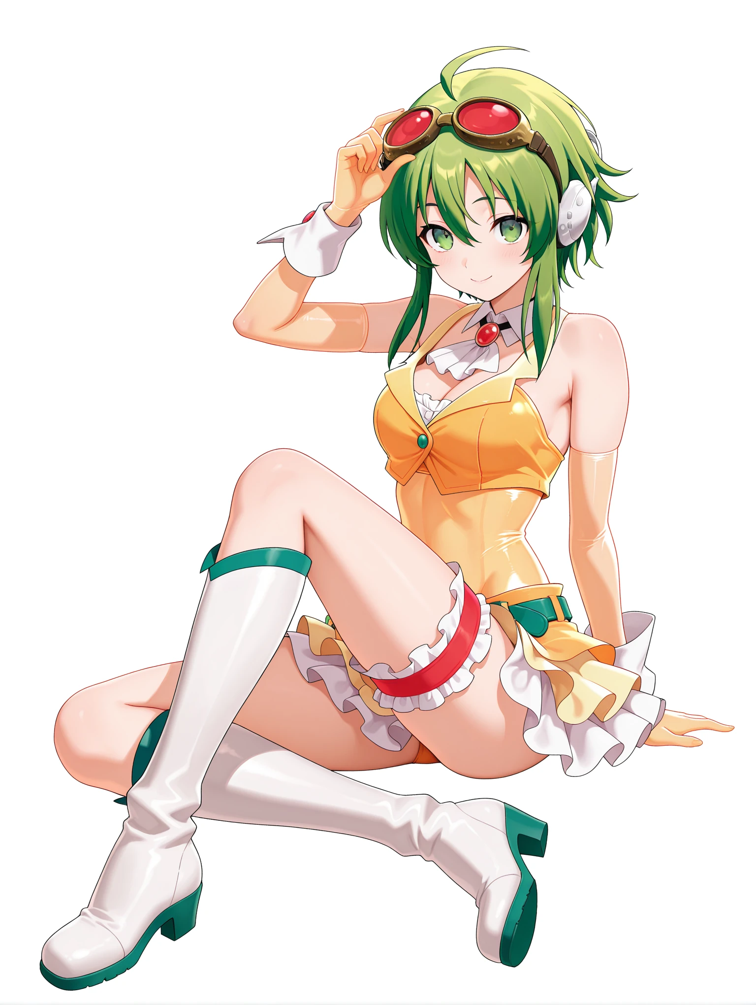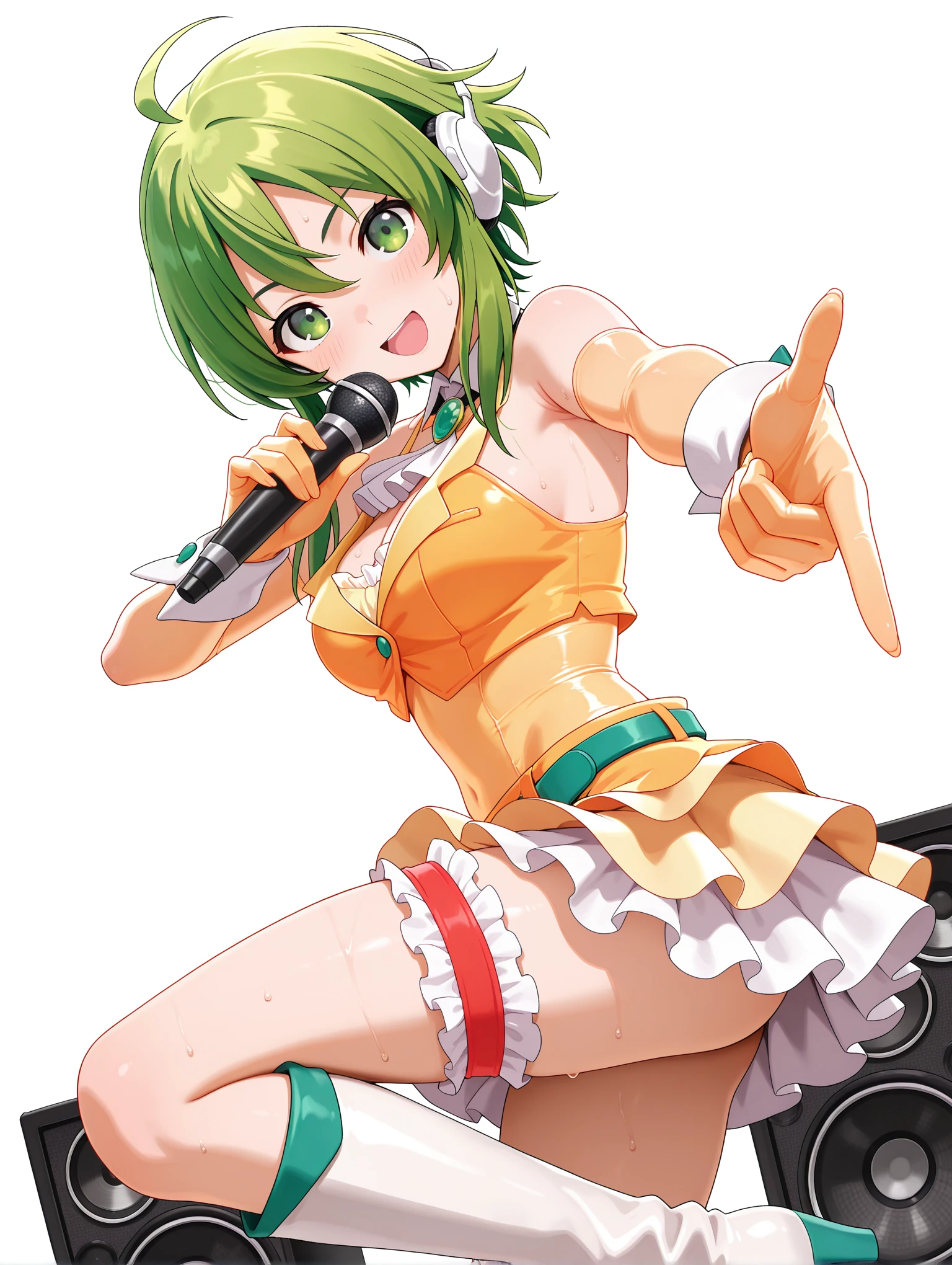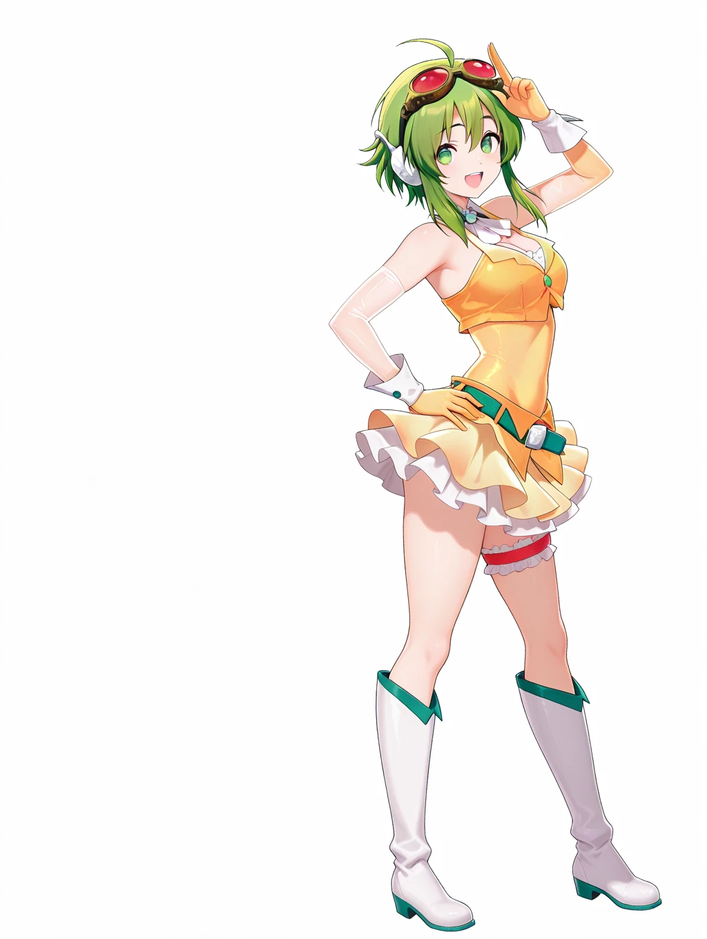 衣装(難あり) ・g_clothes,white ascot,crop_top,bare shoulders,see-through elbow gloves,wrist cuffs,midriff,belt,layered skirt,bridal garter,white footwear,knee boots,