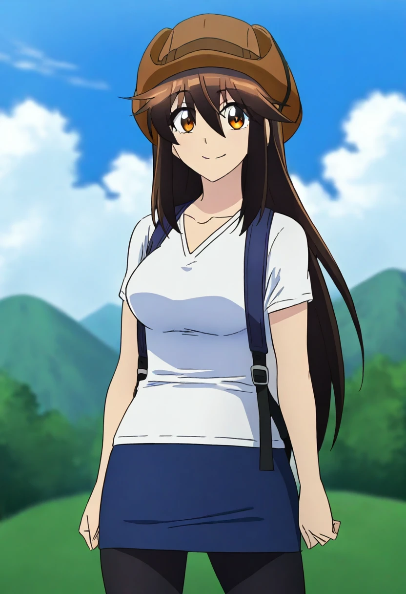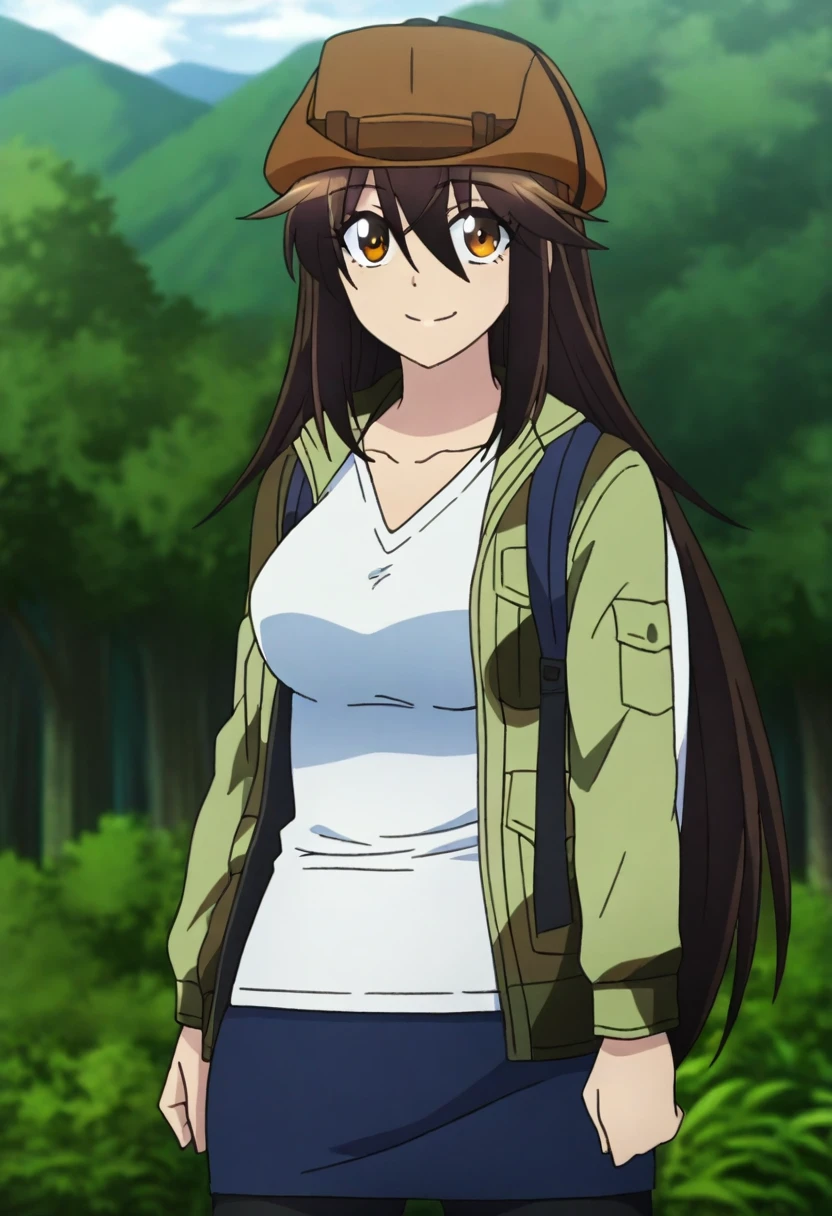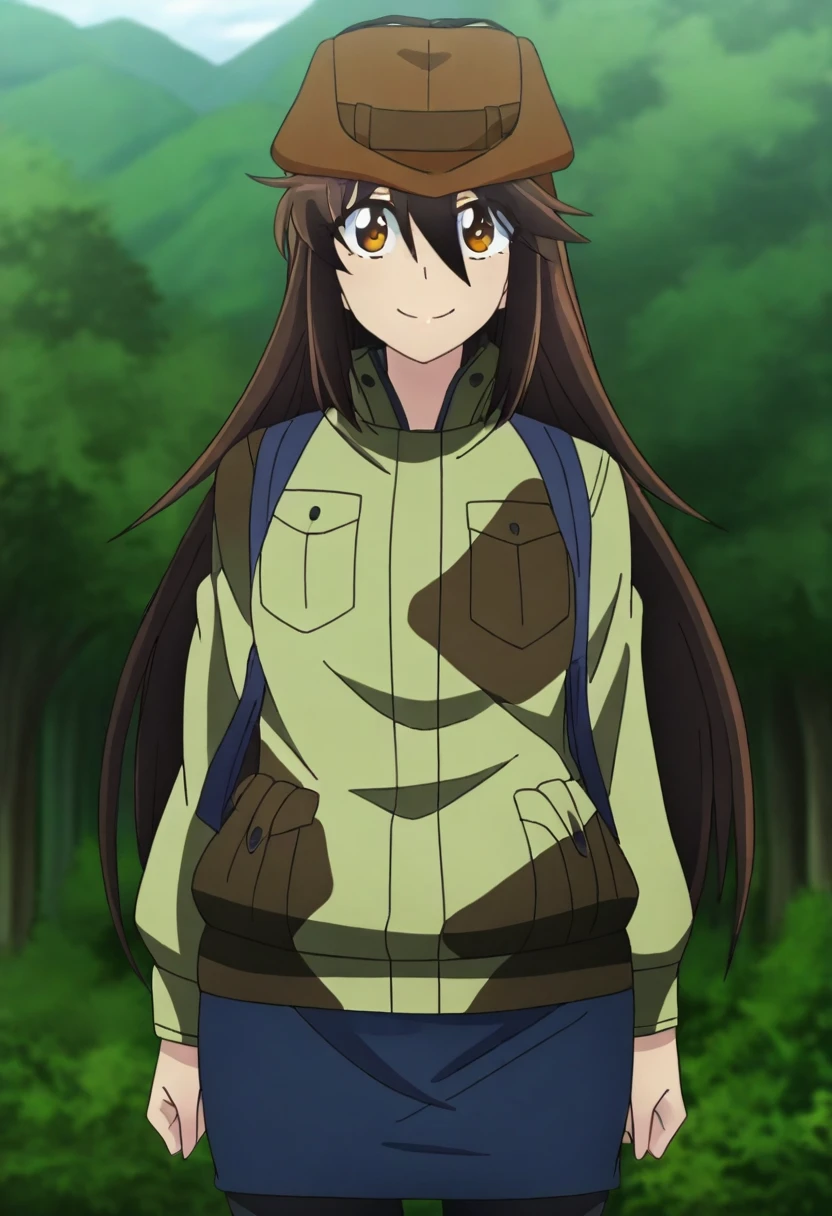 cowboy hat, brown headwear, camouflage jacket, green jacket, blue skirt, black pantyhose, backpack