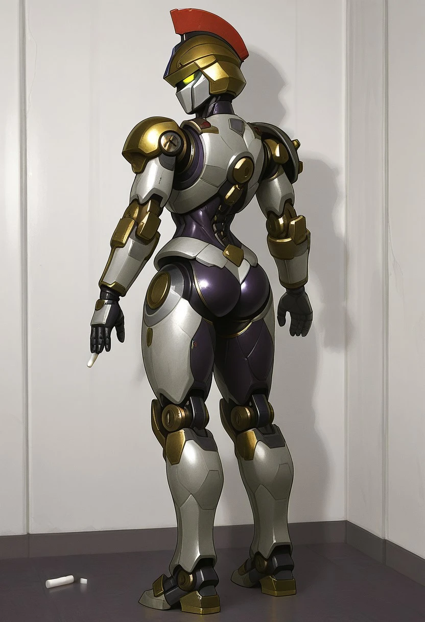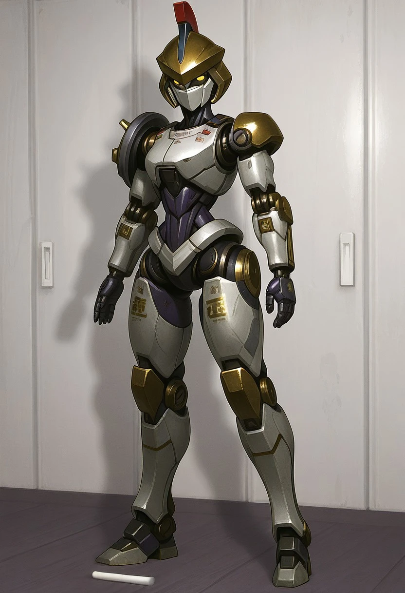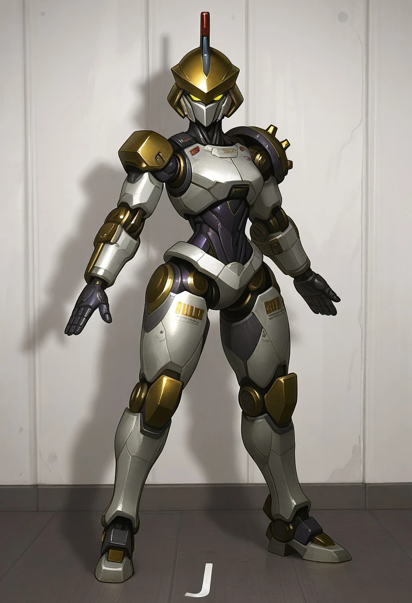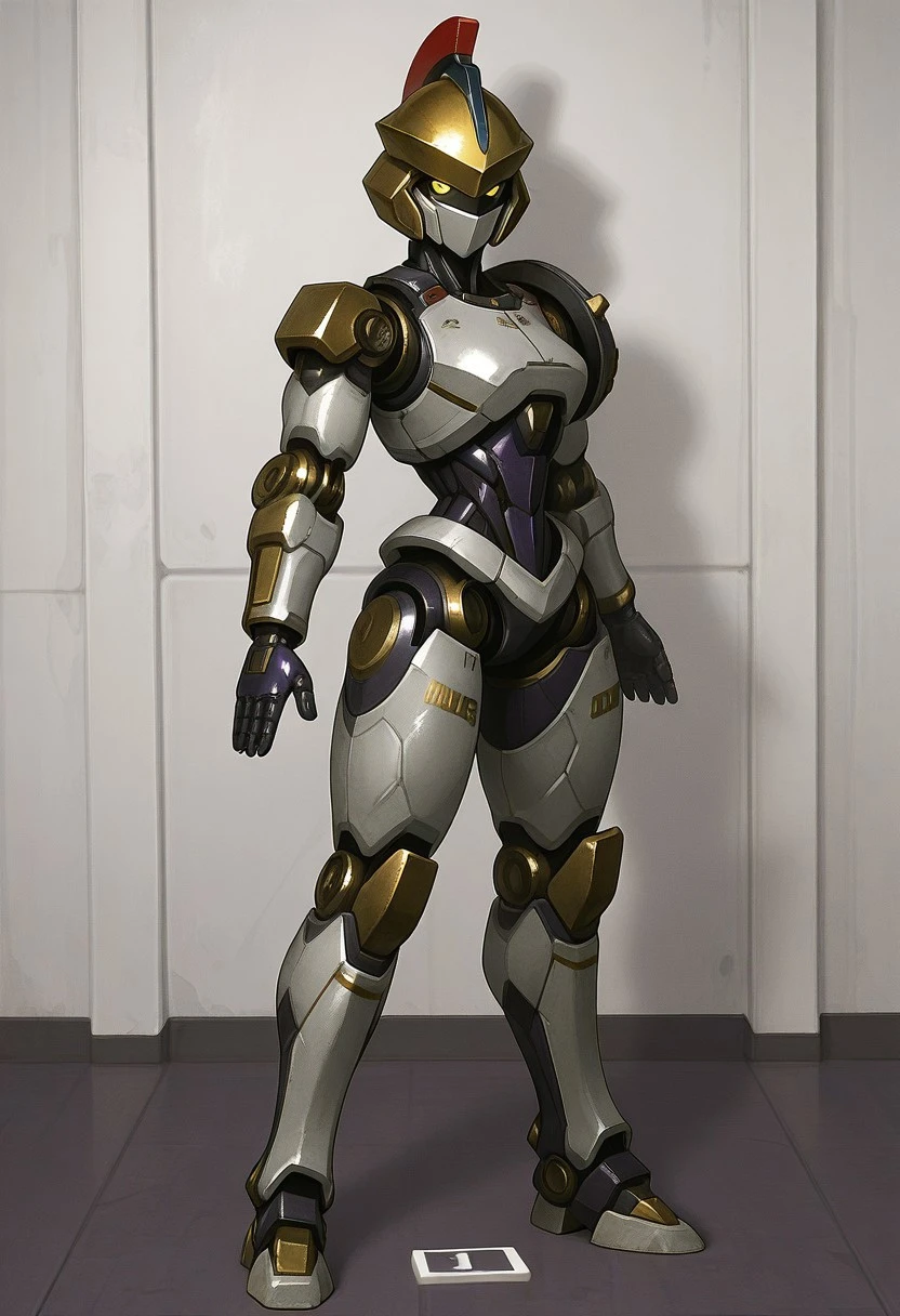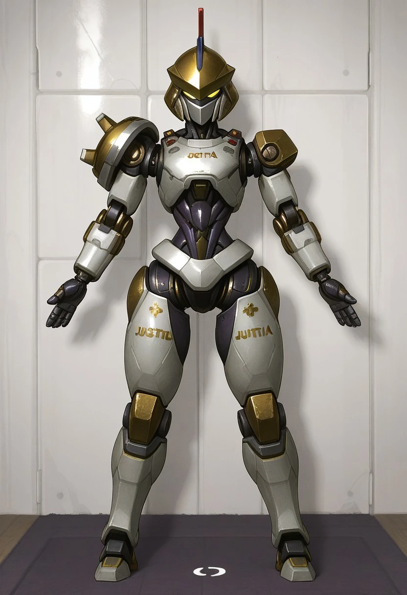 Recommended prompts: Justitia_MR, White armor plates (no human features), Gold details, Mechanical joints, Gold helmet with red crest, Asymmetrical right shoulder pad, Android, Dark purple synthetic muscles, Robot girl, Non-human texture, Smooth surface, Shiny details.