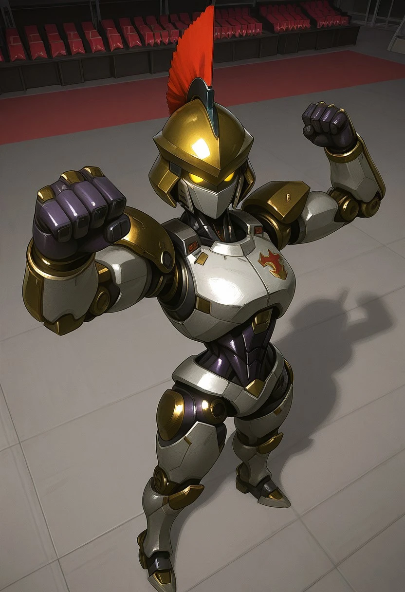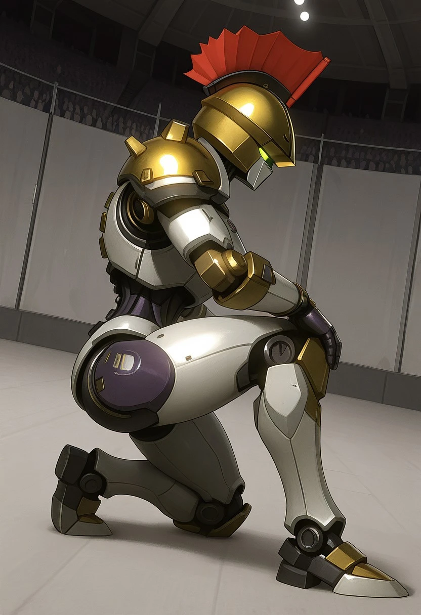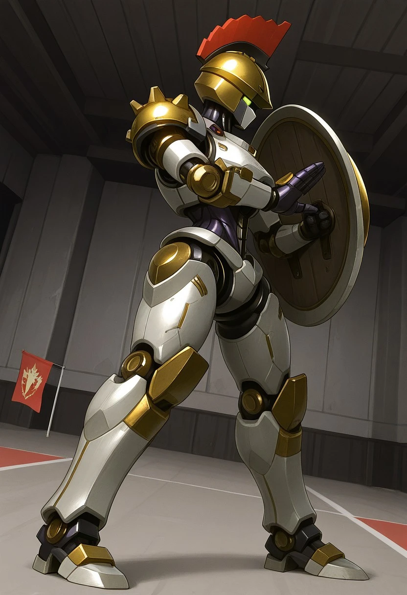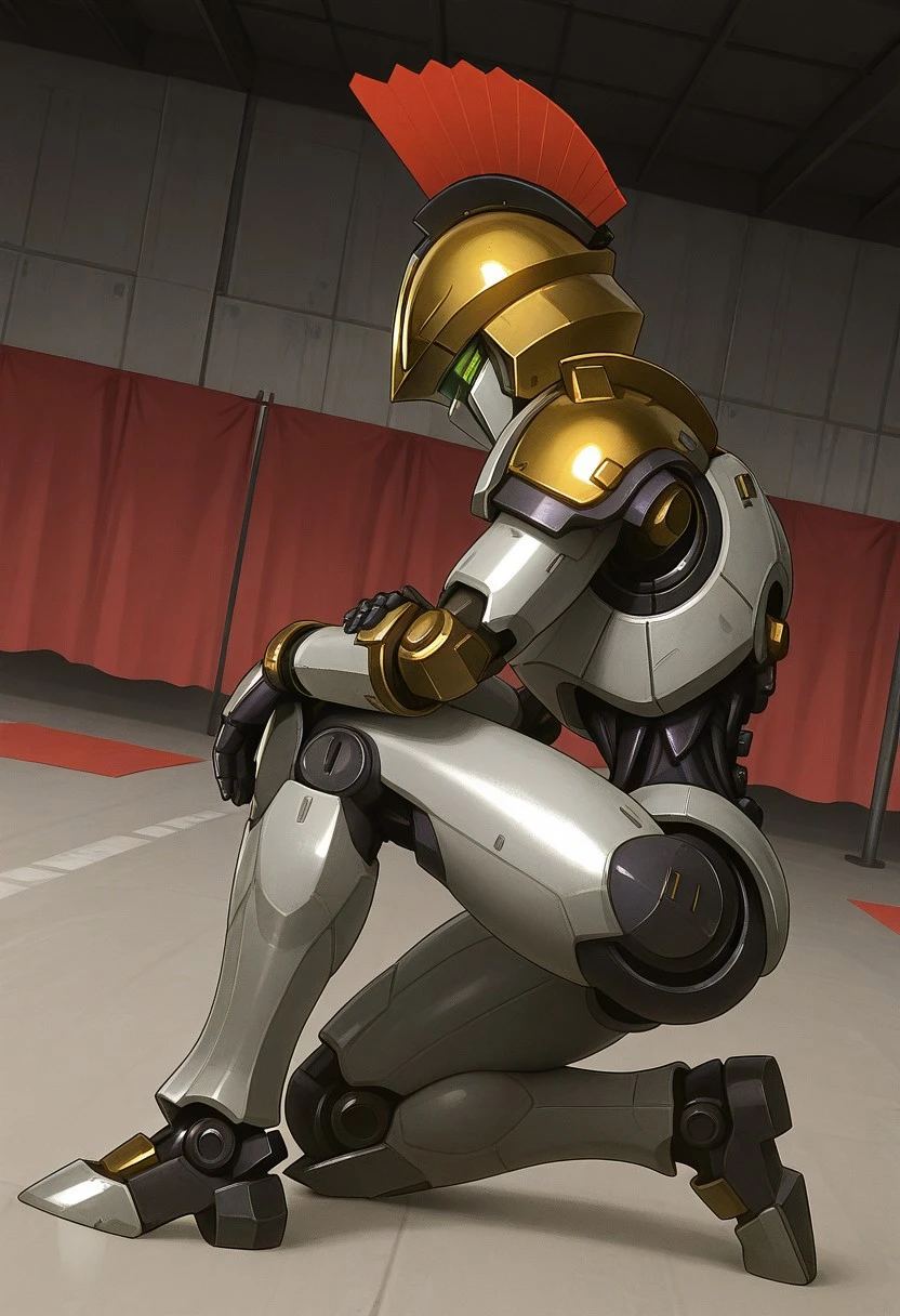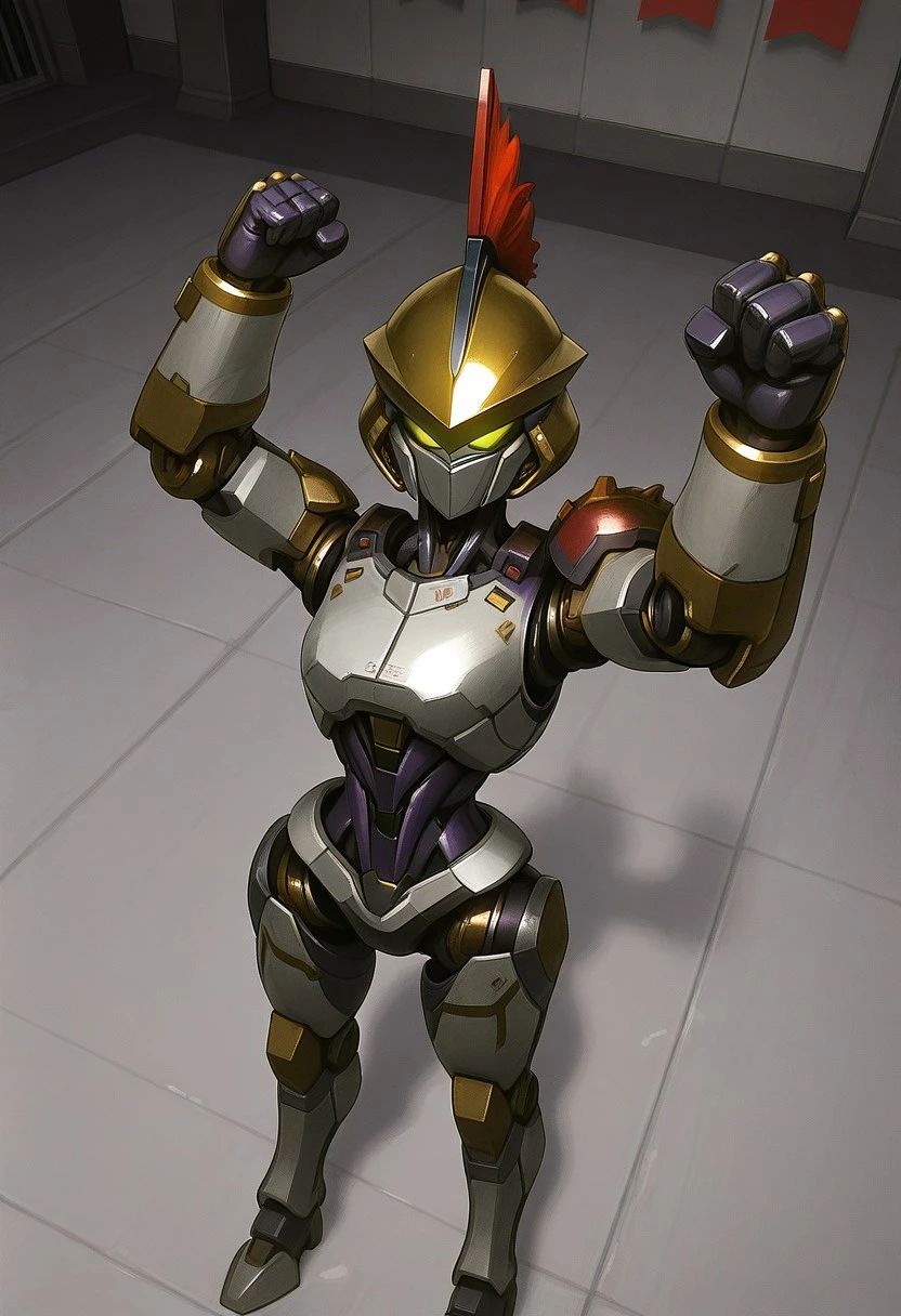 Recommended prompts: Justitia_MR, White armor plates (no human features), Gold details, Mechanical joints, Gold helmet with red crest, Asymmetrical right shoulder pad, Android, Dark purple synthetic muscles, Robot girl, Non-human texture, Smooth surface, Shiny details.