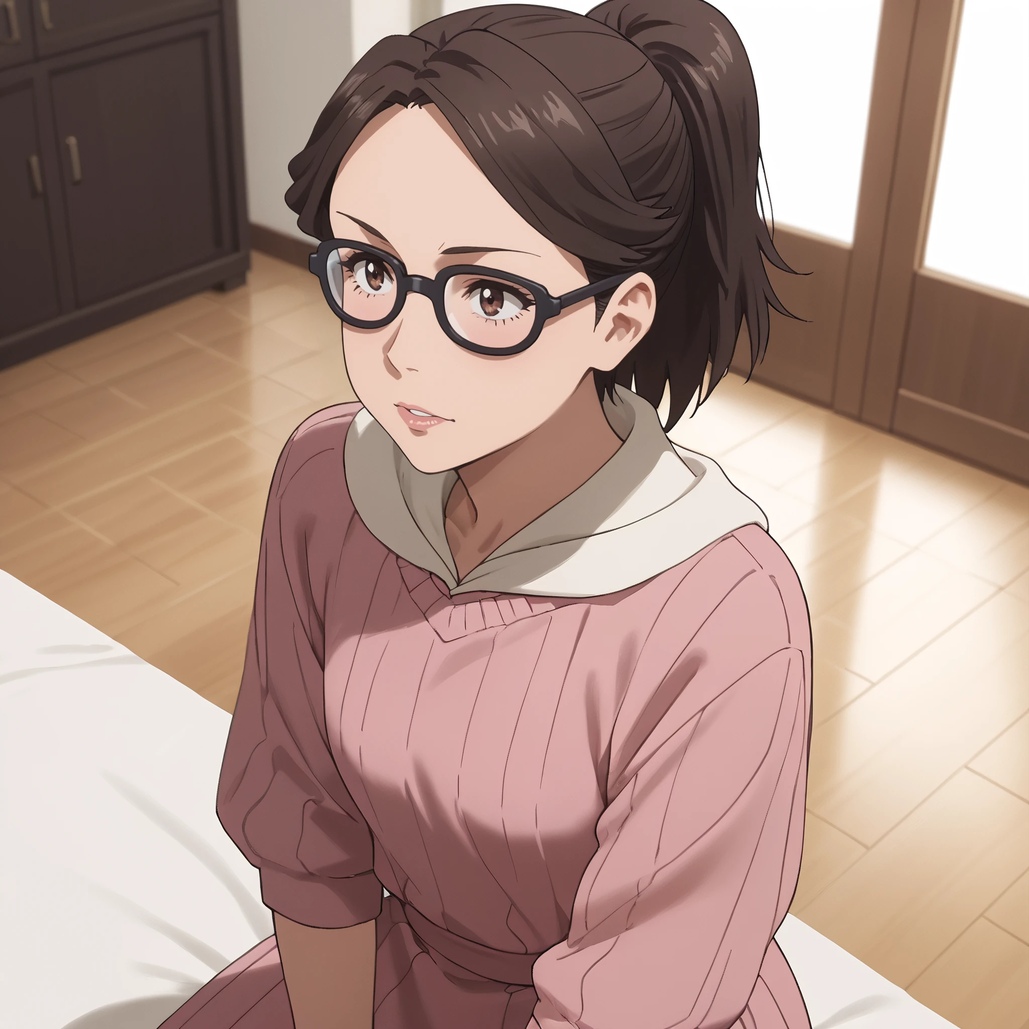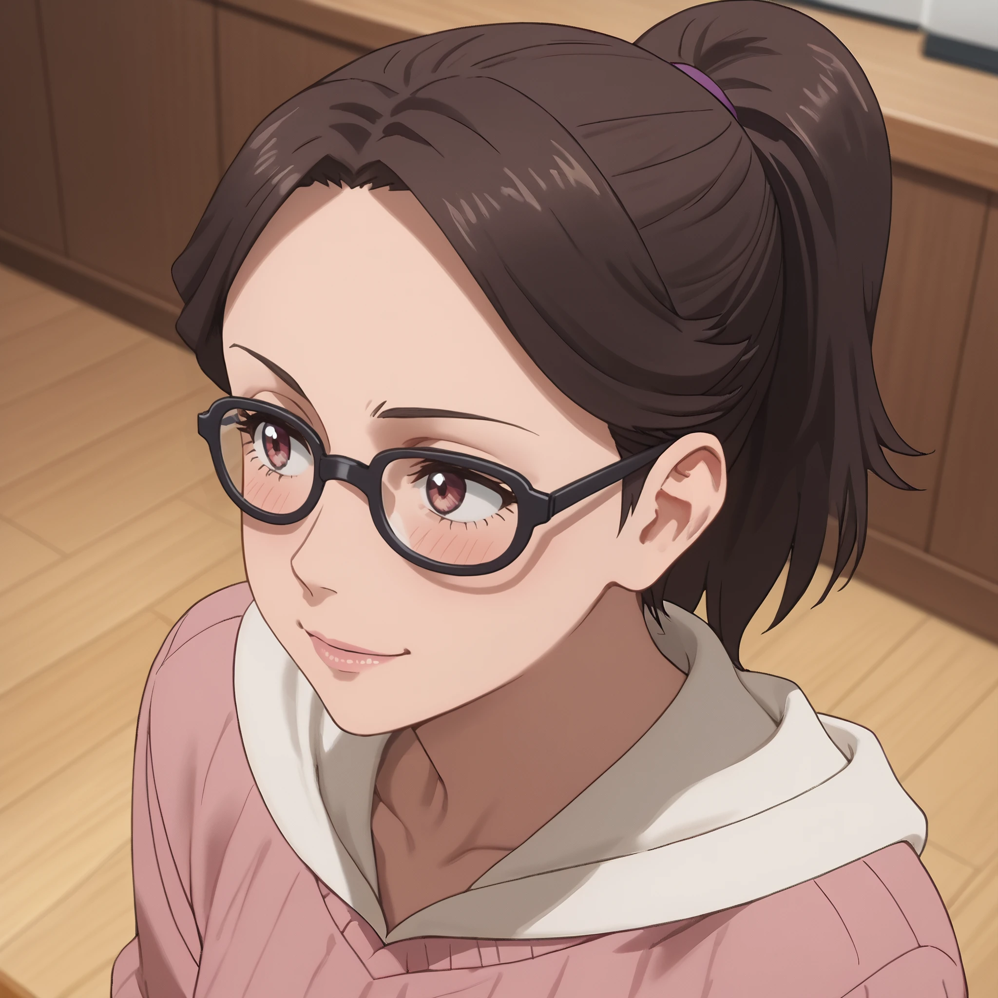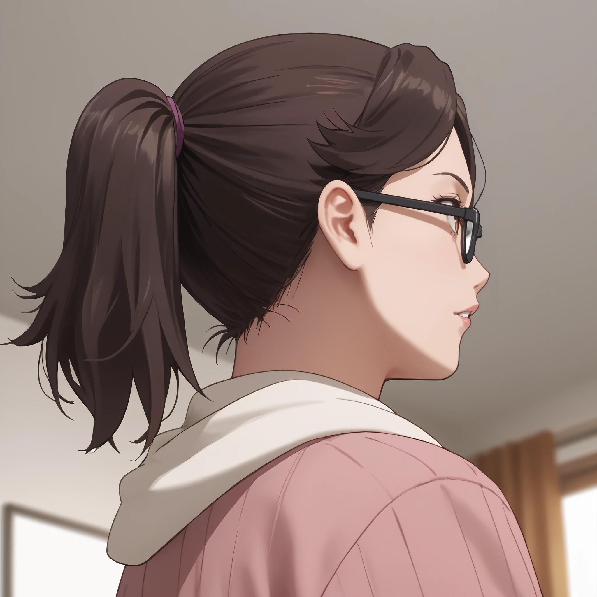 ARTMitsuko, brown hair, short hair, glasses, black-framed eyewear, ponytail, opaque glasses, bangs, hair pulled back, brown eyes, brown-framed eyewear, hair tie,