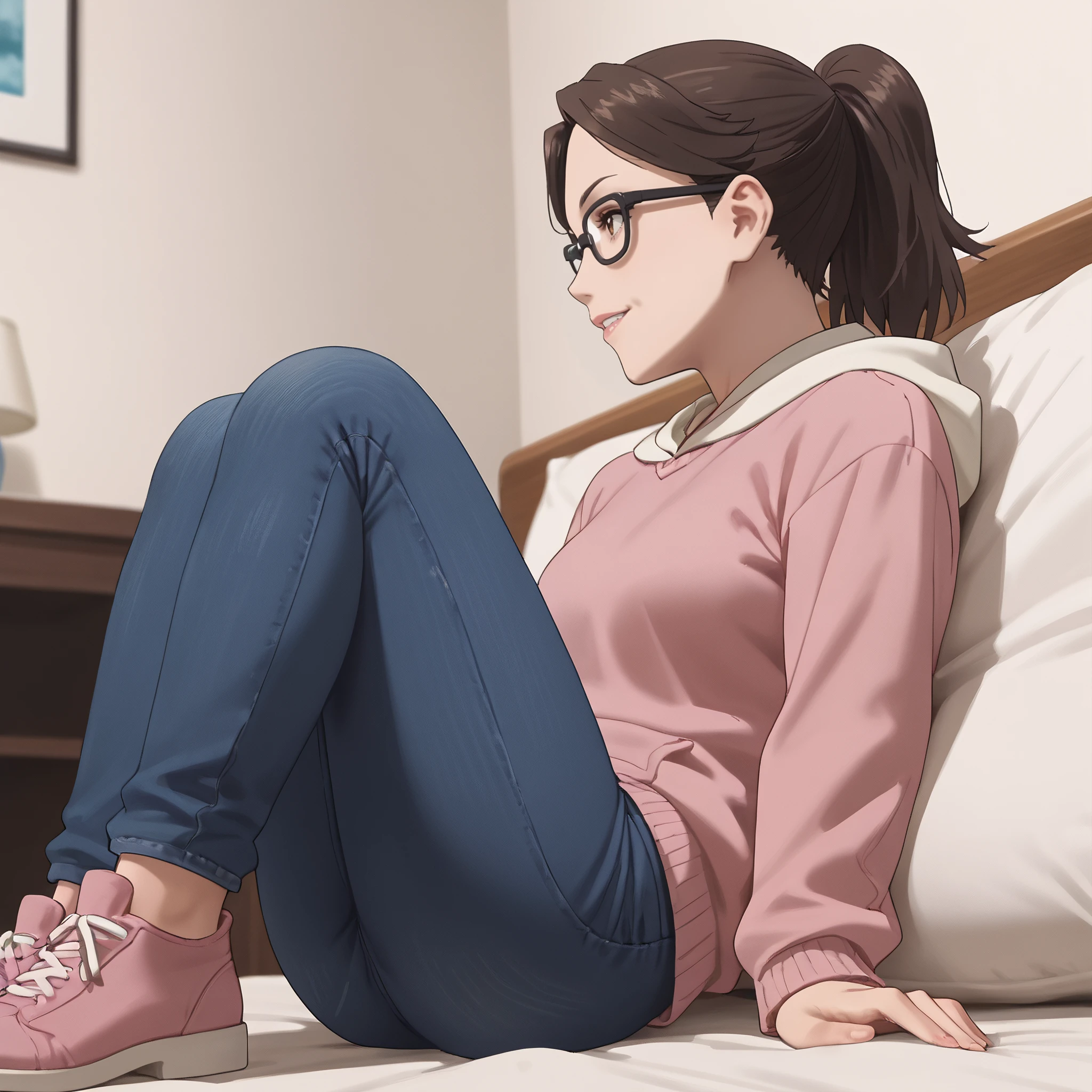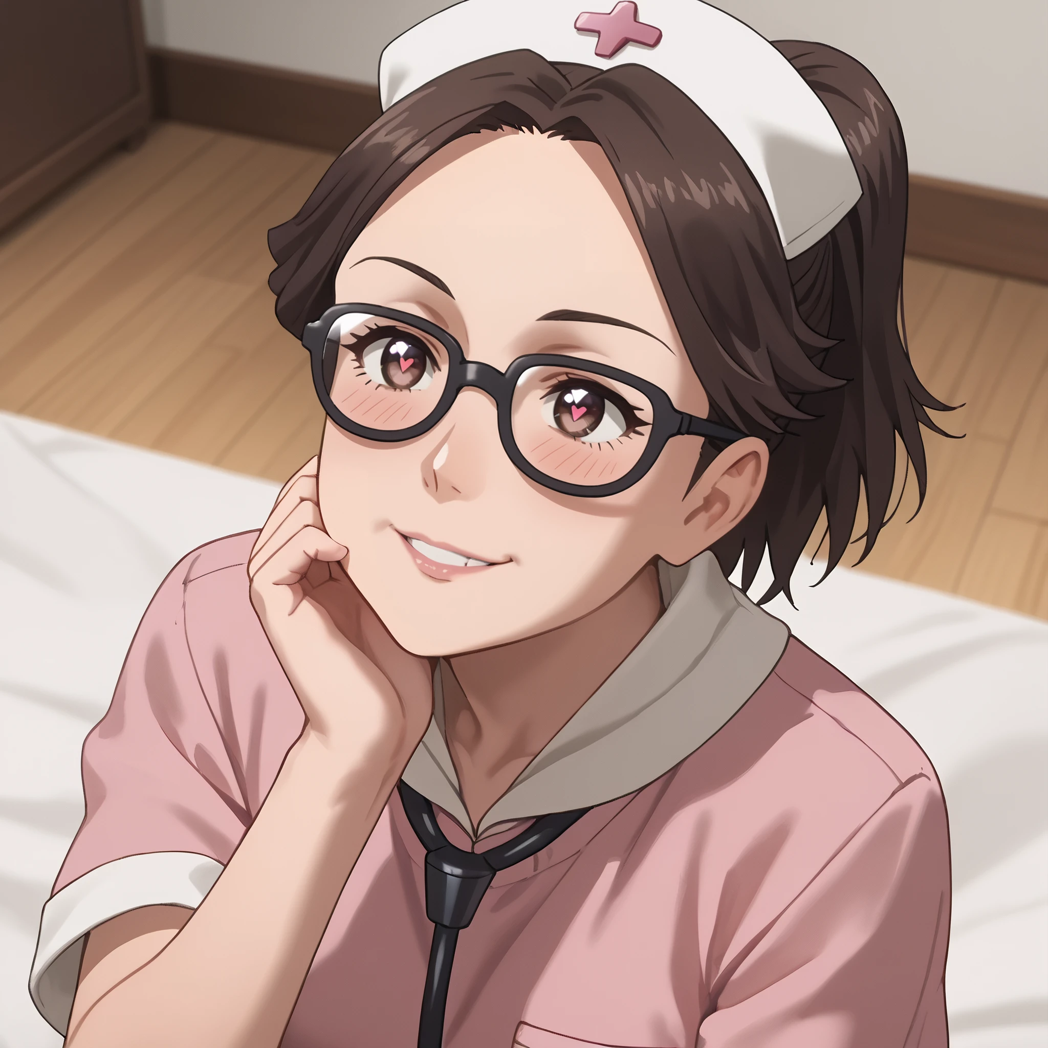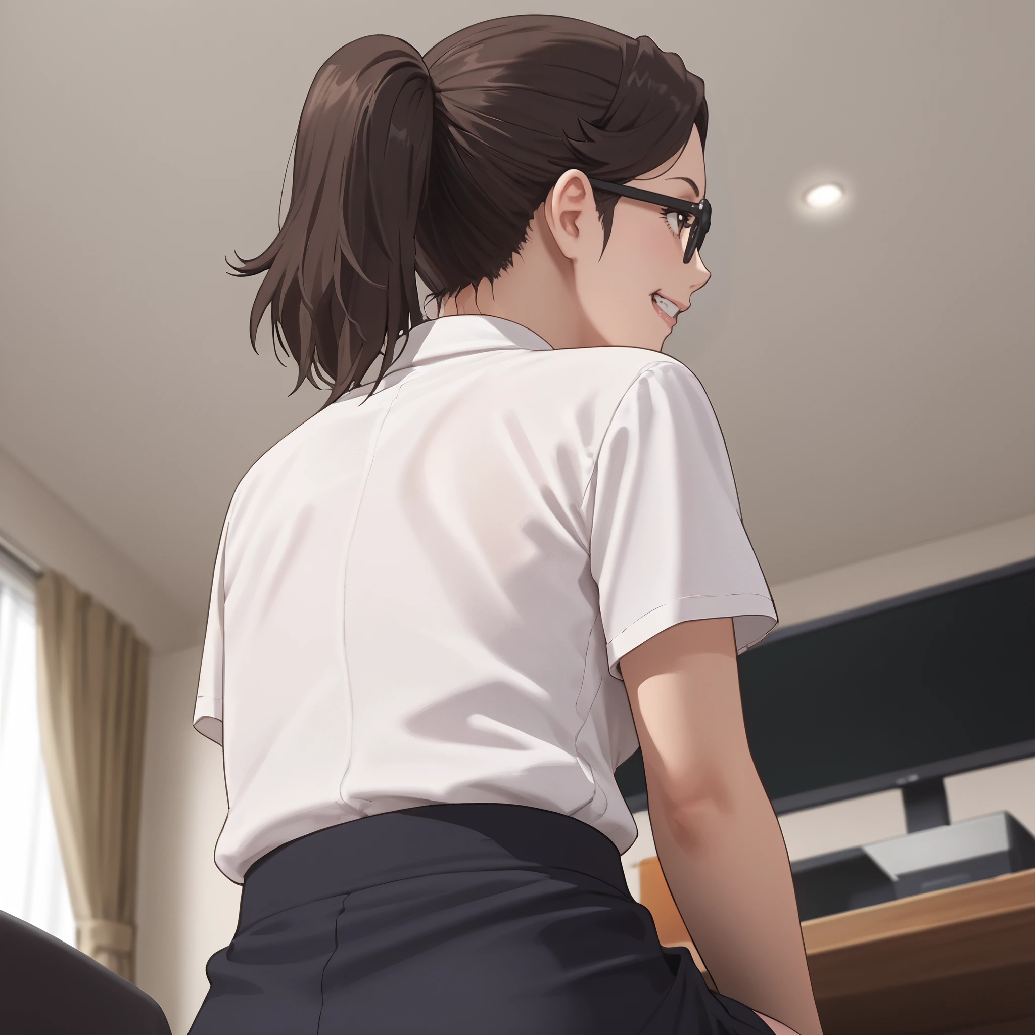 ARTMitsuko, brown hair, short hair, glasses, black-framed eyewear, ponytail, opaque glasses, bangs, hair pulled back, brown eyes, brown-framed eyewear, hair tie,