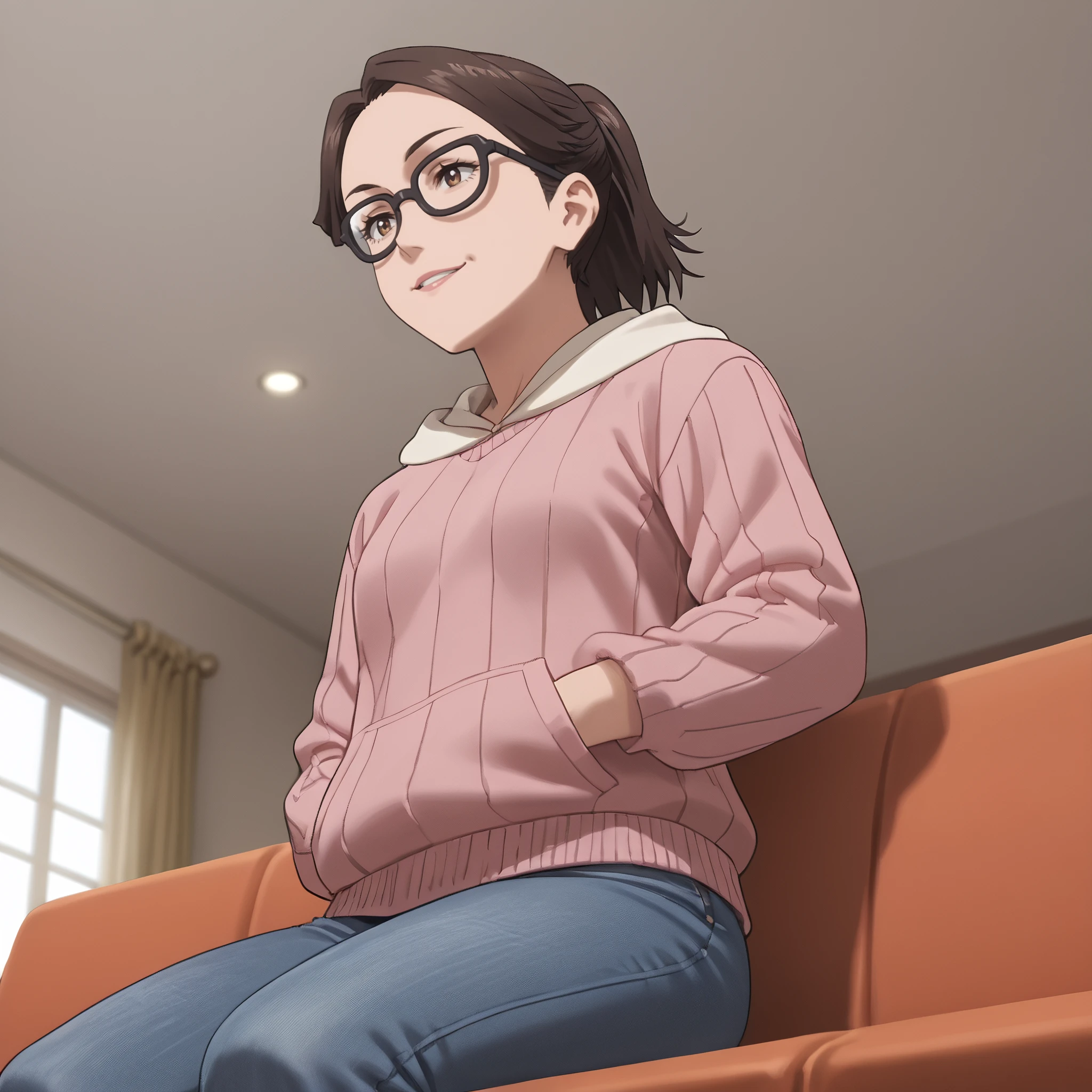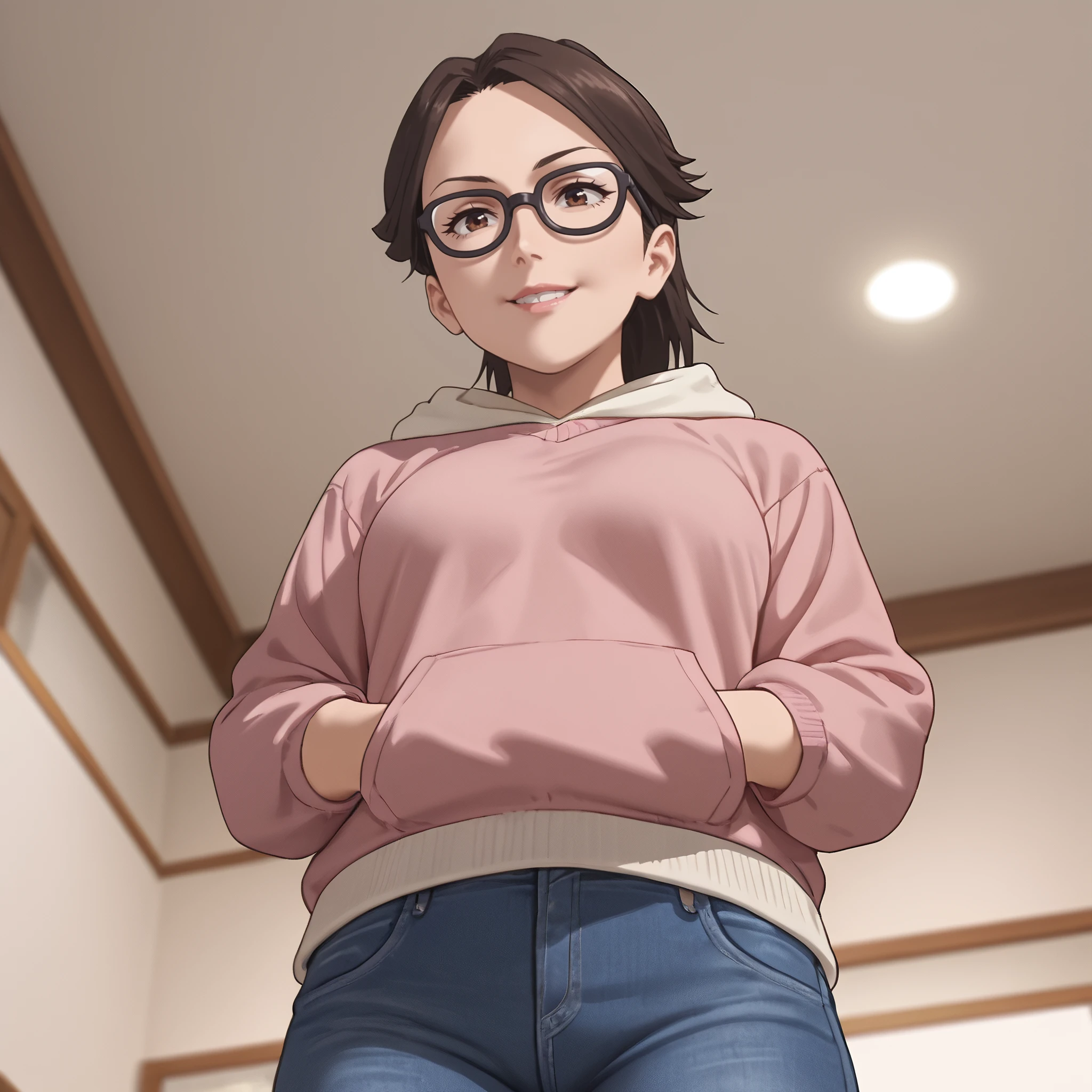 hood, hoodie, hood down, pink hoodie, sweater, pants, denim, jeans,