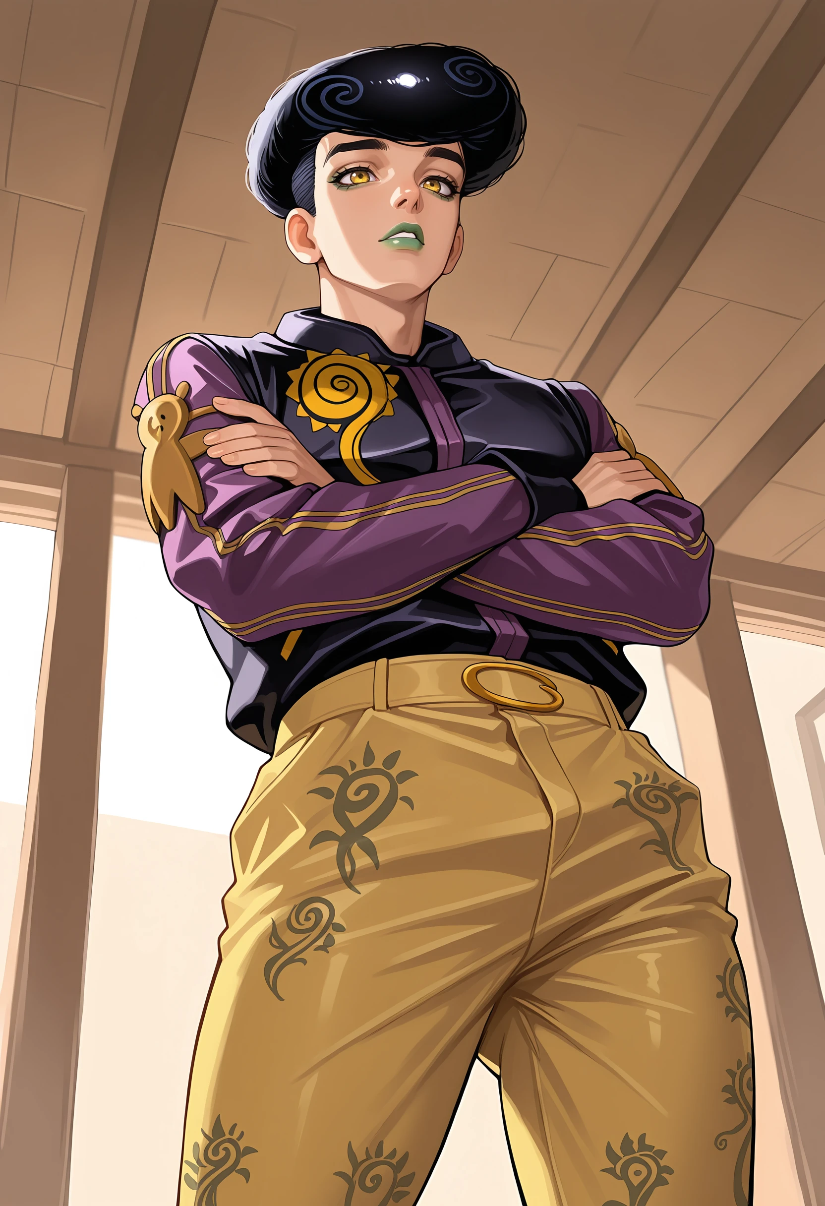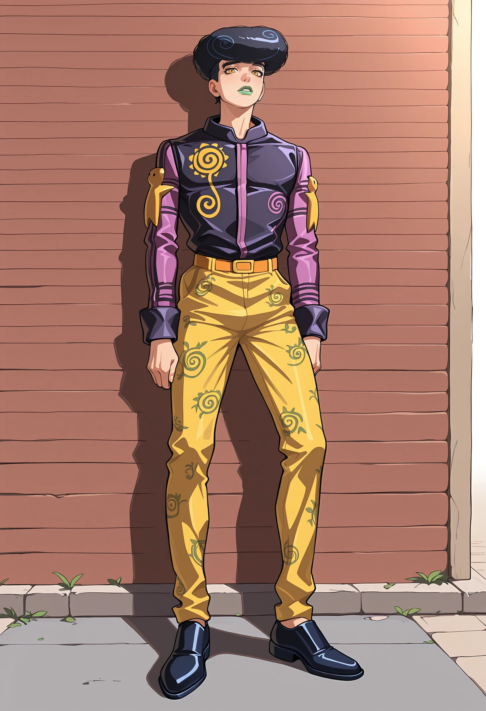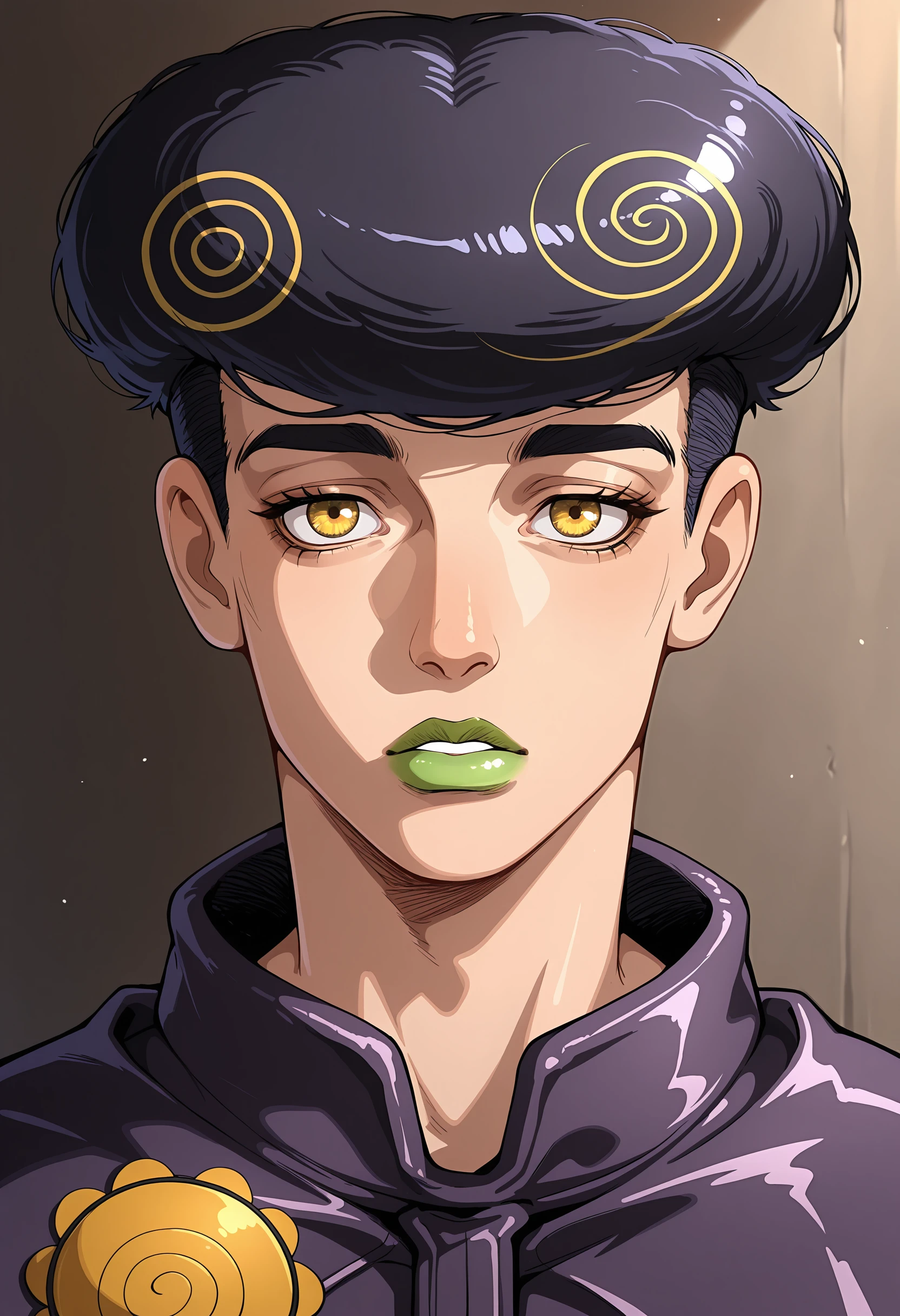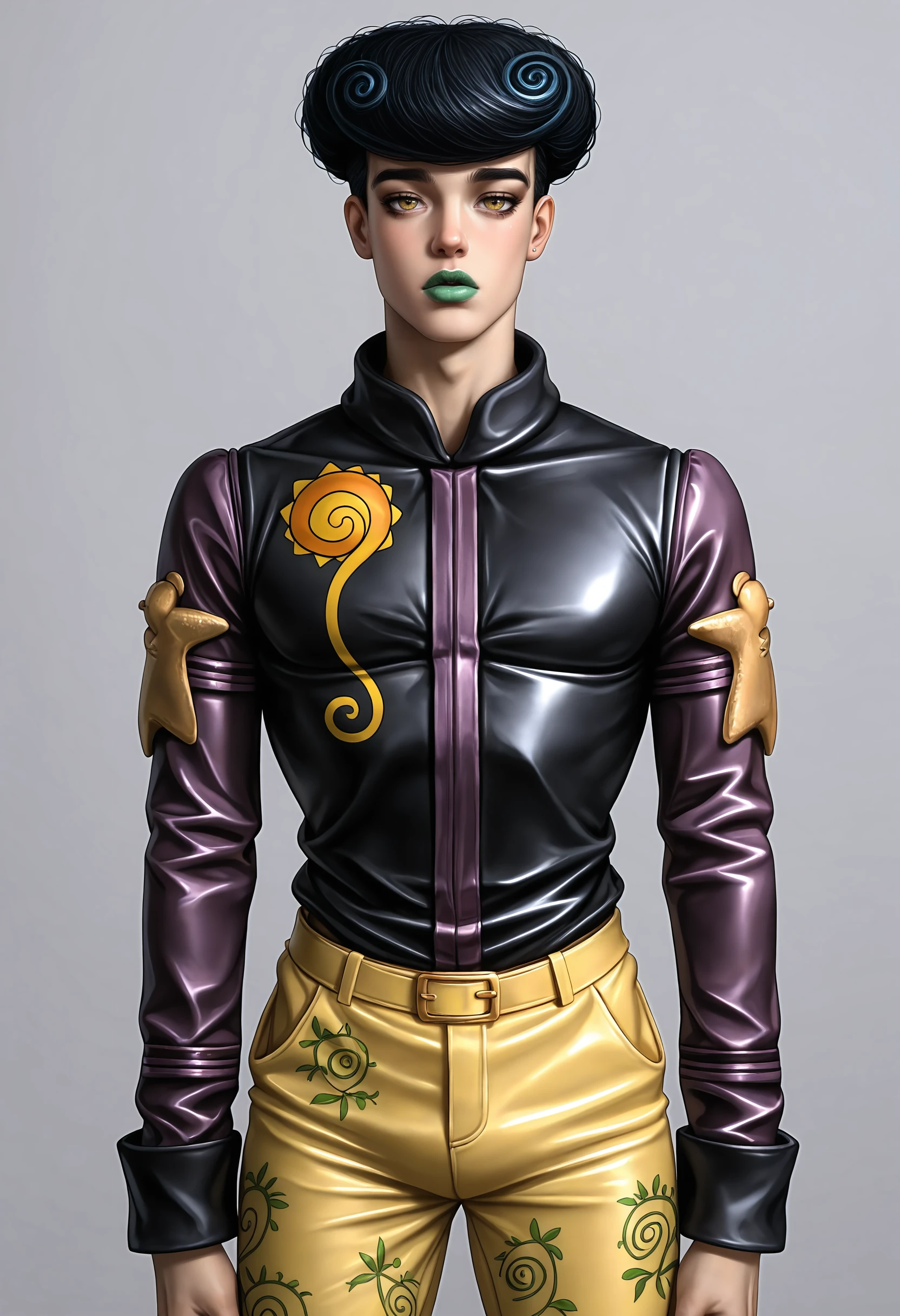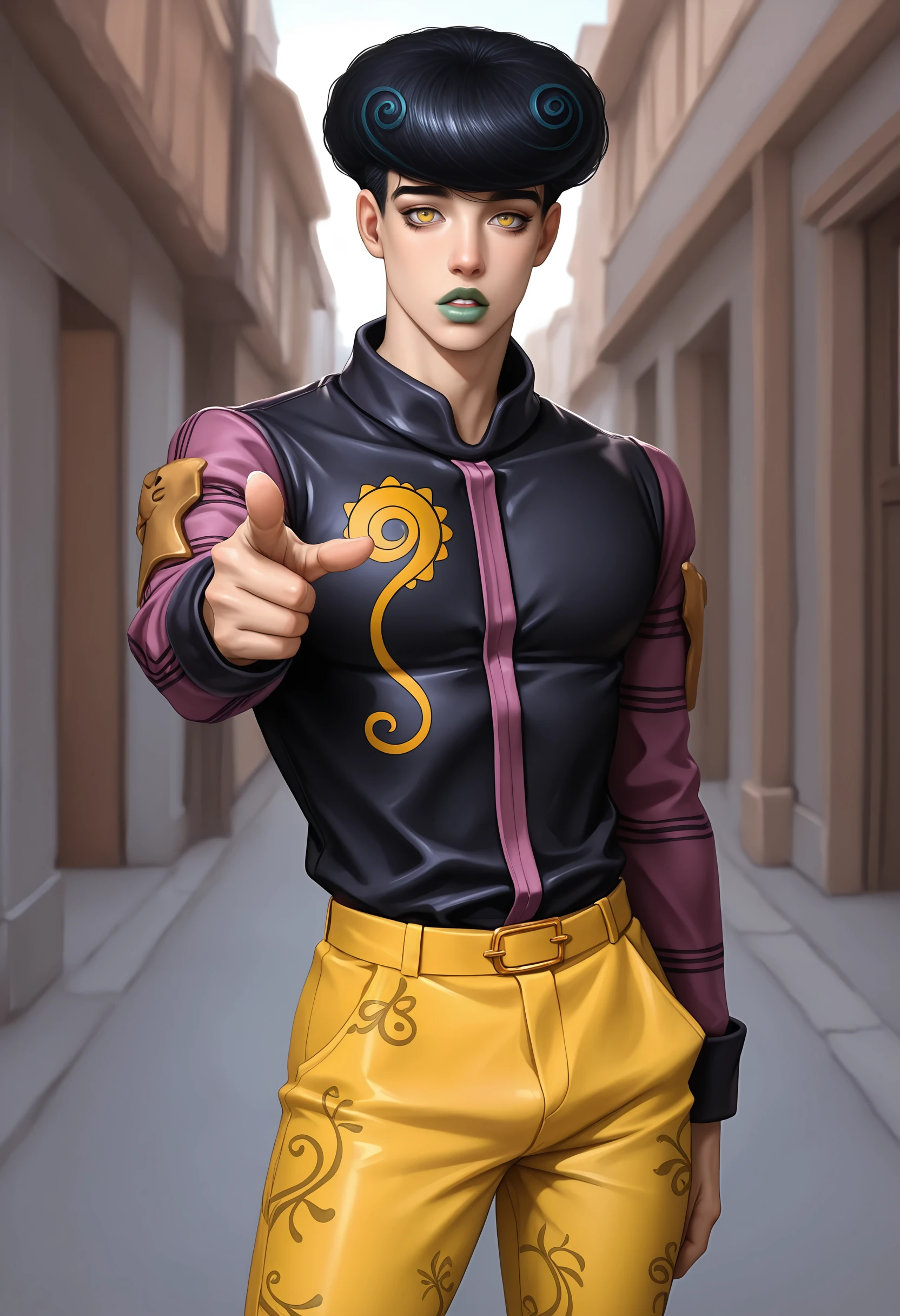 black hair, pompadour, yellow eyes, green lips, jacket, pants