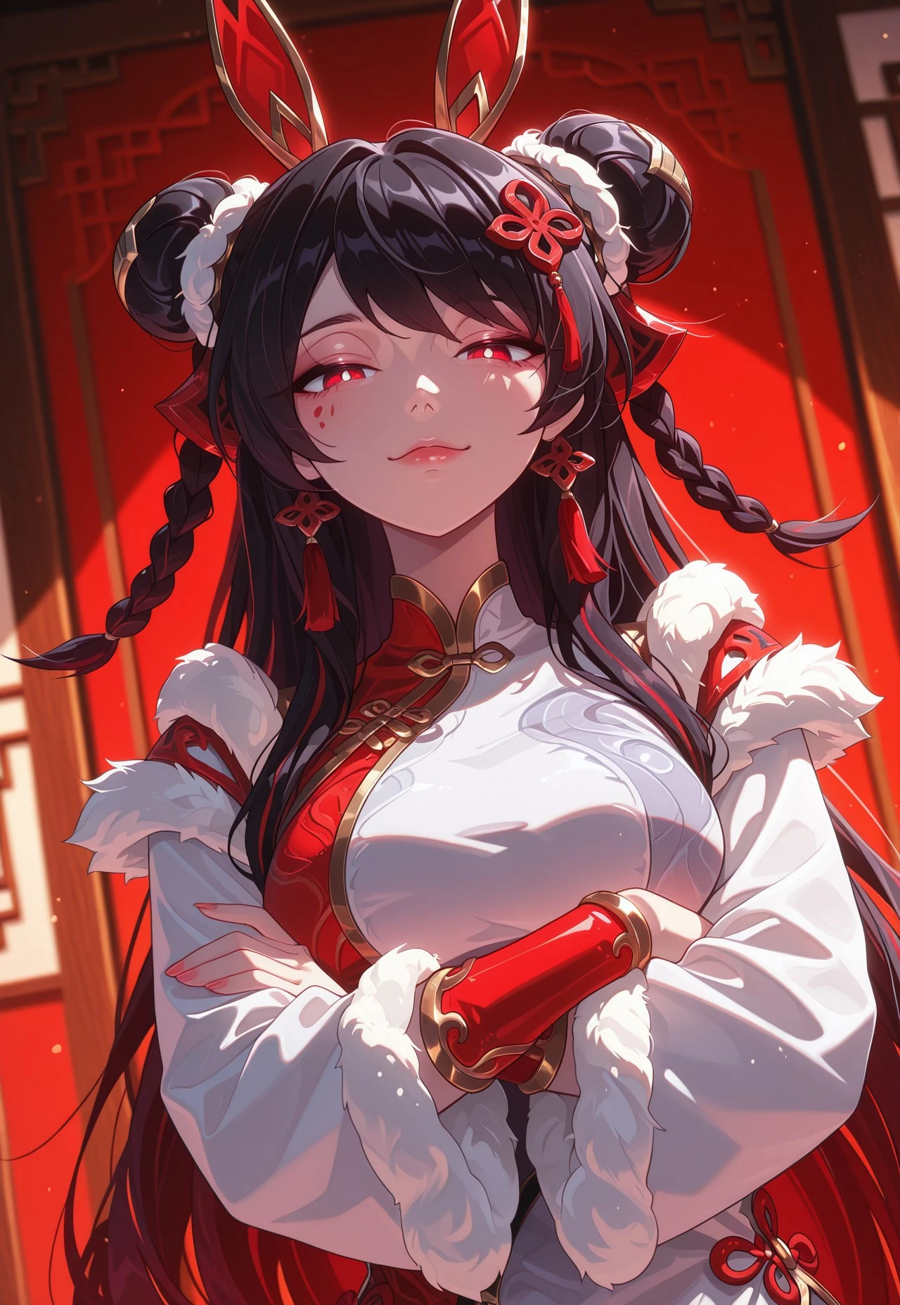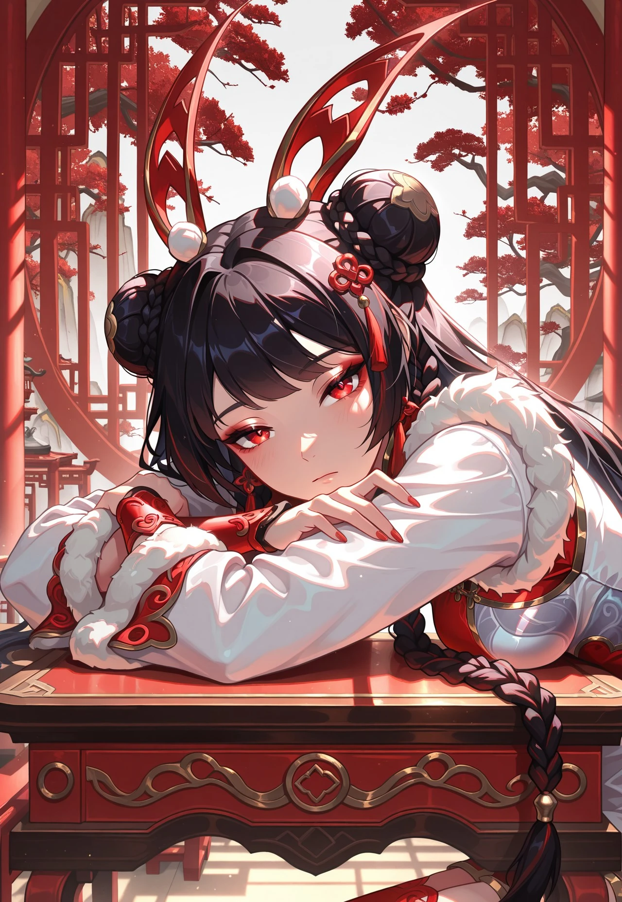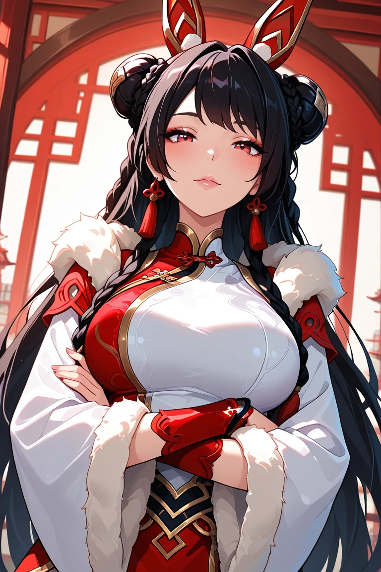 MMKseraphine, black hair, braids, long hair, double bun, hair ornament, red eyes, chinese dress, long sleeves, red bracers, white and red top, white and red dress, multicolored dress, fur trim, thighhigh,