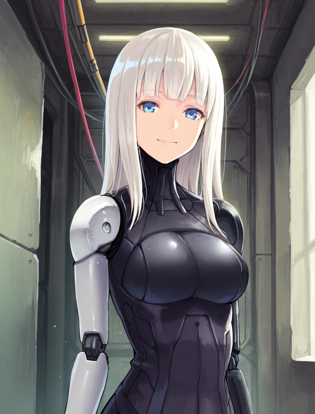 white hair, blue eyes, black dress, short dress, mechanical arms, white arm, black arm, black legs, mechanical legs