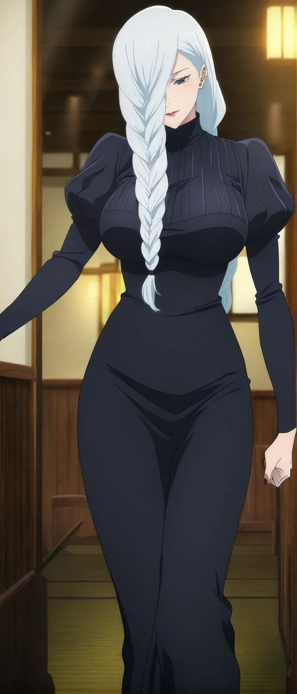 1girl, mature female, long hair, silver hair, braided ponytail, braided bangs, hair over one eye, big breasts,anime coloring