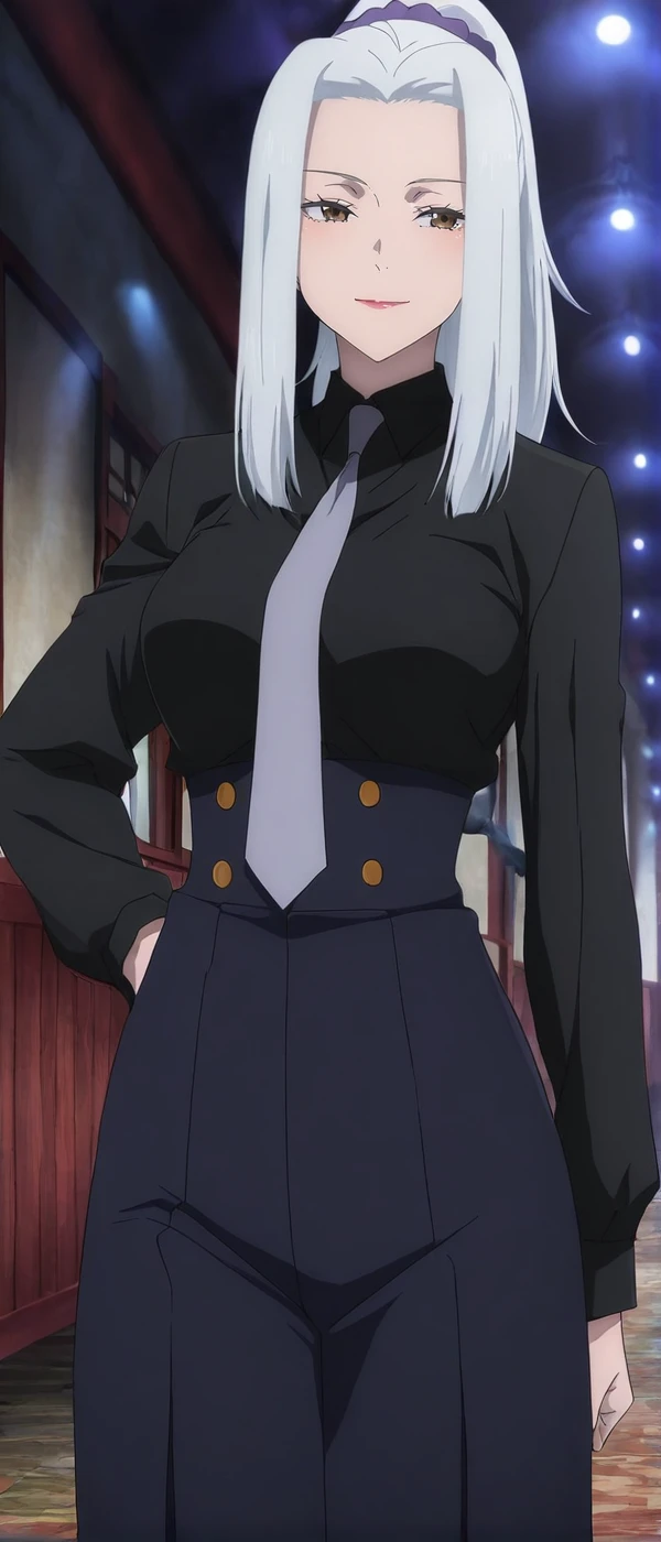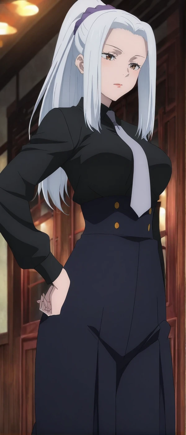 1girl, long hair, silver hair, ponytail, brown eyes, medium breasts, anime coloring