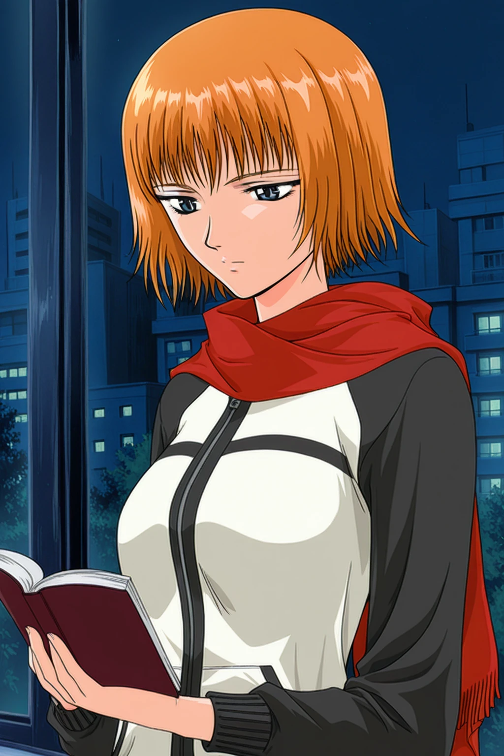 • izyi primegirl,game cg,Susenji Saori,1girl,solo,orange hair,short hair,blue eyes,breasts,red scarf,jacket,long sleeves,raglan sleeves,zipper,pants,shoes,