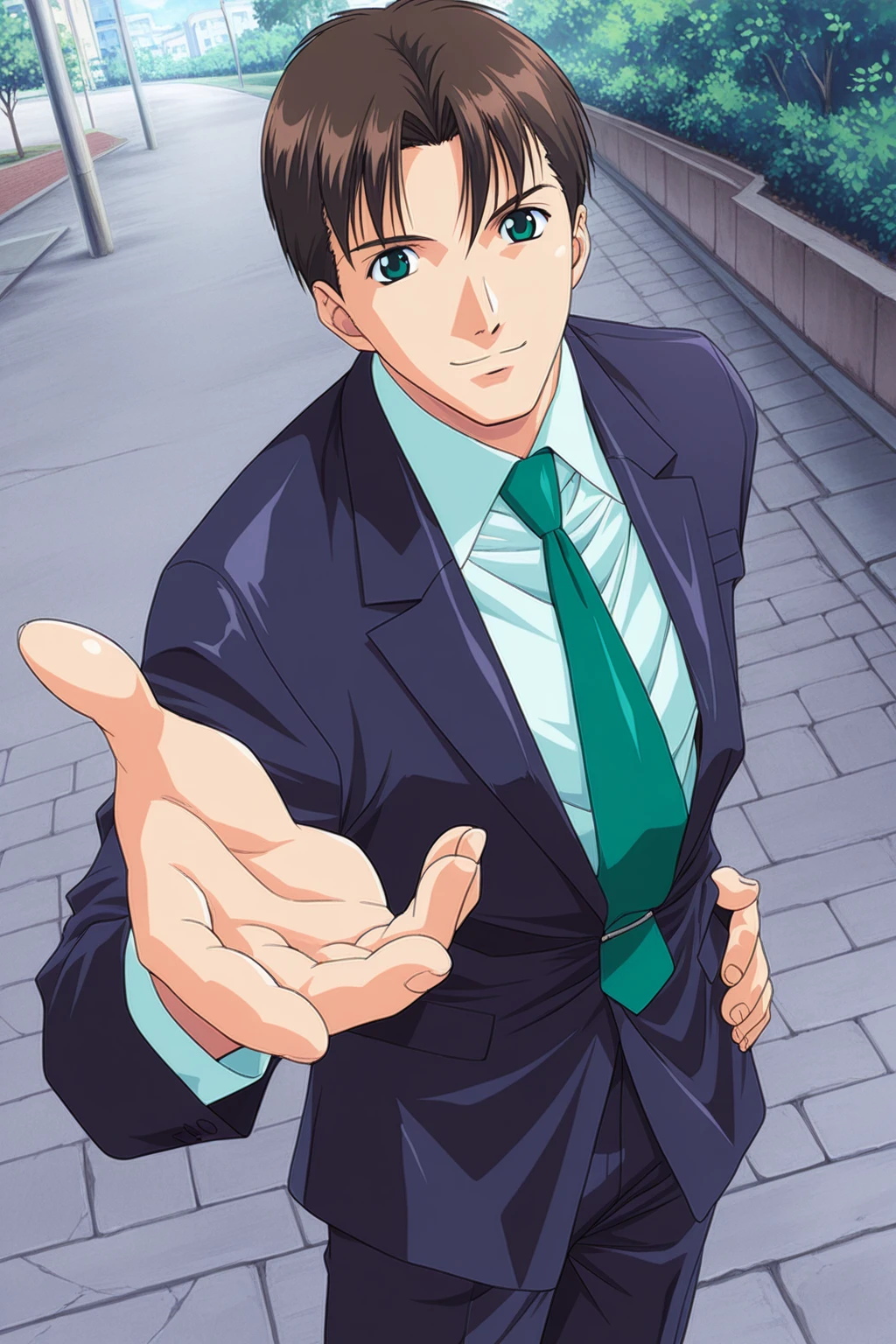izyi primegirl,game cg,Minagawa Takuya,1boy,solo,brown hair,short hair,green eyes,green necktie,suit,formal,,white shirt,collared shirt,long sleeves,pants,black footwear,