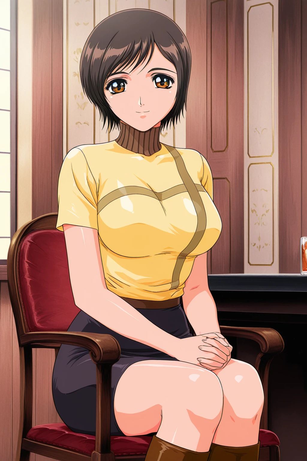 • izyi primegirl,game cg,Nanase Kiriko,1girl,solo,brown hair,short hair,brown eyes,large breasts,yellow shirt,turtleneck,short sleeves,single belt,pencil skirt,knee boots,