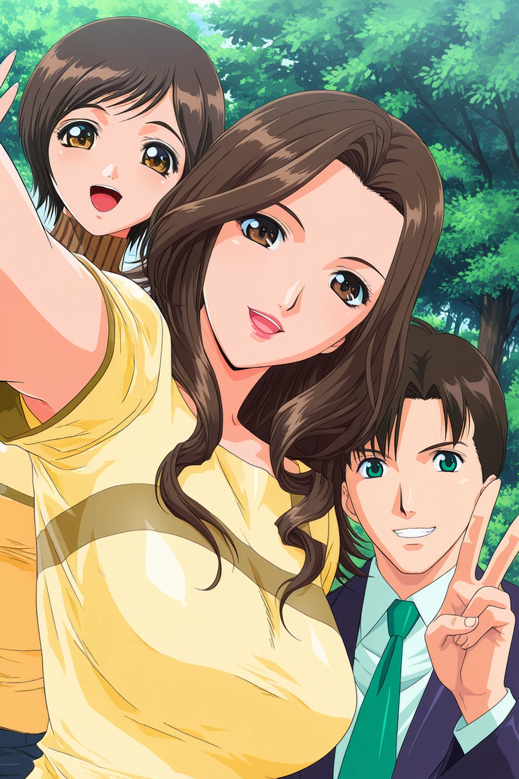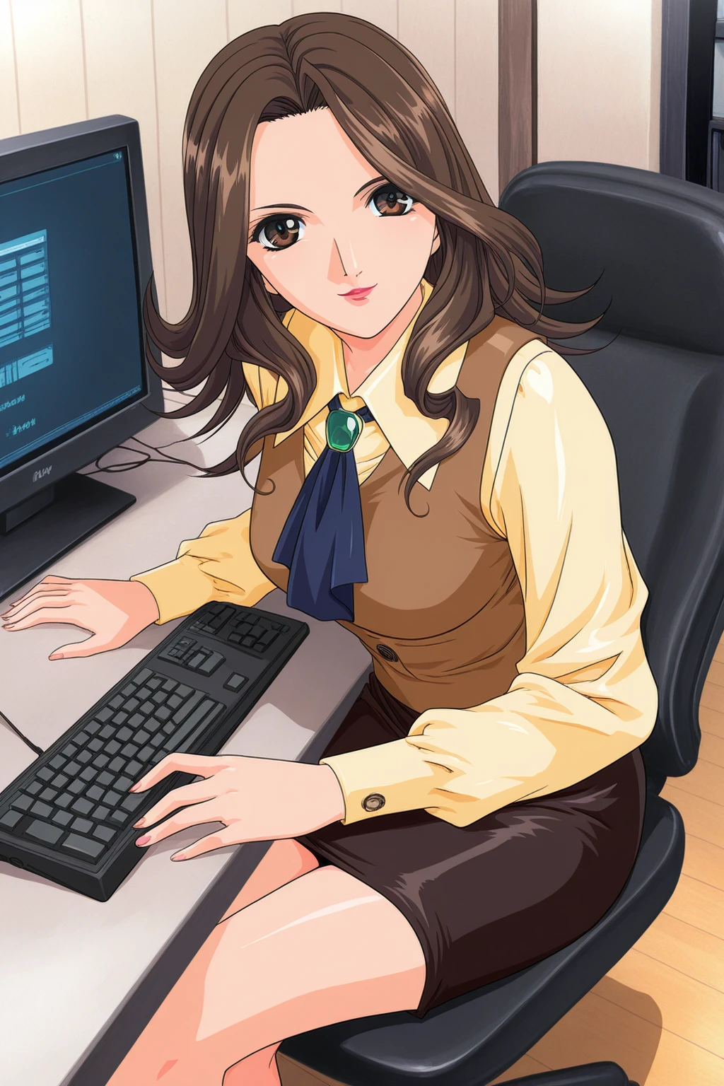 • izyi primegirl,game cg,Izaya Ryou,1girl,solo,brown hair,long hair,brown eyes,lipstick,makeup,breasts,brown vest,formal,yellow collared shirt,long sleeves,blue ascot,green brooch,brown pencil skirt,ballet flats,