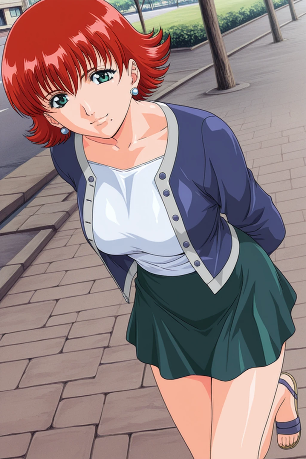 • izyi primegirl,game cg,Hitomi,1girl,solo,red hair,short hair,bangs,flipped hair,green eyes,mole under mouth,mole,breasts,collarbone,jewelry,earrings,collarless jacket,open jacket,white shirt,long sleeves,green skirt,sandals,