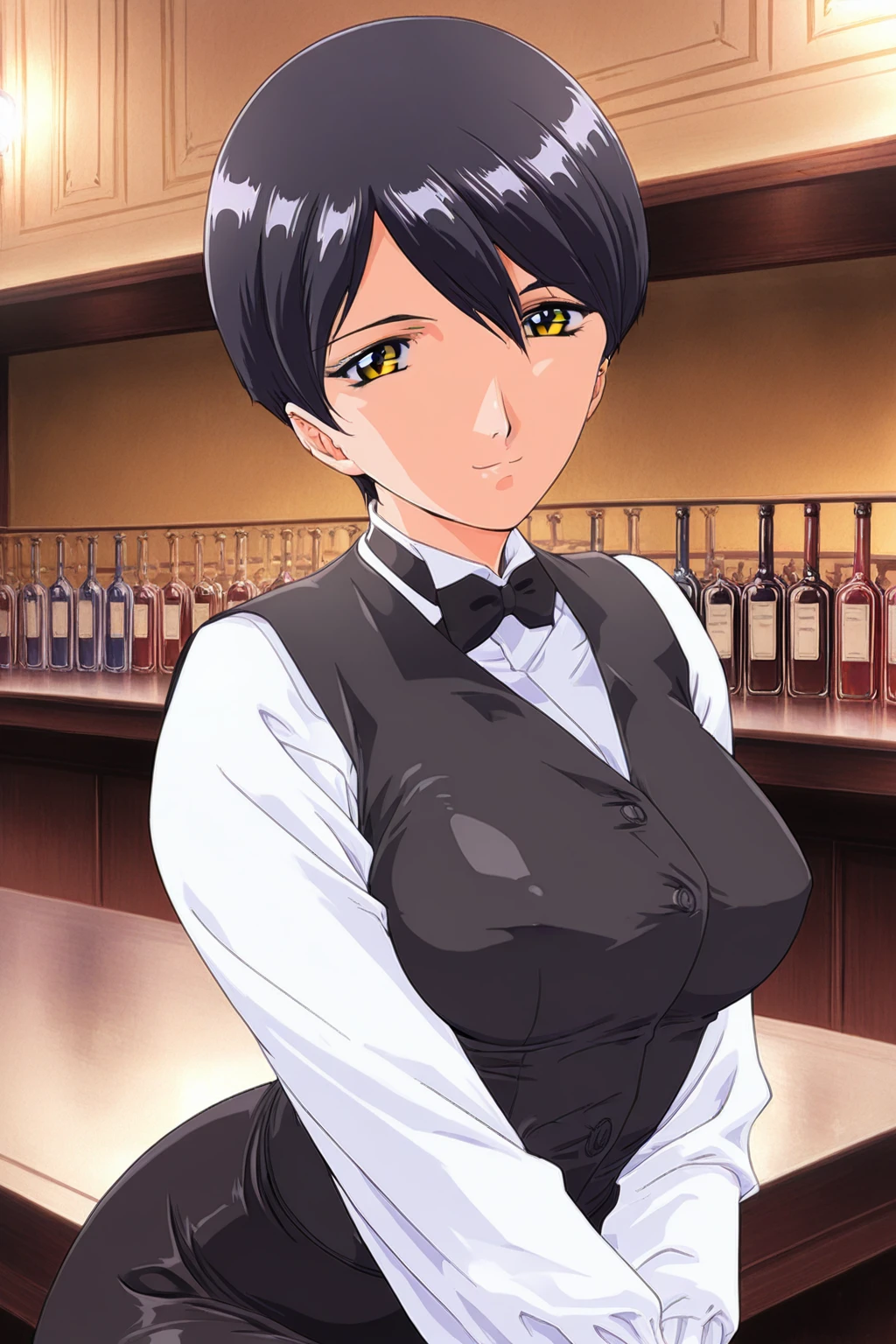 • izyi primegirl,game cg,Maya,1girl,solo,black hair,short hair,bangs,yellow eyes,breasts,black bow,black bowtie,black vest,white shirt,collared shirt,long sleeves,black pencil skirt,ballet flats,