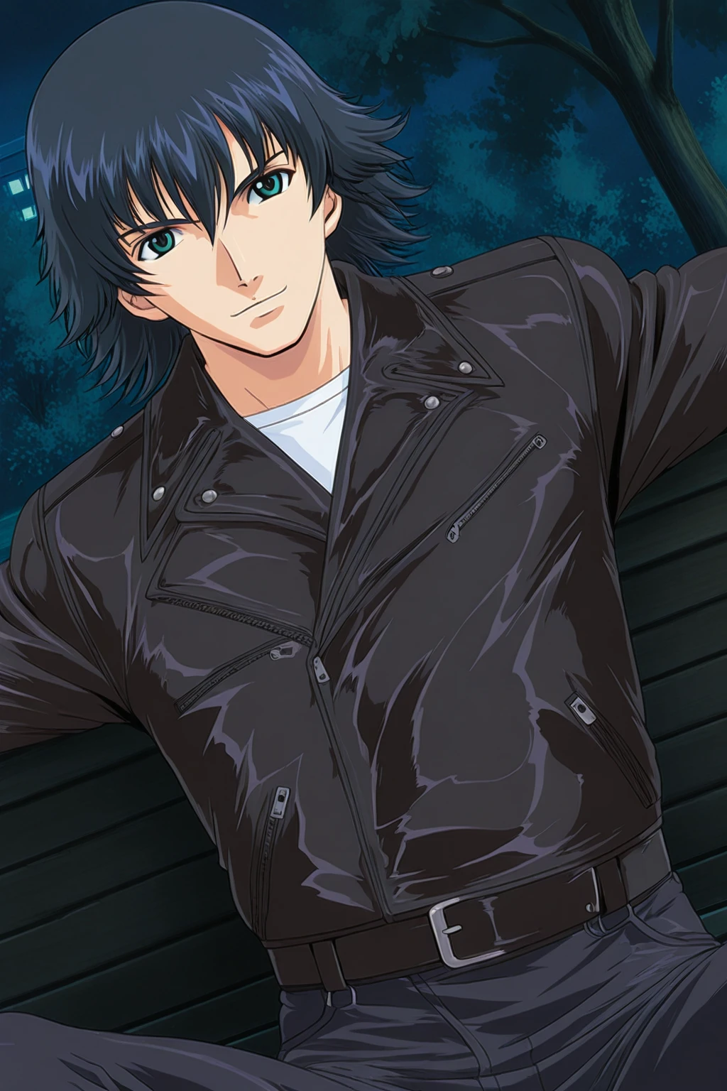 • izyi primegirl,game cg,Kamine Kei,1boy,solo,black hair,short hair,green eyes,black jacket,leather jacket,zipper,long sleeves,black belt,pants,shoes,
