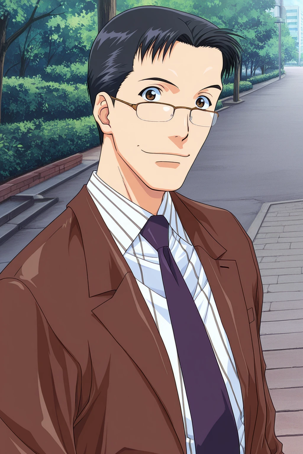 izyi primegirl,game cg,Enomoto Tadasuke,1boy,solo,black hair,short hair,brown eyes,brown-framed eyewear,over-rim eyewear,brown suit,purple necktie,formal,white pinstripe shirt,collared shirt,vertical-striped clothes,brown suit pants,leather shoes,