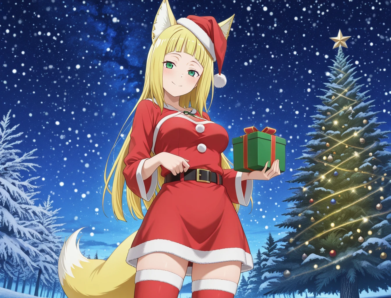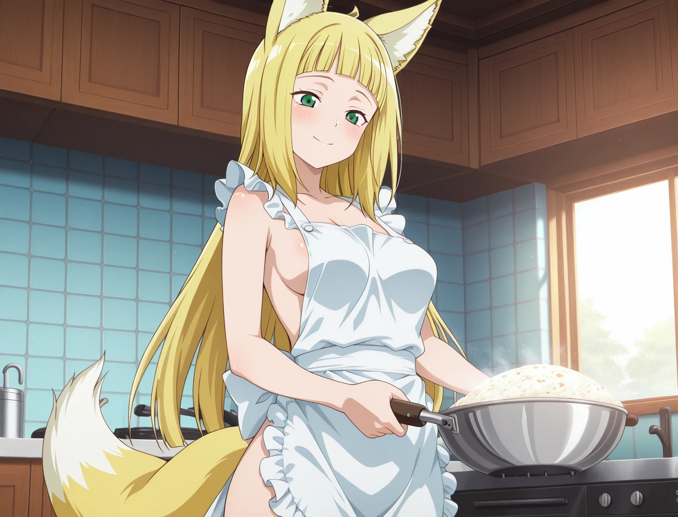 blonde_hair, animal_ears, green_eyes, long_hair, tail, fox_ears, fox_tail, medium_breasts, bangs, very_long_hair, blunt_bangs, fox_girl,