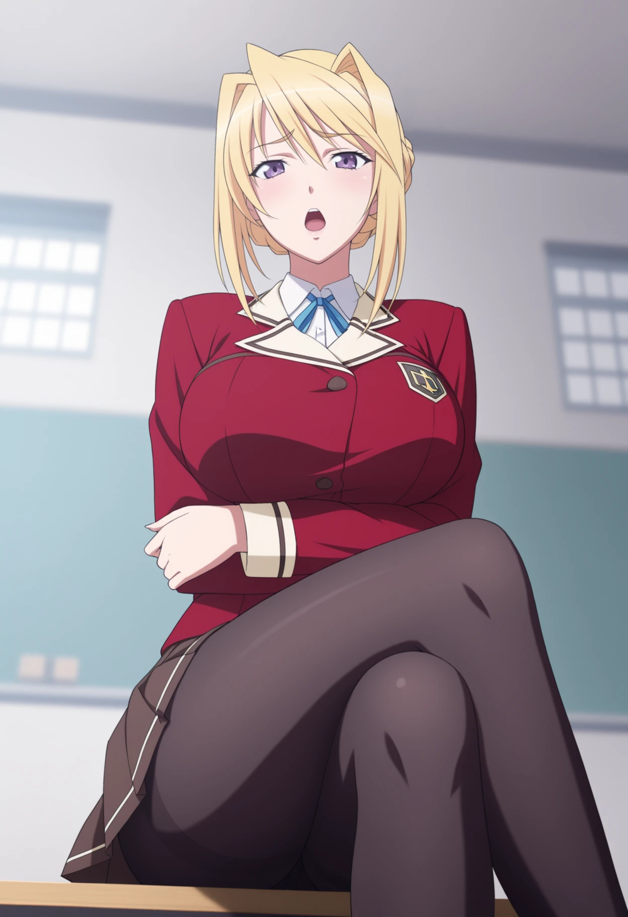 school uniform,red jacket,red blazer,white shirt,collared shirt,neck ribbon,blue ribbon,brown skirt,pleated skirt,pantyhose