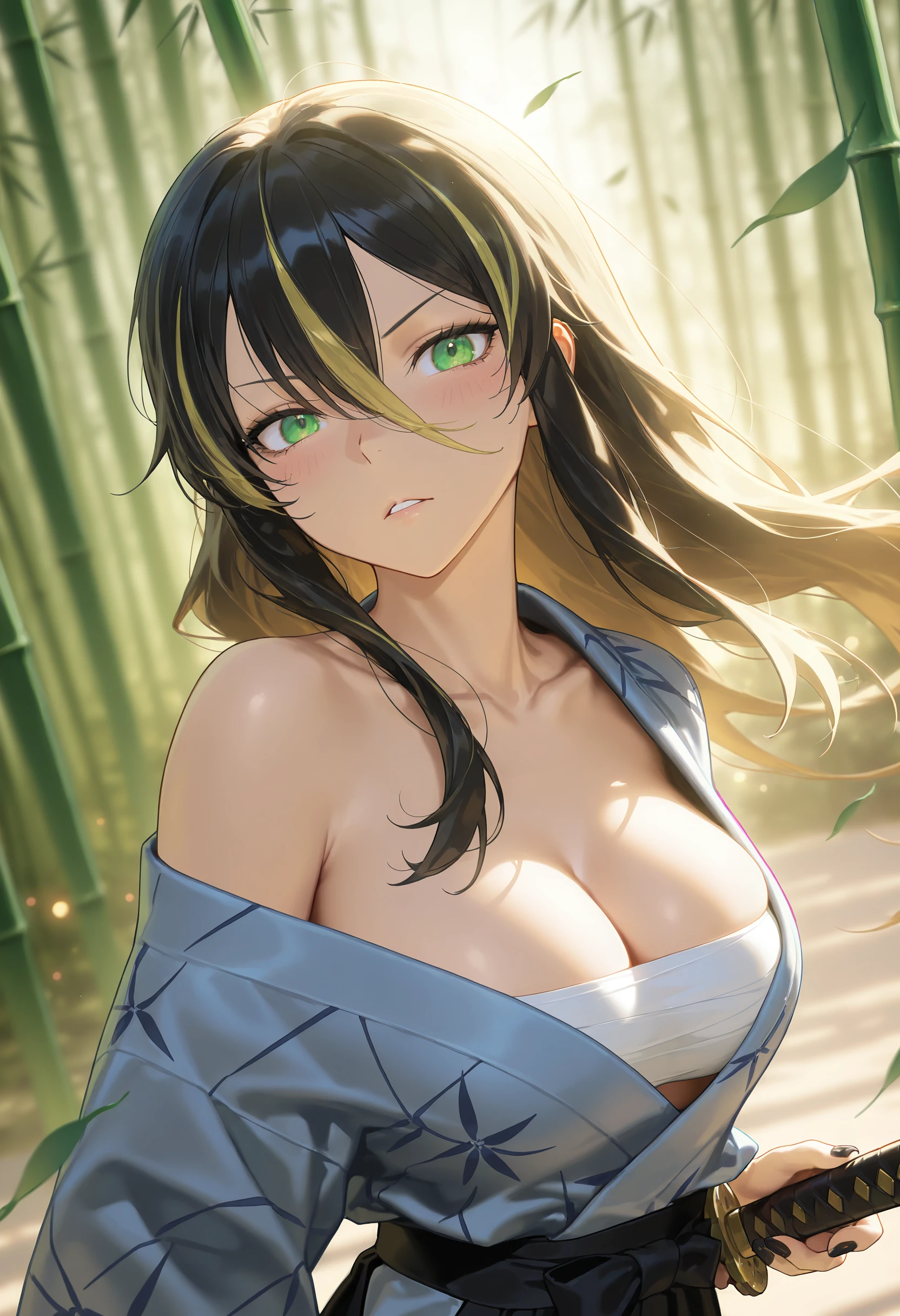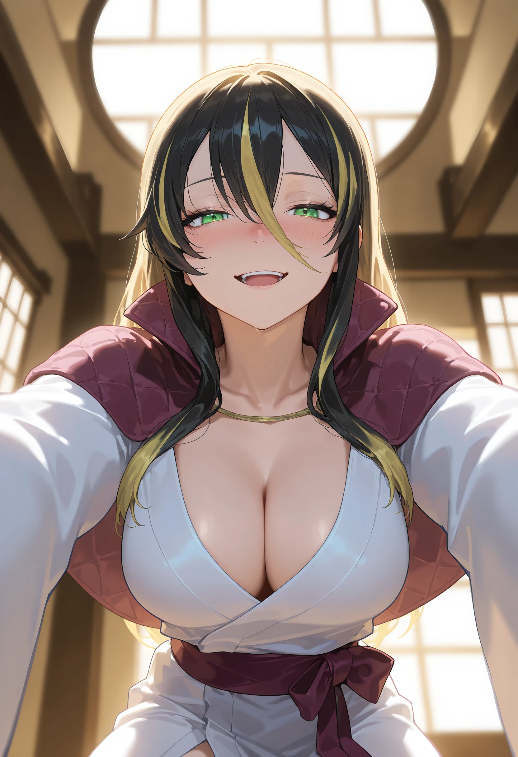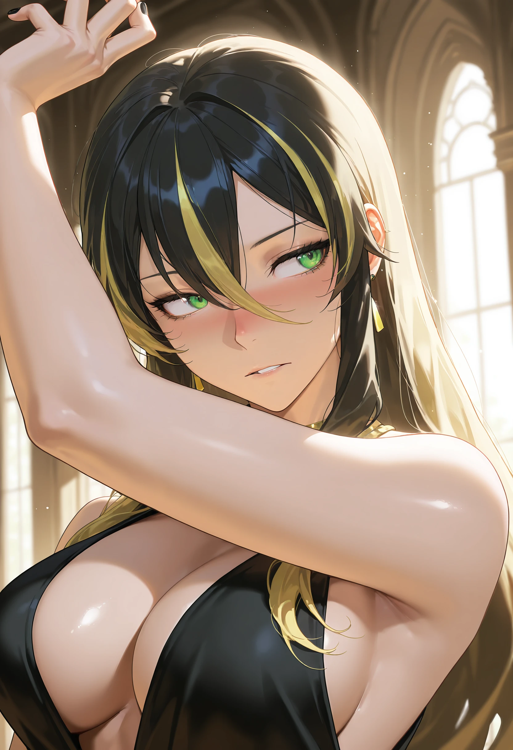 Tags for her look: 1girl, solo, long hair, blonde hair, black hair, hair between eyes, large breasts, green eyes, multicolored hair, sidelocks, nail polish, two-tone hair, streaked hair, fingernails, black nails,