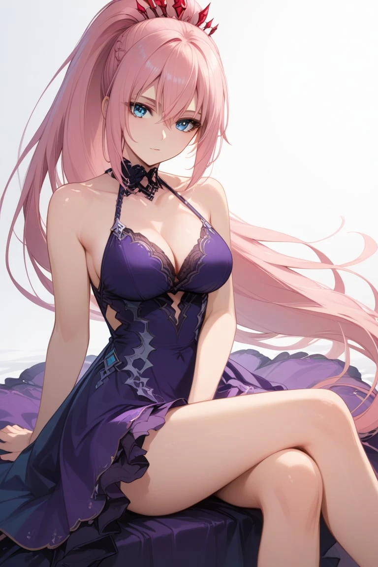 shionne, 1girl, breasts, long hair, dress, pink hair, solo, blue eyes, cleavage, purple dress, looking at viewer, sitting, very long hair, bare shoulders, ponytail, feet out of frame, between legs, bangs, closed mouth, collarbone, sleeveless dress, hair between eyes, sleeveless, halter dress, simple background, hand between legs, bare legs, medium breasts, large breasts, official alternate costume, halterneck