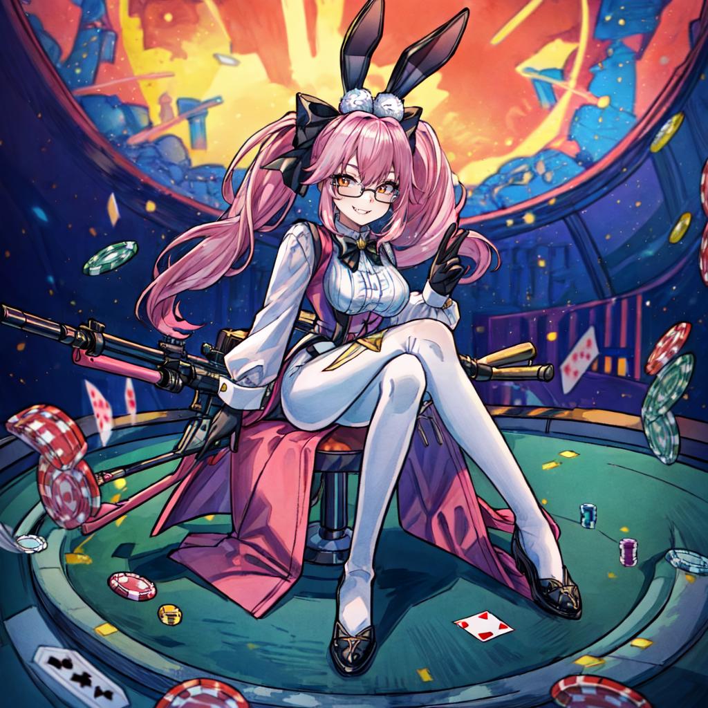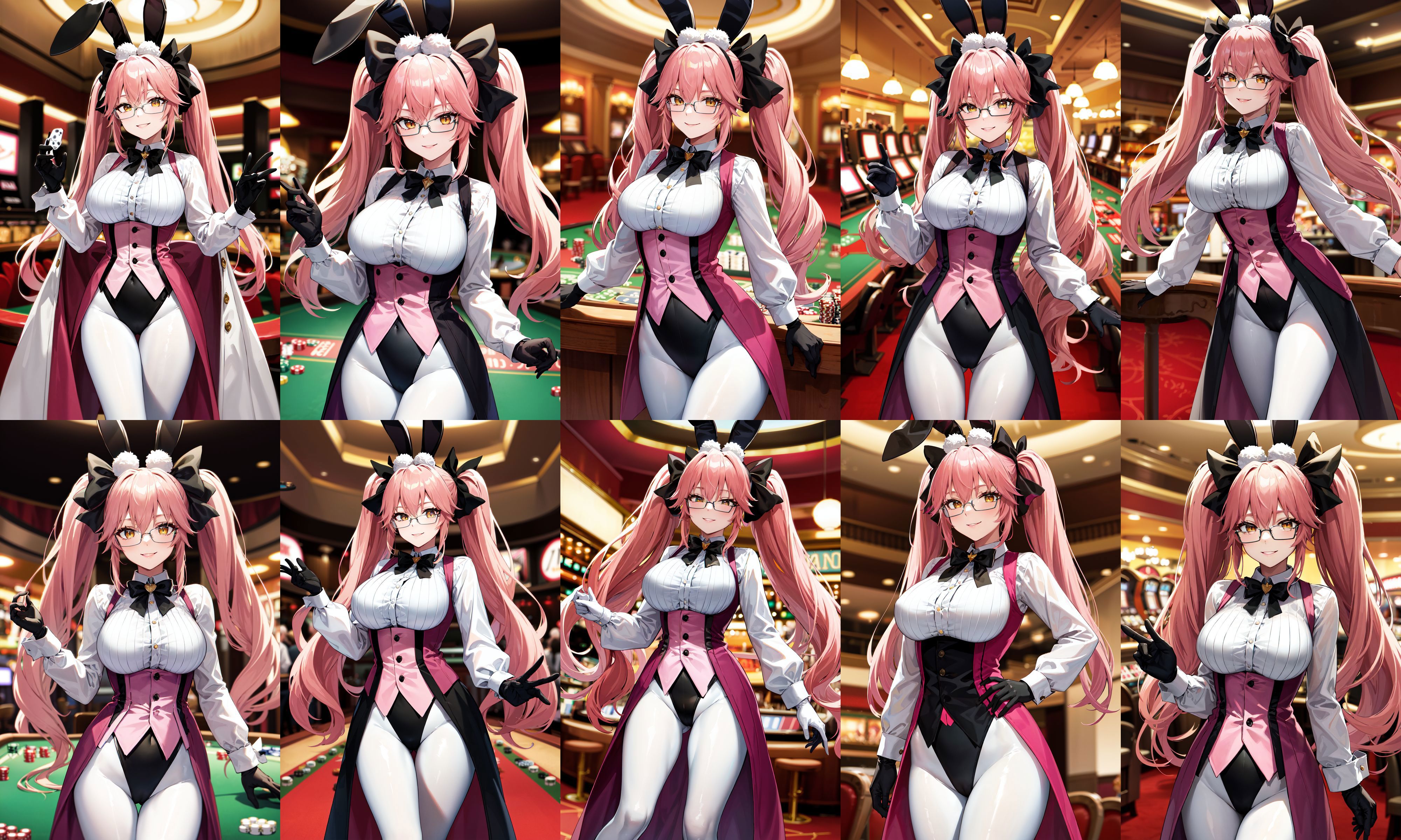 outfit3 (no cloak)cckoyans, long hair, twintails, hair bow, black bow, rabbit ears, glasses, large breasts, collared shirt, white shirt, dress shirt, leotard, long sleeves, black gloves, underbust, corset, coattails, white pantyhose
