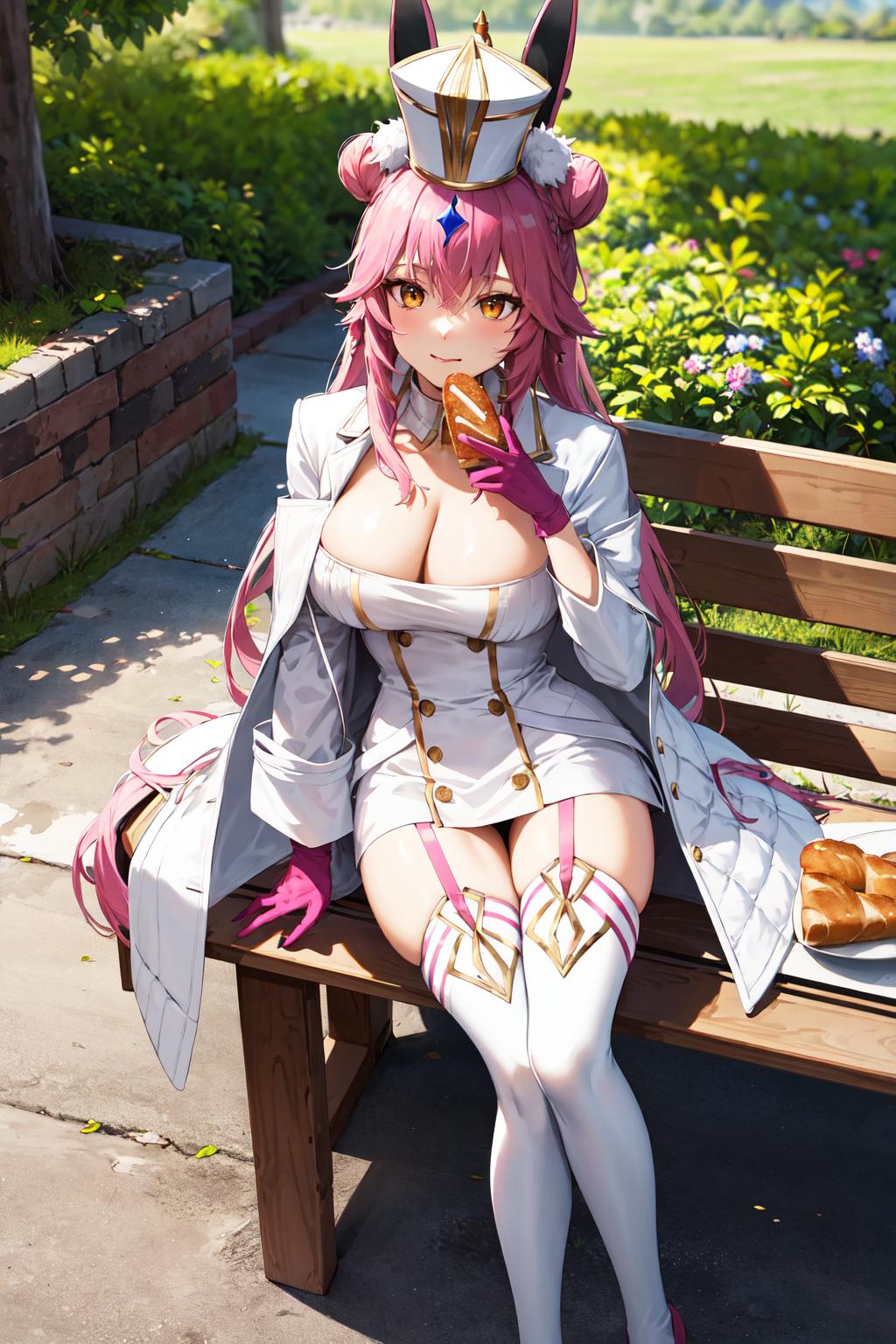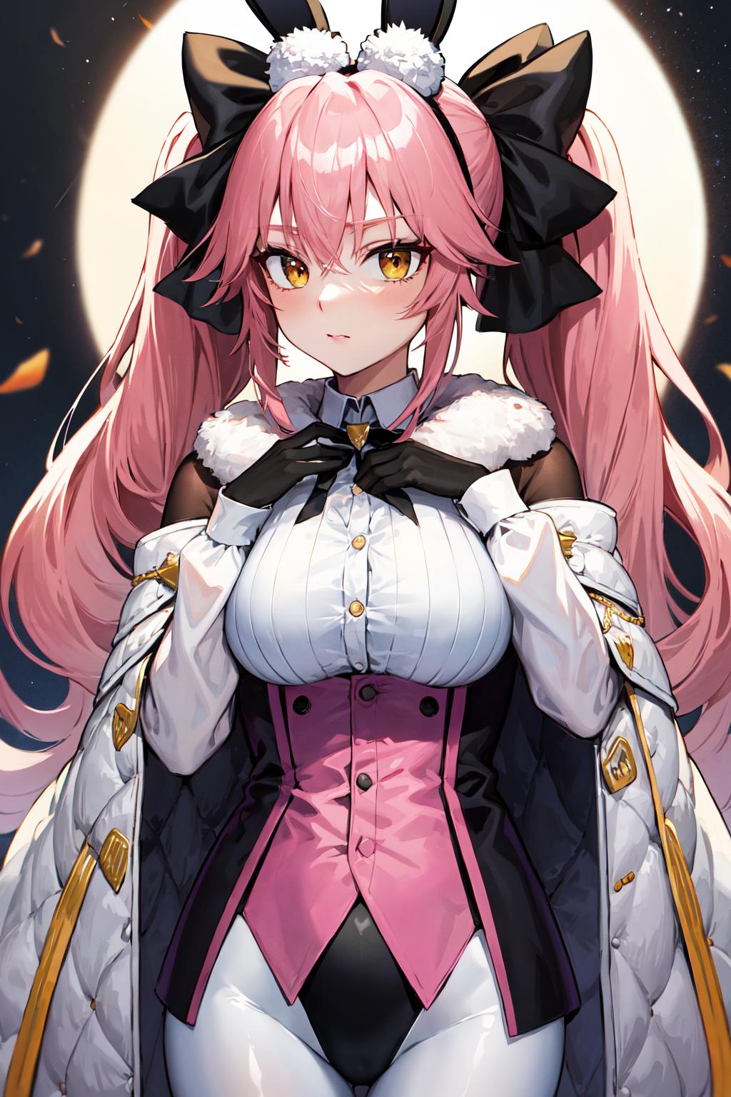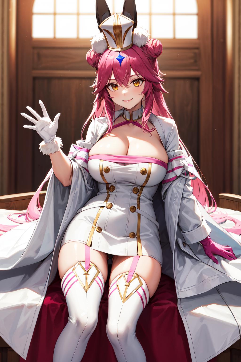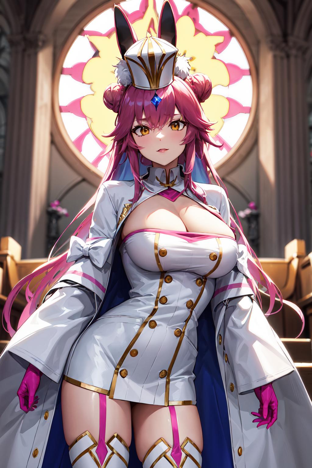 outfit2bbkoyans, long hair, double bun, fox ears, hat, white headwear, cleavage, large breasts, white dress, white coat, open coat, long sleeves, pink gloves, buttons, white thighhighs, garter straps