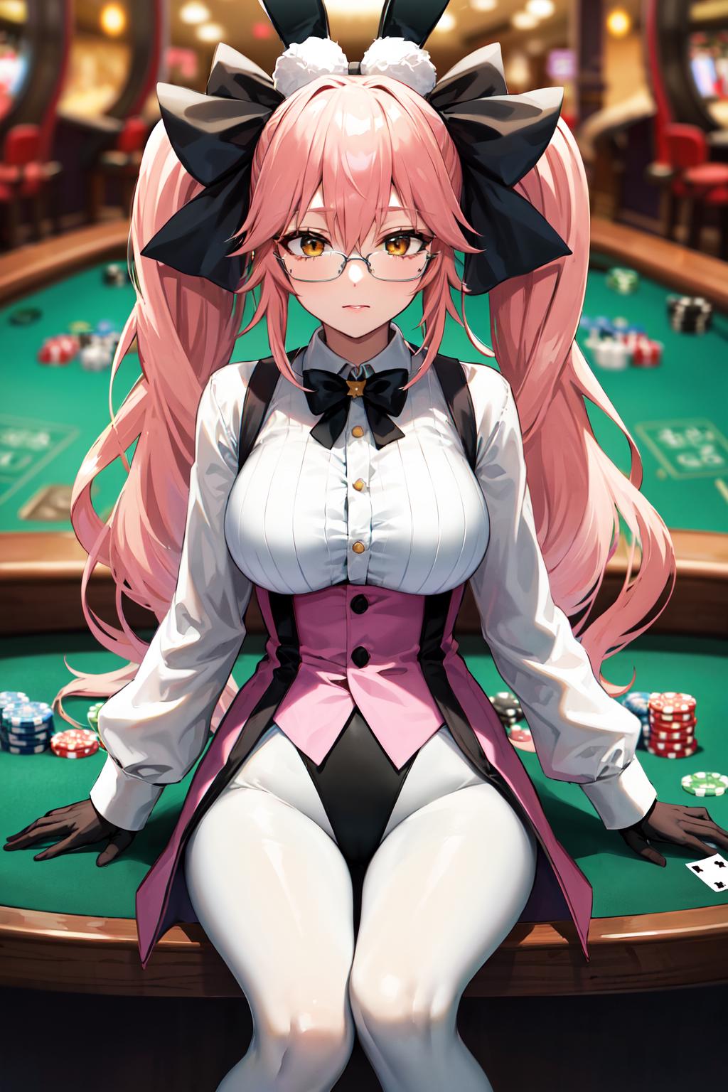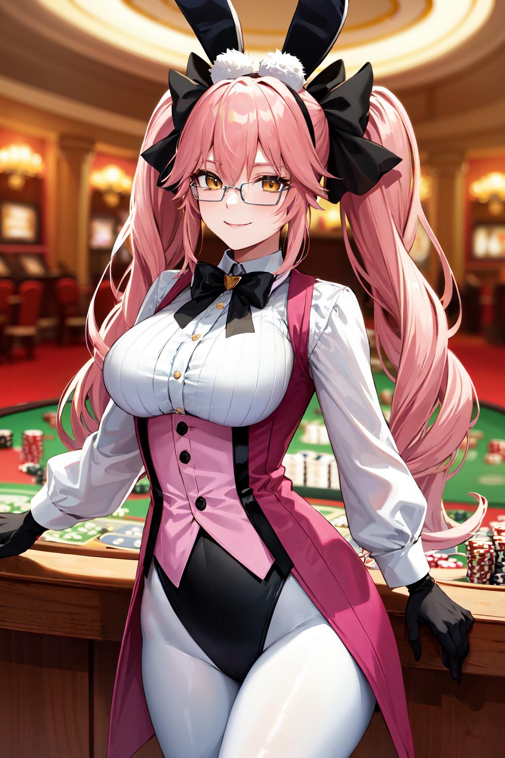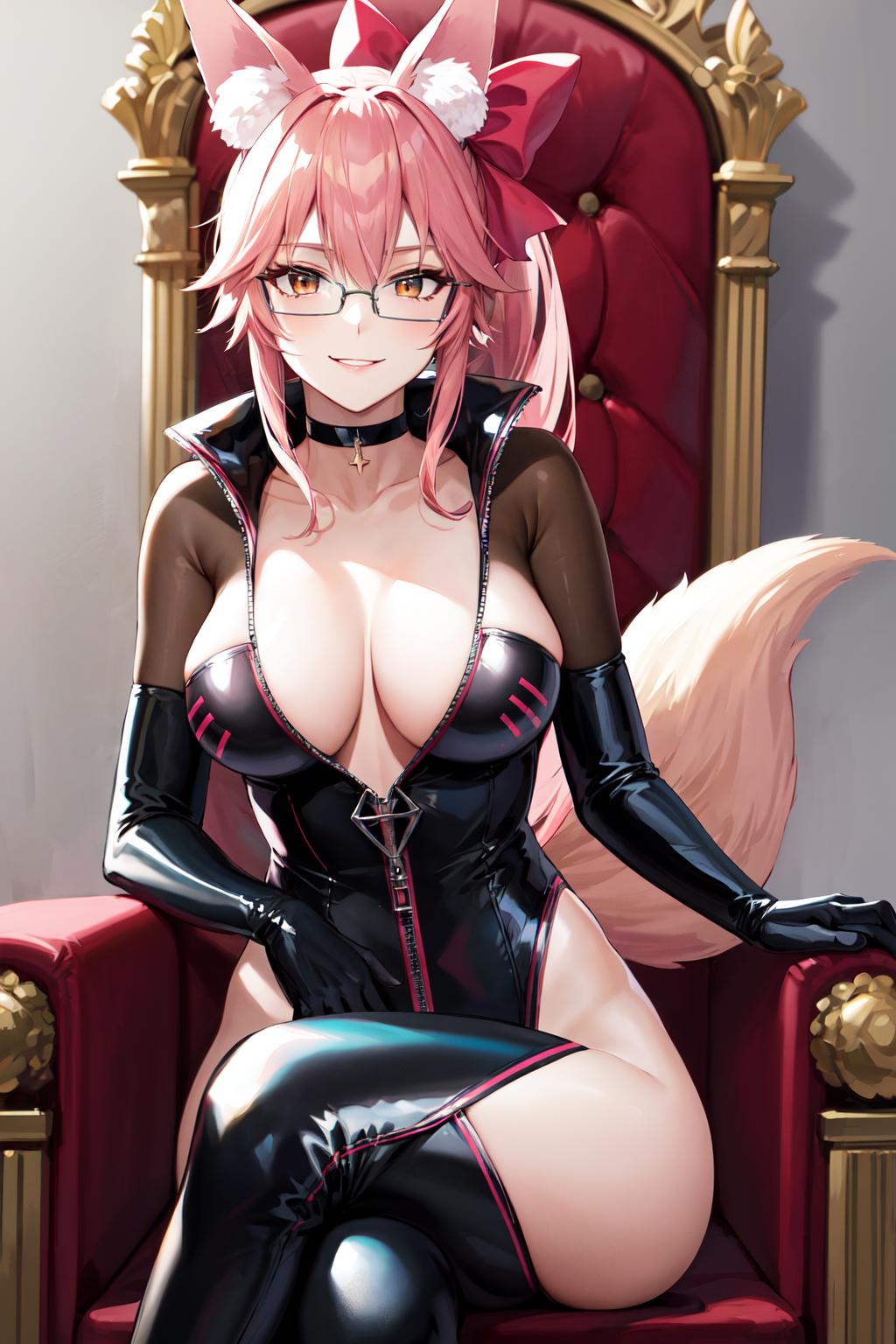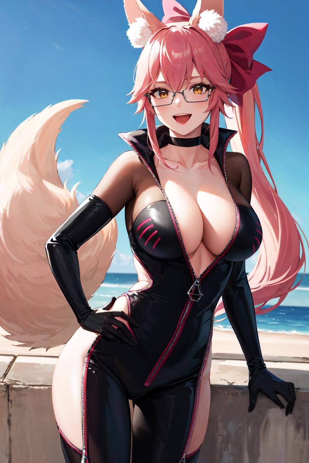 outfit1aakoyans, long hair, ponytail, pink bow, animal ears, glasses, large breasts, fox tail, choker, collarbone, cleavage, black bodysuit, see-through sleeves, long sleeves, black gloves, elbow gloves, hip vent