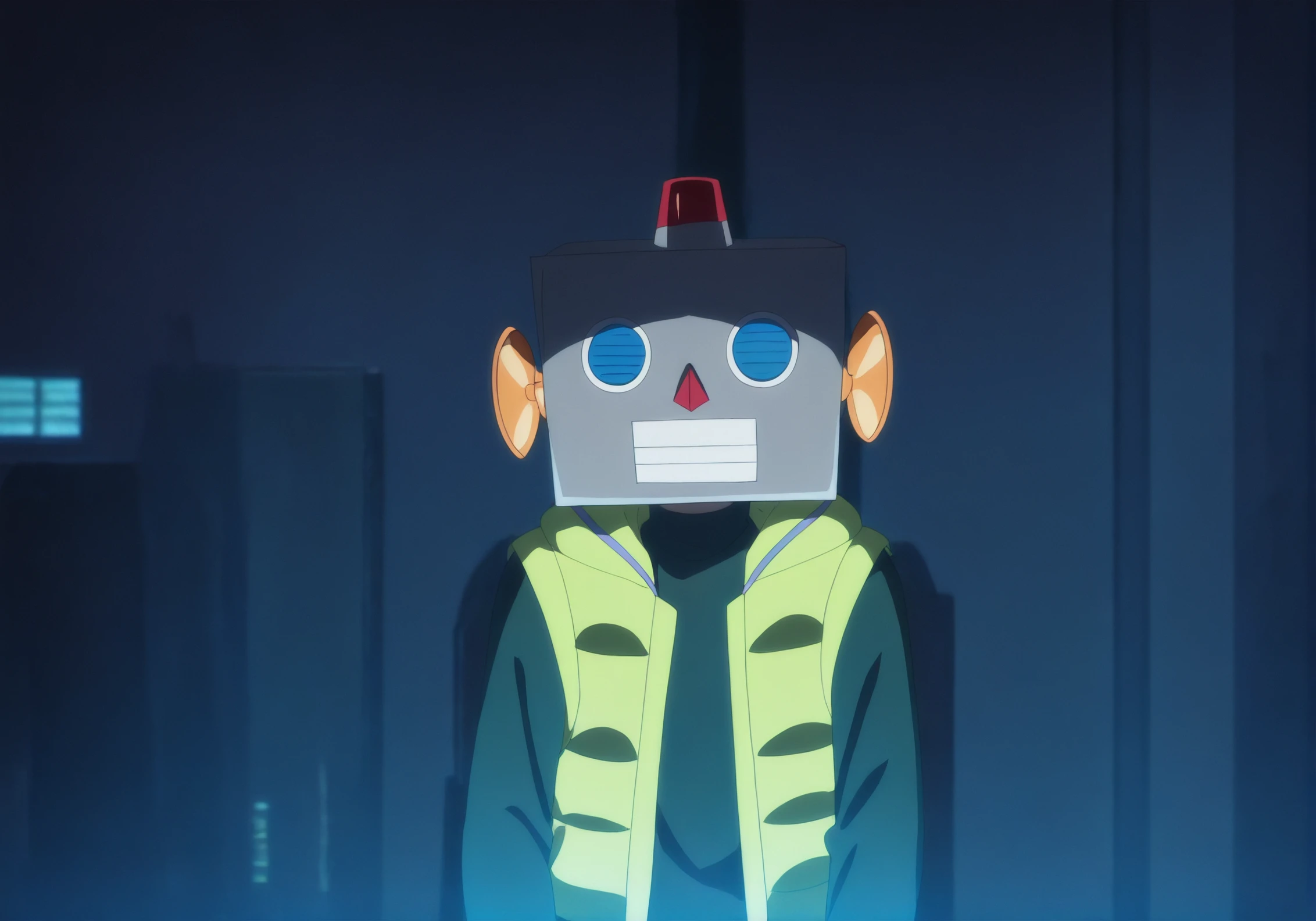 robotaV1, 1boy, robot head, box head, siren, blue eyes, orange ear discs, green puffer vest