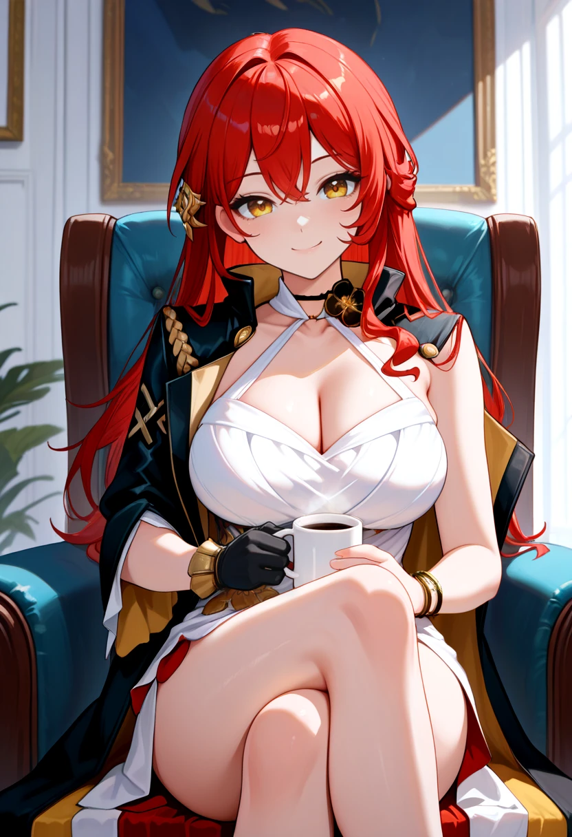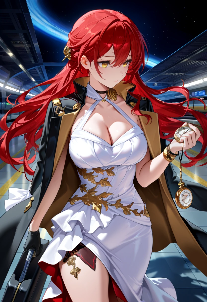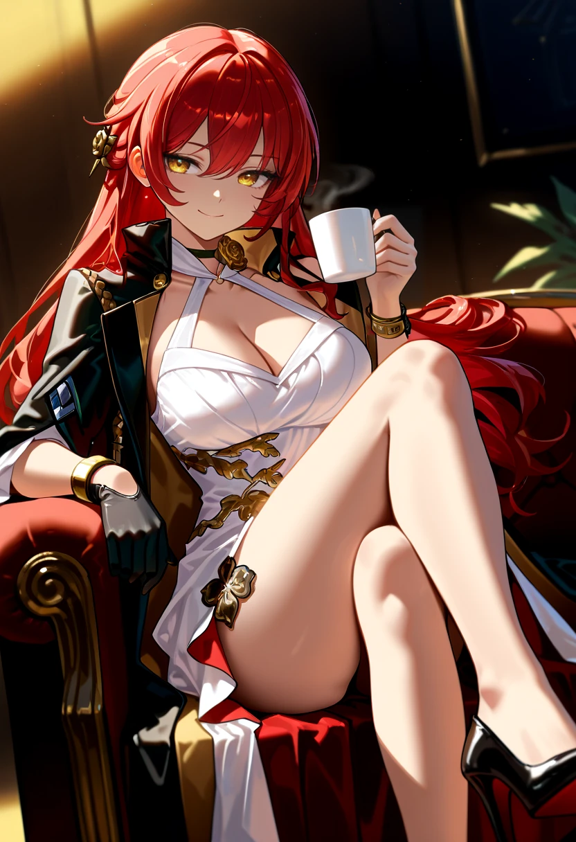 Prompt: mlHimepdxl, white dress, single glove, red trim, halterneck, hair ornament, gold trim, gold bracelet, black high heels, black gloves, black coat, red hair, long hair, yellow eyes,