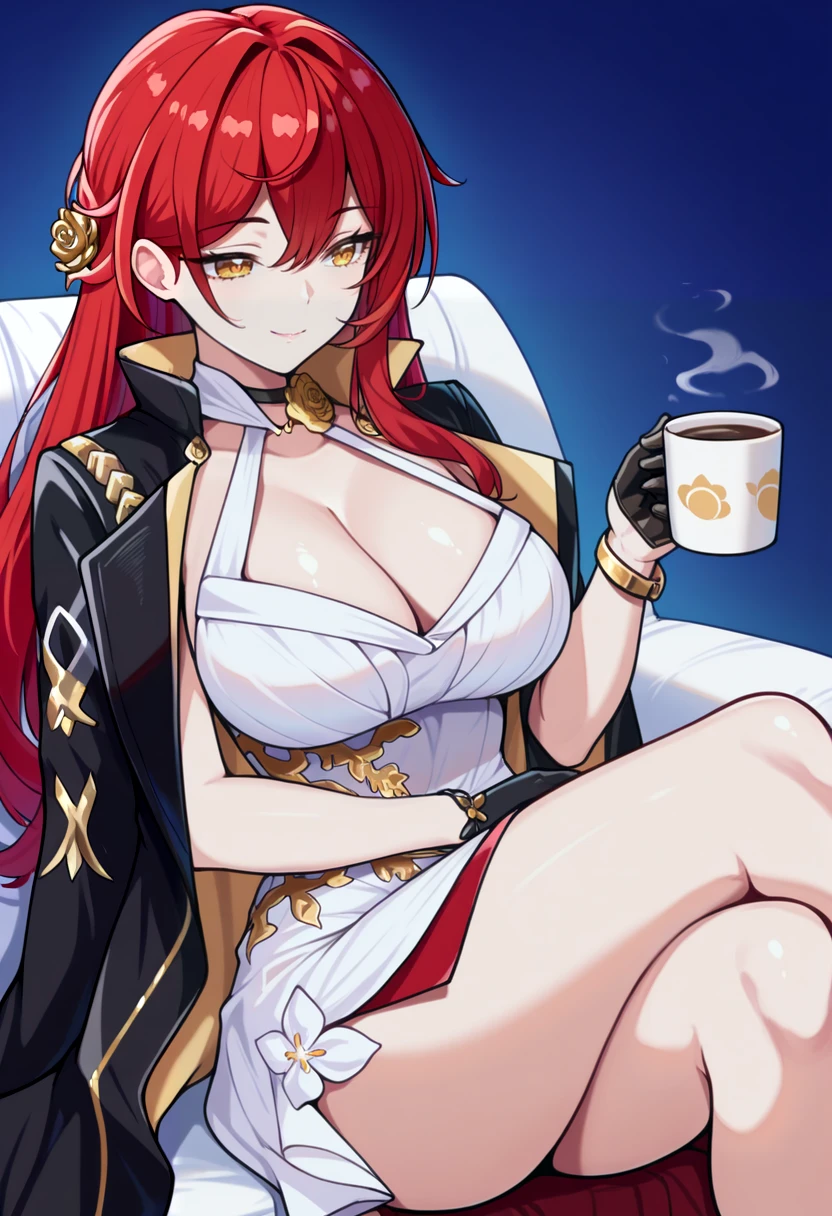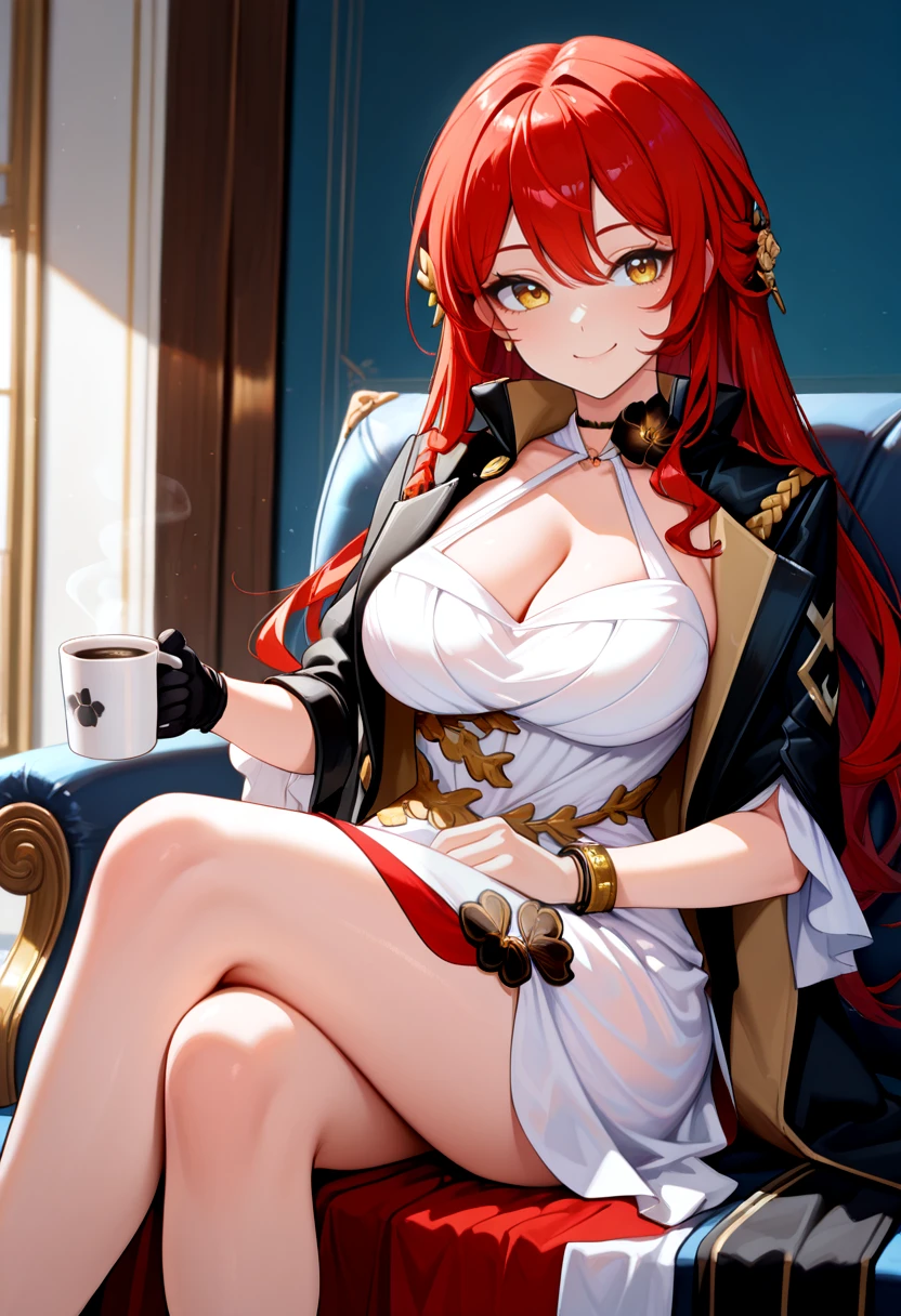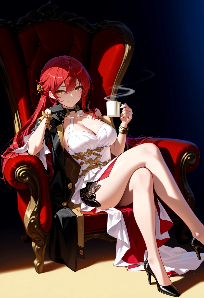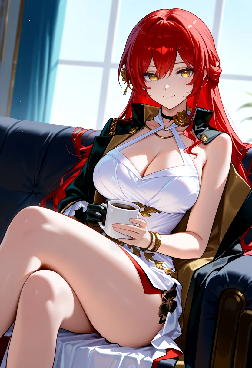 Prompt: mlHimepdxl, white dress, single glove, red trim, halterneck, hair ornament, gold trim, gold bracelet, black high heels, black gloves, black coat, red hair, long hair, yellow eyes,