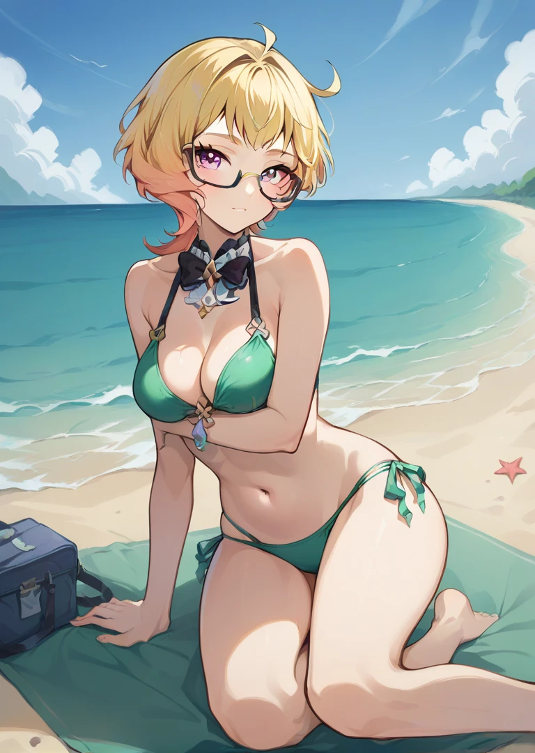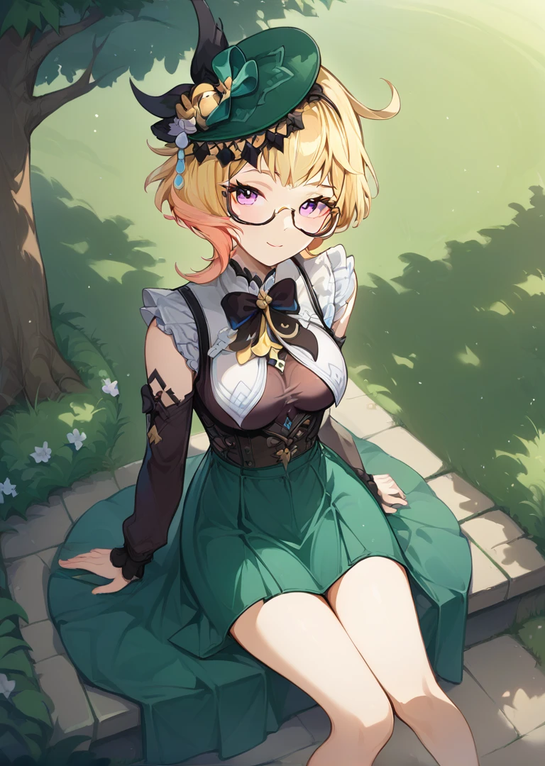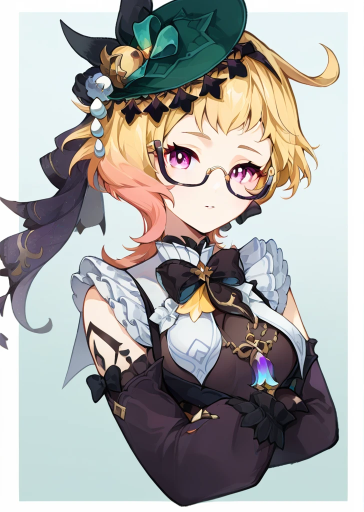 EmilieGI, short hair, blonde hair, purple eyes, multicolored hair, glasses, hat,