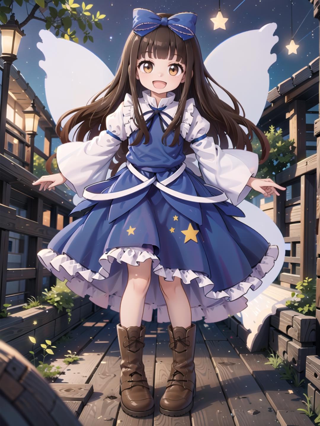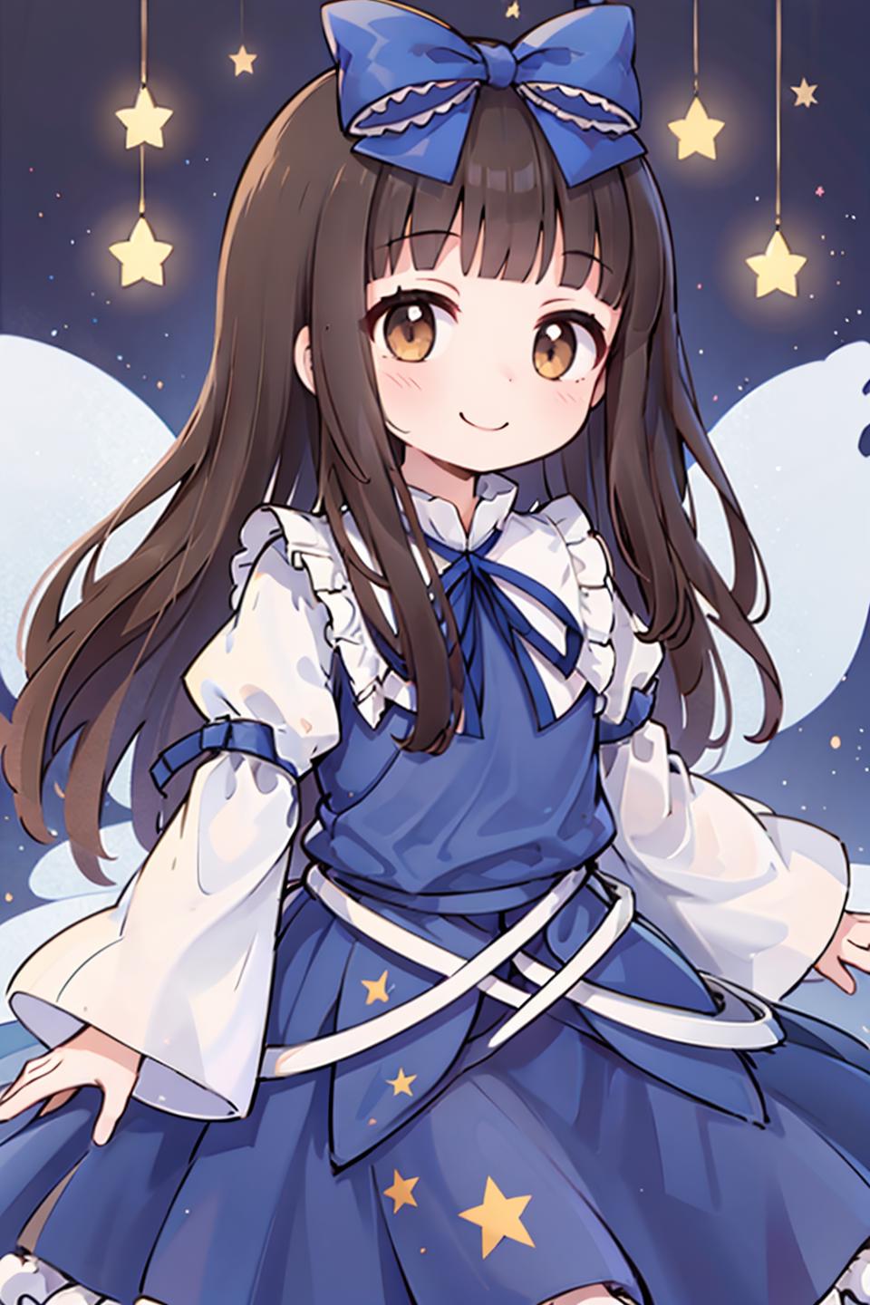 Recommended words(Improves reproducibility): brown eyes, blue dress, star dress,star \(symbol\), brown hair