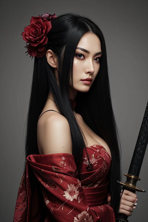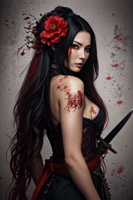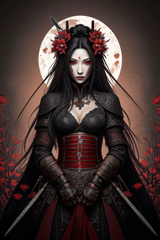 The concept presented revolves around the depiction of "onna-bugeisha," a term referring to women warriors in Japanese history, rendered in the Colorful Japanese Wood Print style