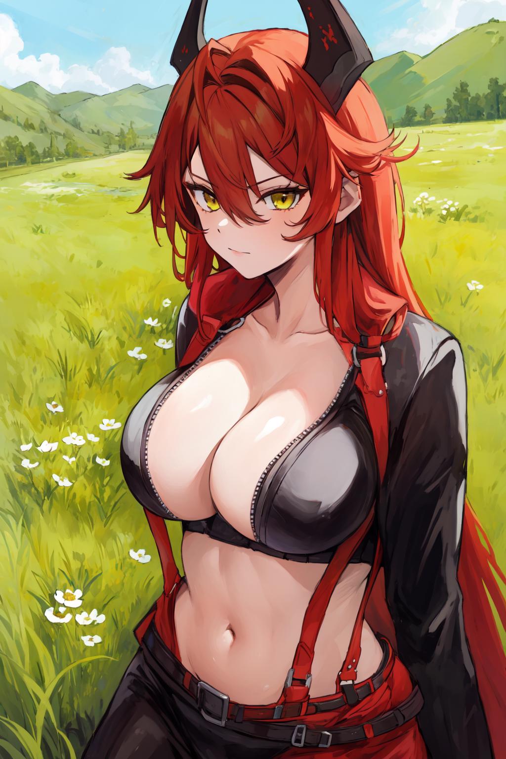 Trigger Words: redhood, long hair, red hair, large breasts, navel, horns, mechanical horns, antenna hair, belt, gloves, jacket, leather pants, red scarf, unzipped, hip vent
