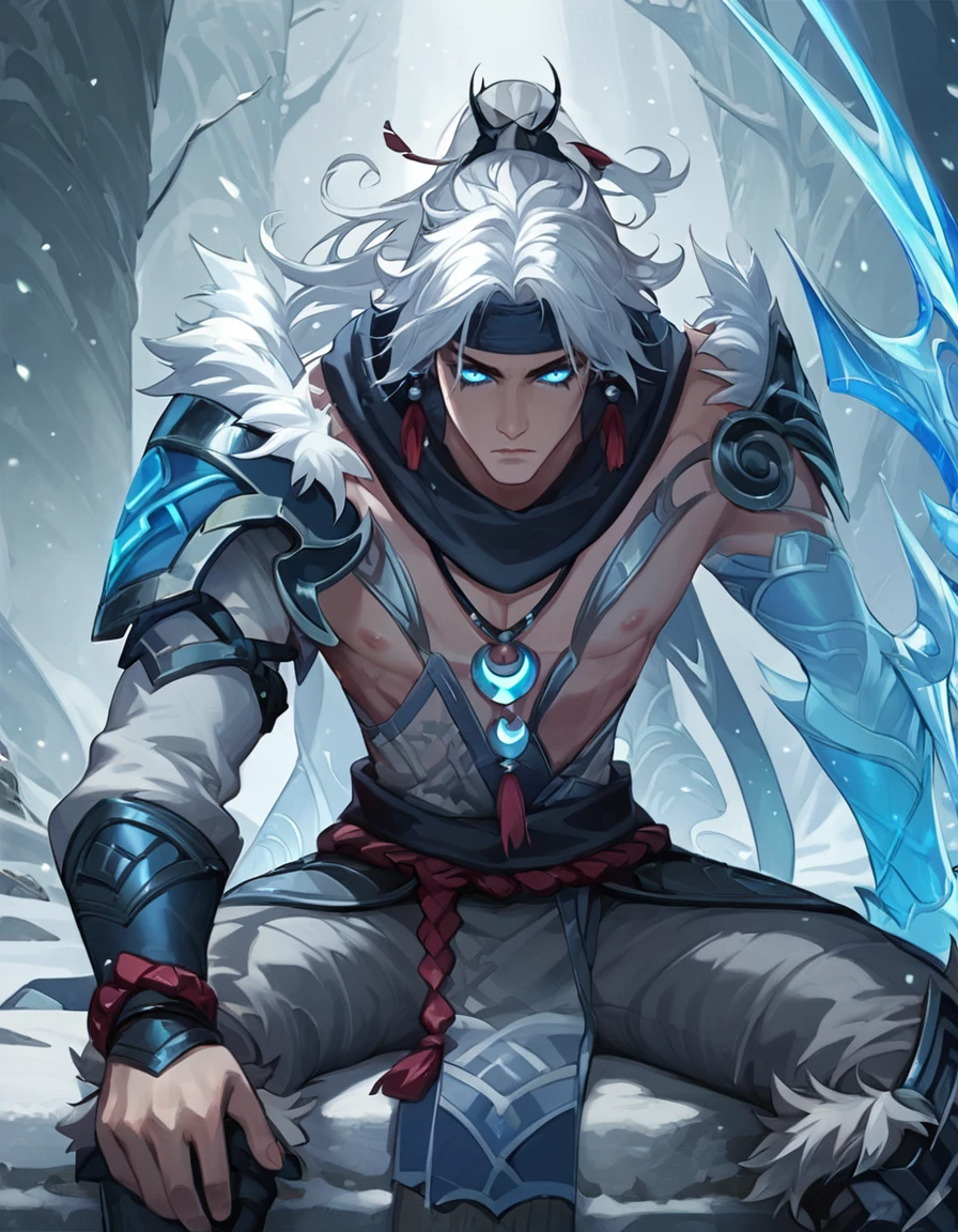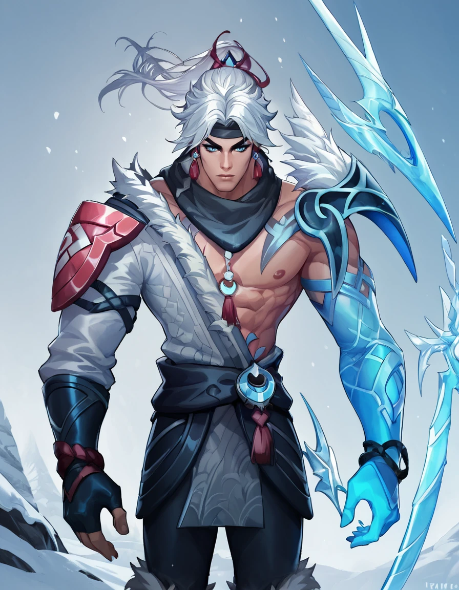 Tags: Snow_Moon_Varus, solo, bangs, blue eyes, gloves, 1boy, jewelry, standing, jacket, ponytail, white hair, male focus, earrings, alternate costume, pants, fingerless gloves, armor, official alternate costume, fur trim, muscular, glowing, black pants, muscular male, shoulder armor
