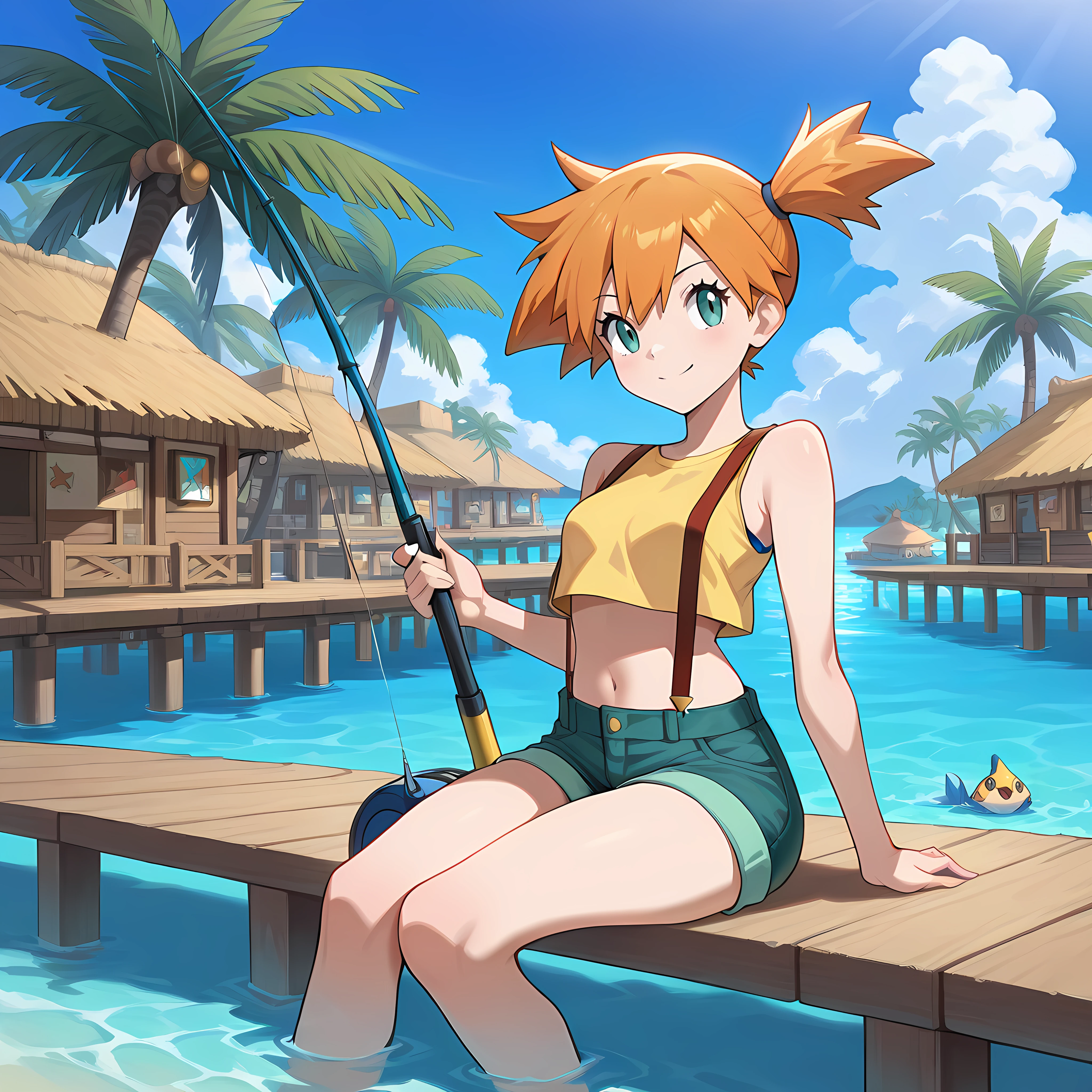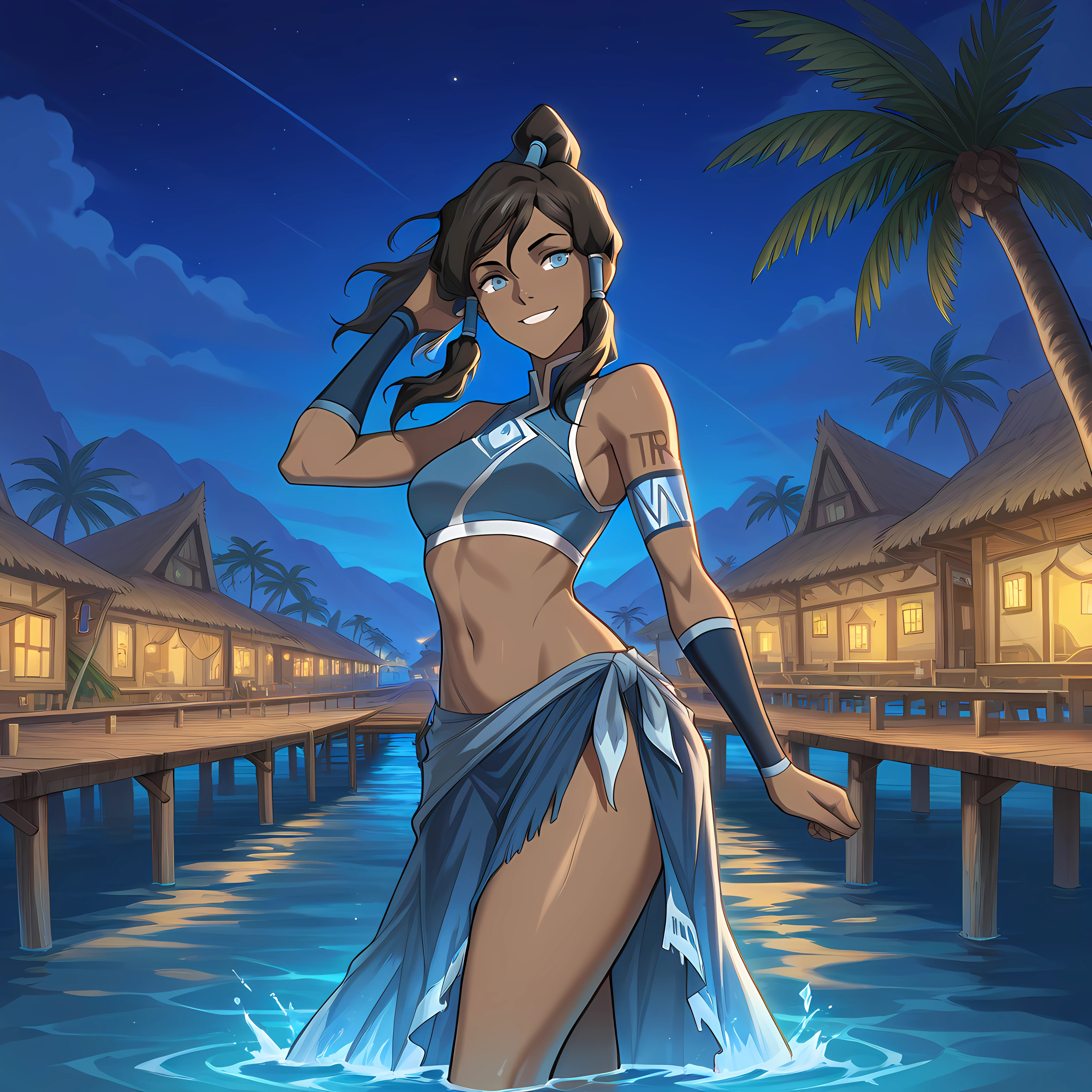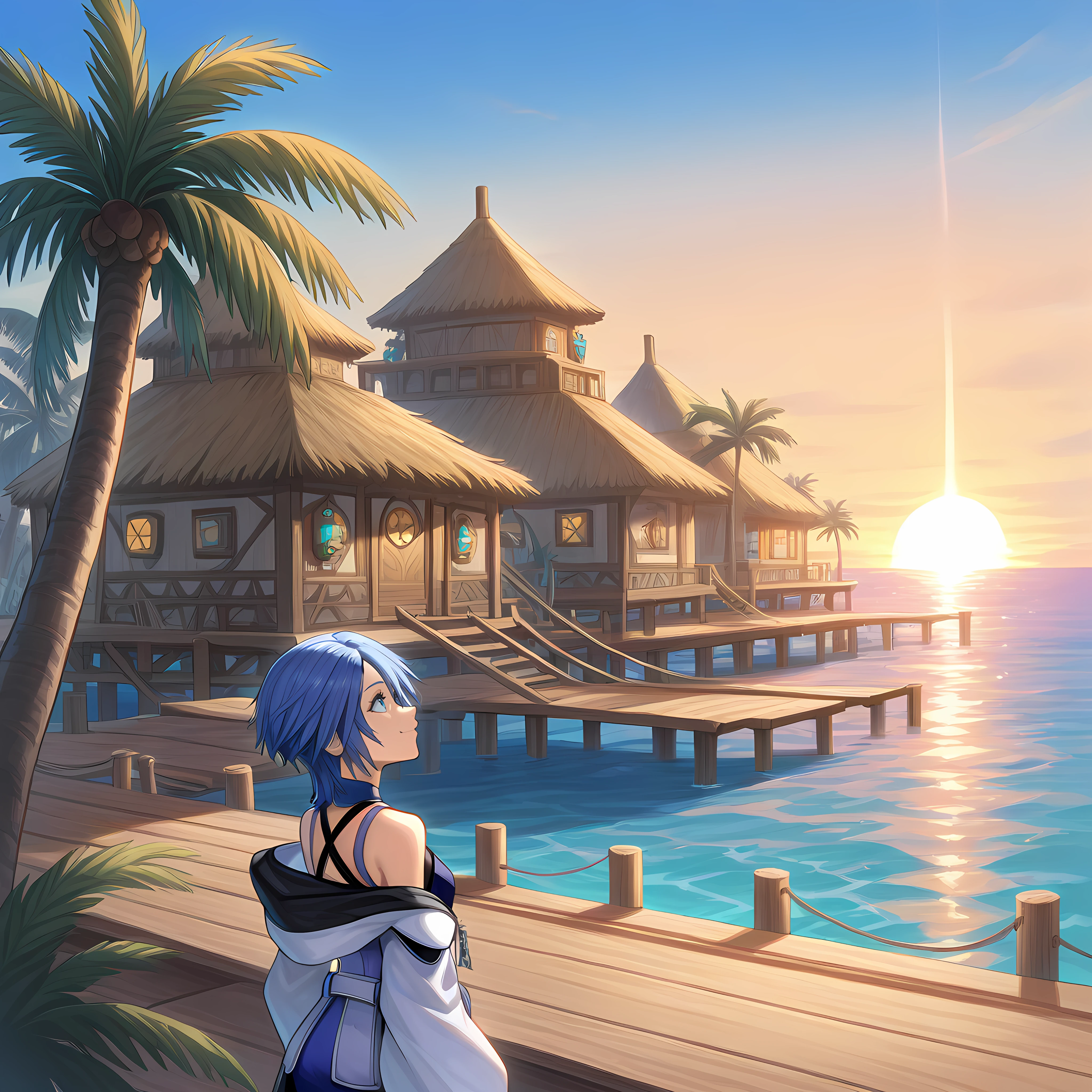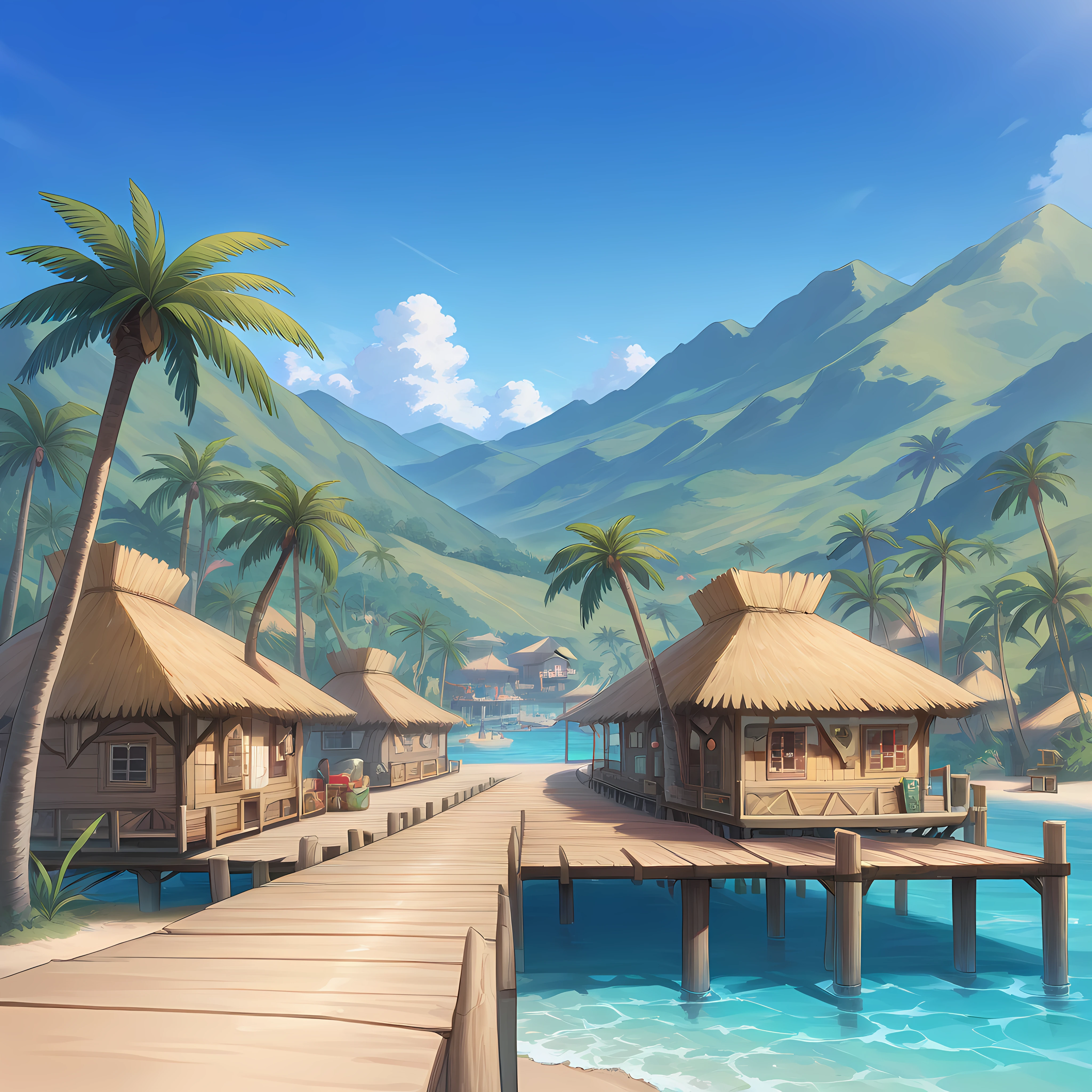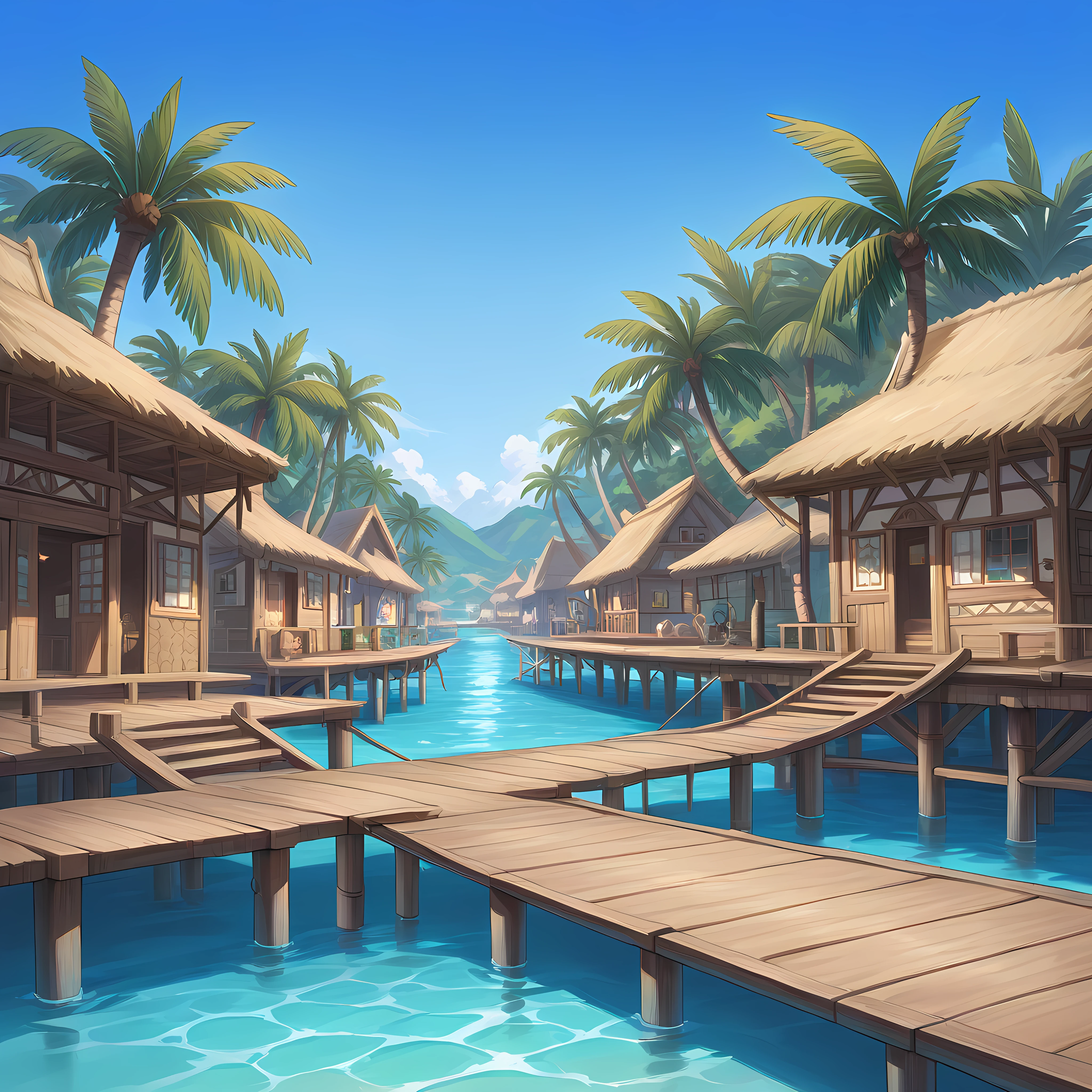 outdoors, water, palm tree, blue sky, thatch roof, tropical village, pier, stilt house