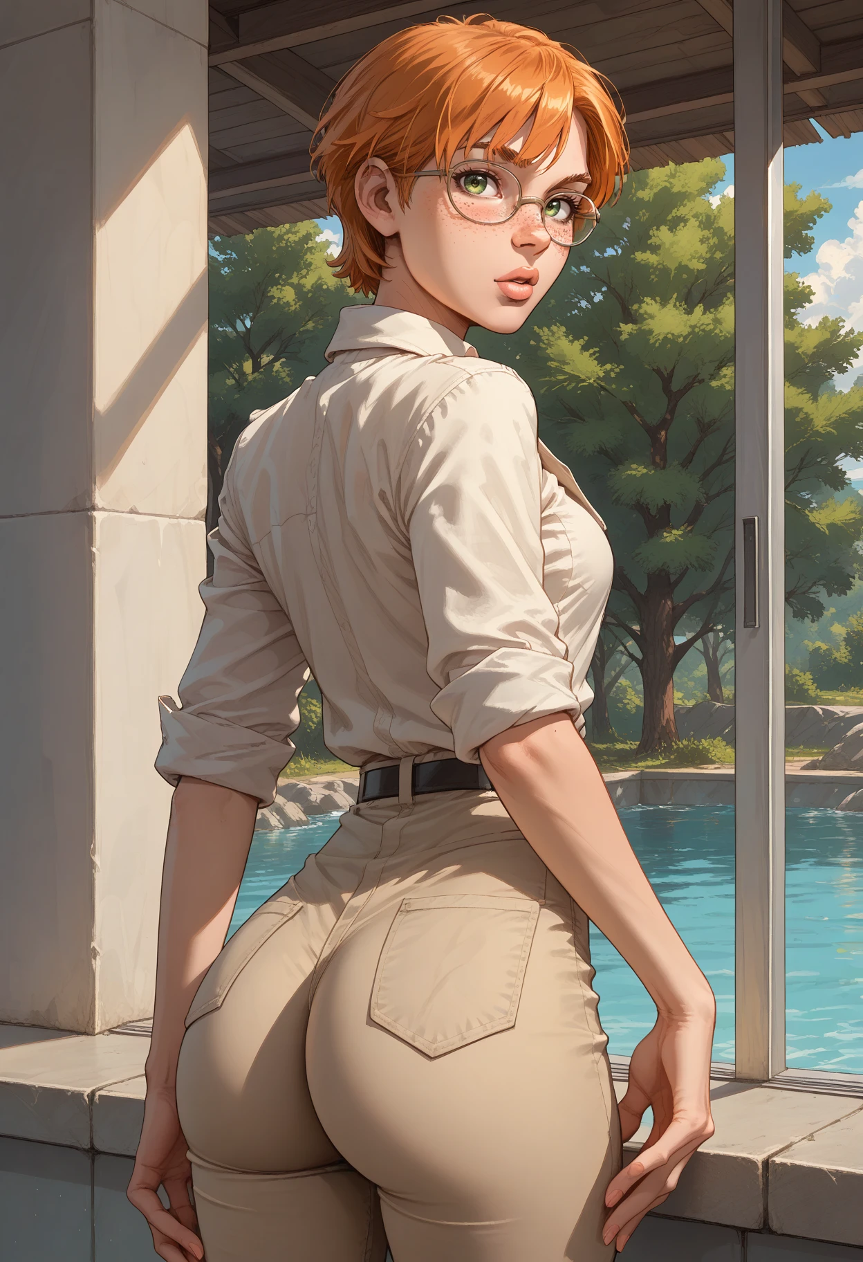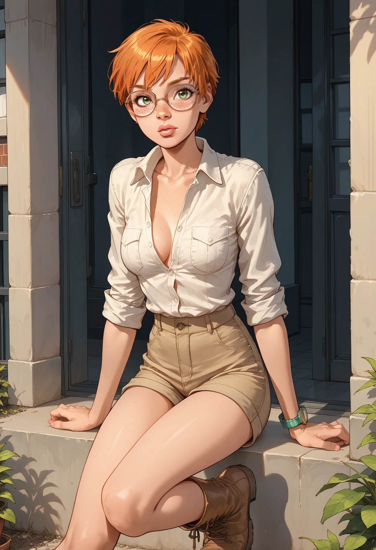 recommended tags: solo, 1girl, short hair, orange hair, freckles, green eyes, lips, breasts, glasses, collared shirt, shirt, shorts, sleeves rolled up, boots, jacket,