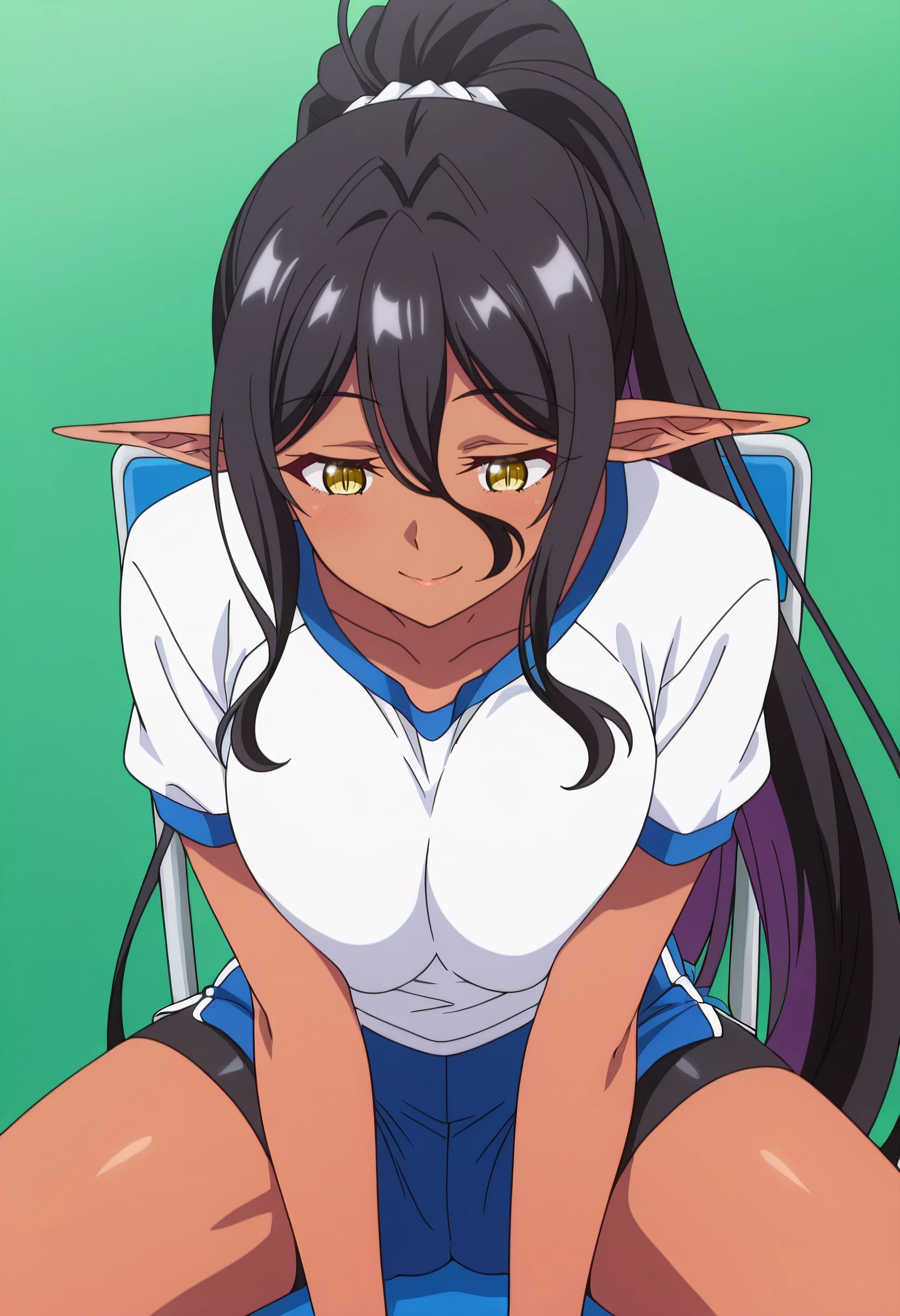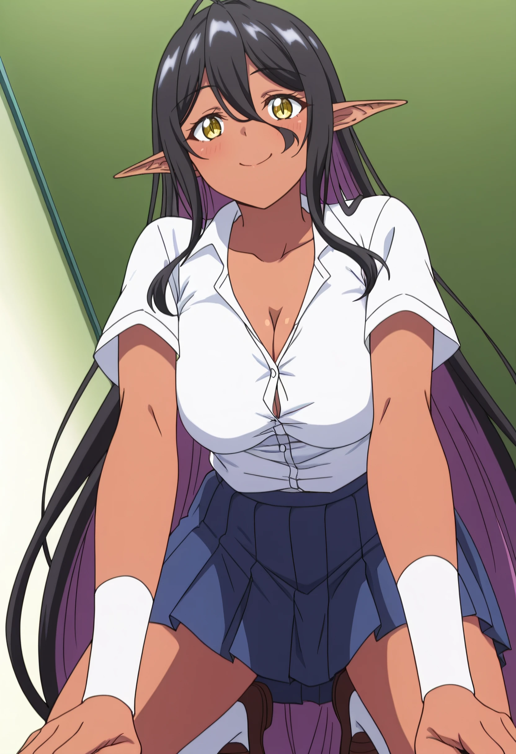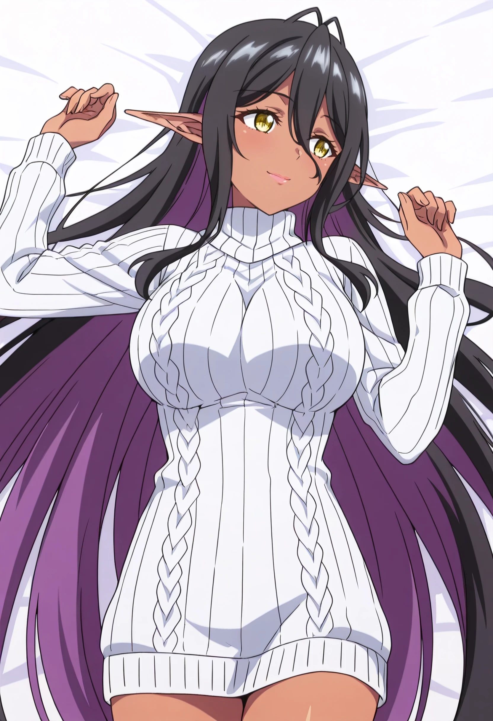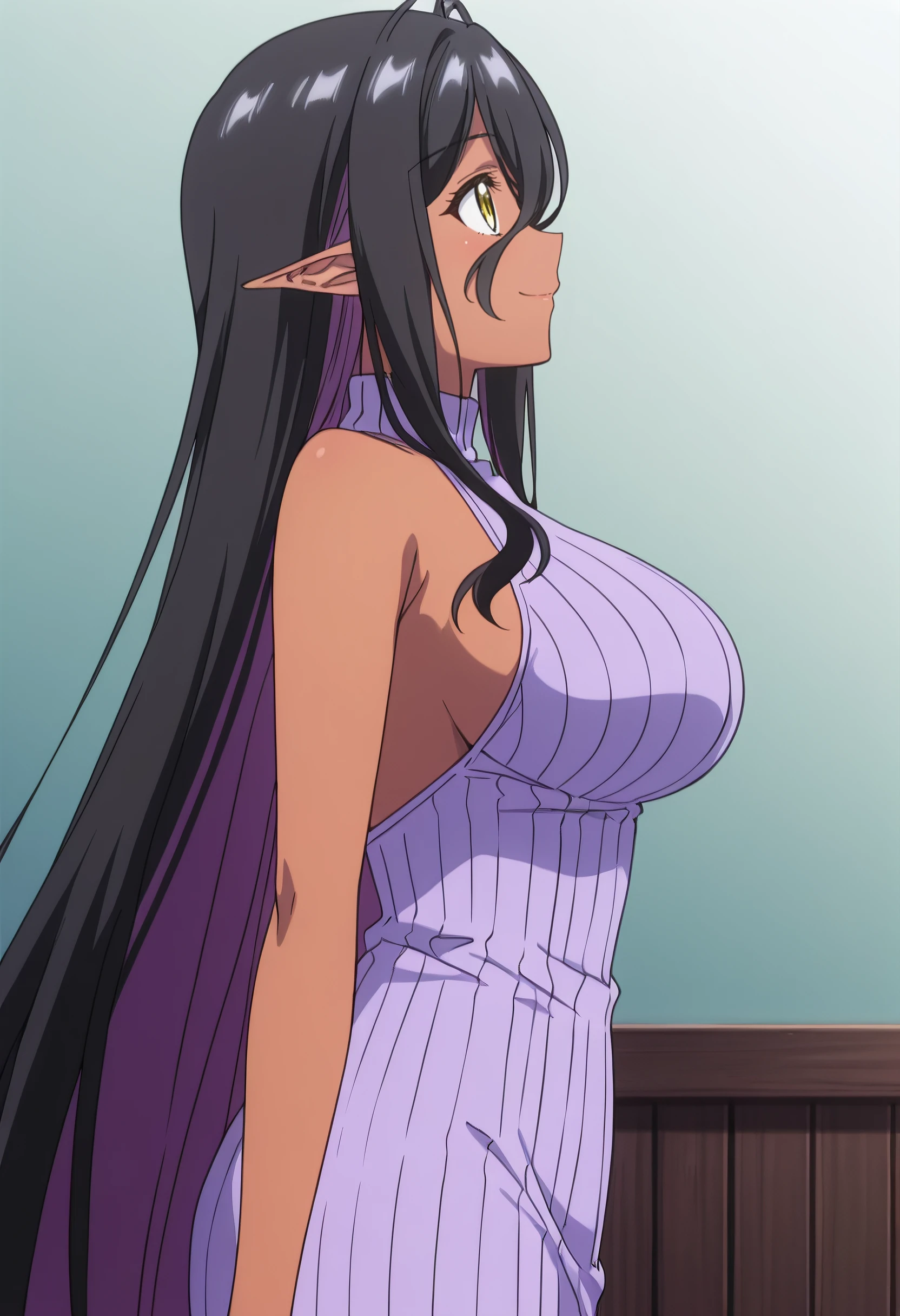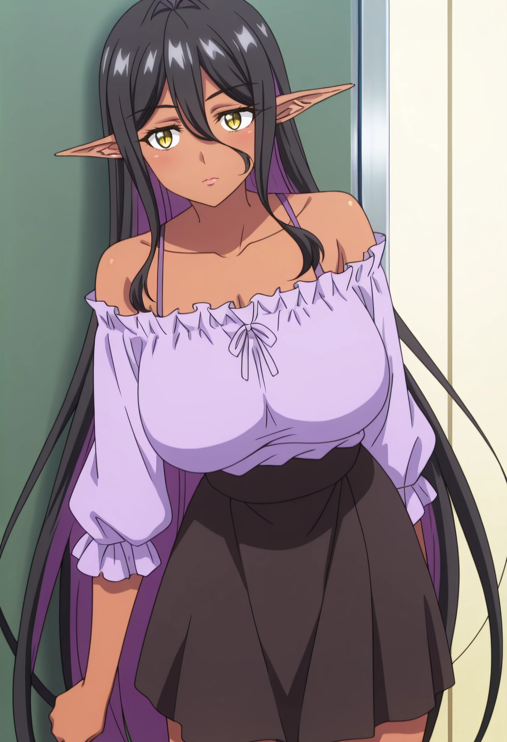 YDEMariabelle, elf, dark elf, dark skin, dark-skinned female, long hair, black hair, pointy ears, yellow eyes, hair between eyes, long pointy ears, very long hair,