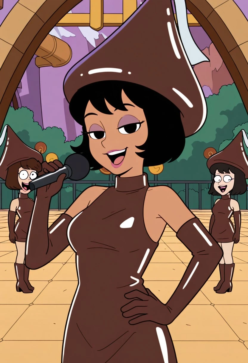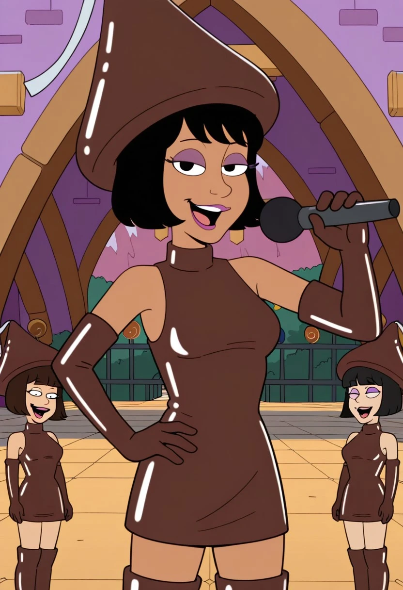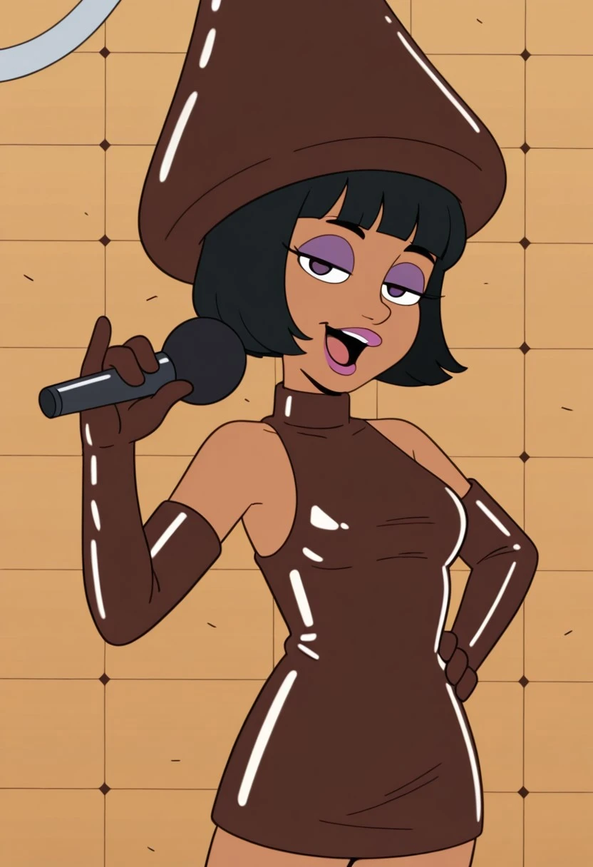 Hershy_ad, 1girl, solo, black hair, short hair, purple eyelashes, lipstick, makeup, chocolate hat, dark skin, dark-skinned female