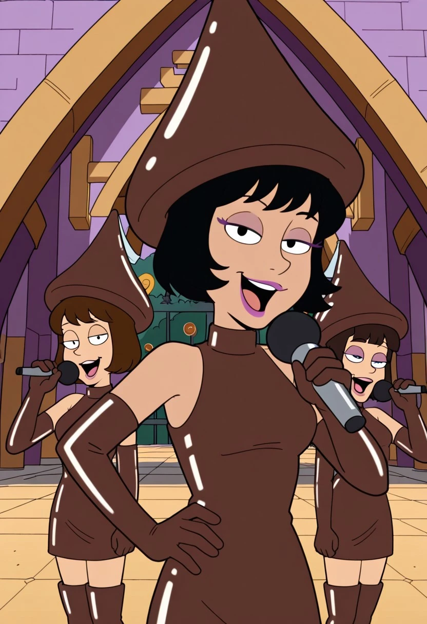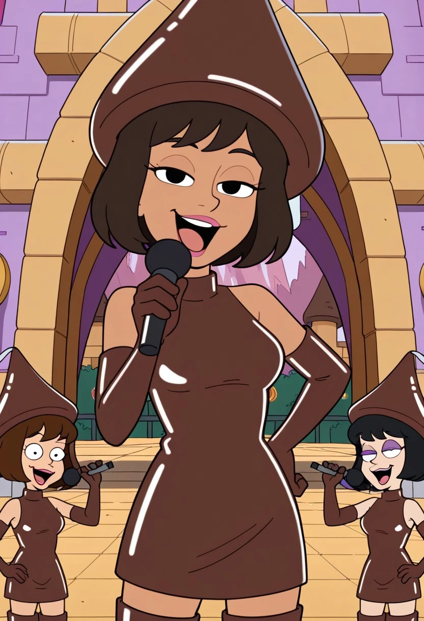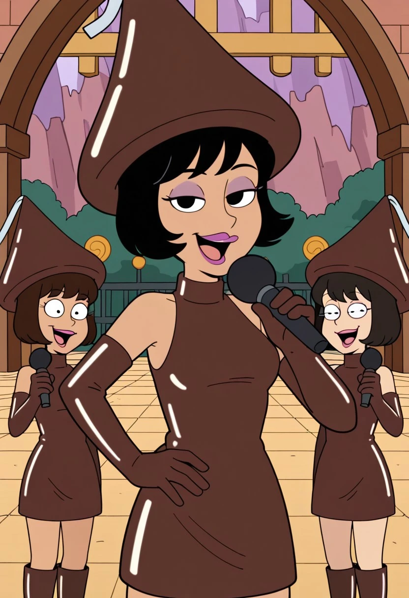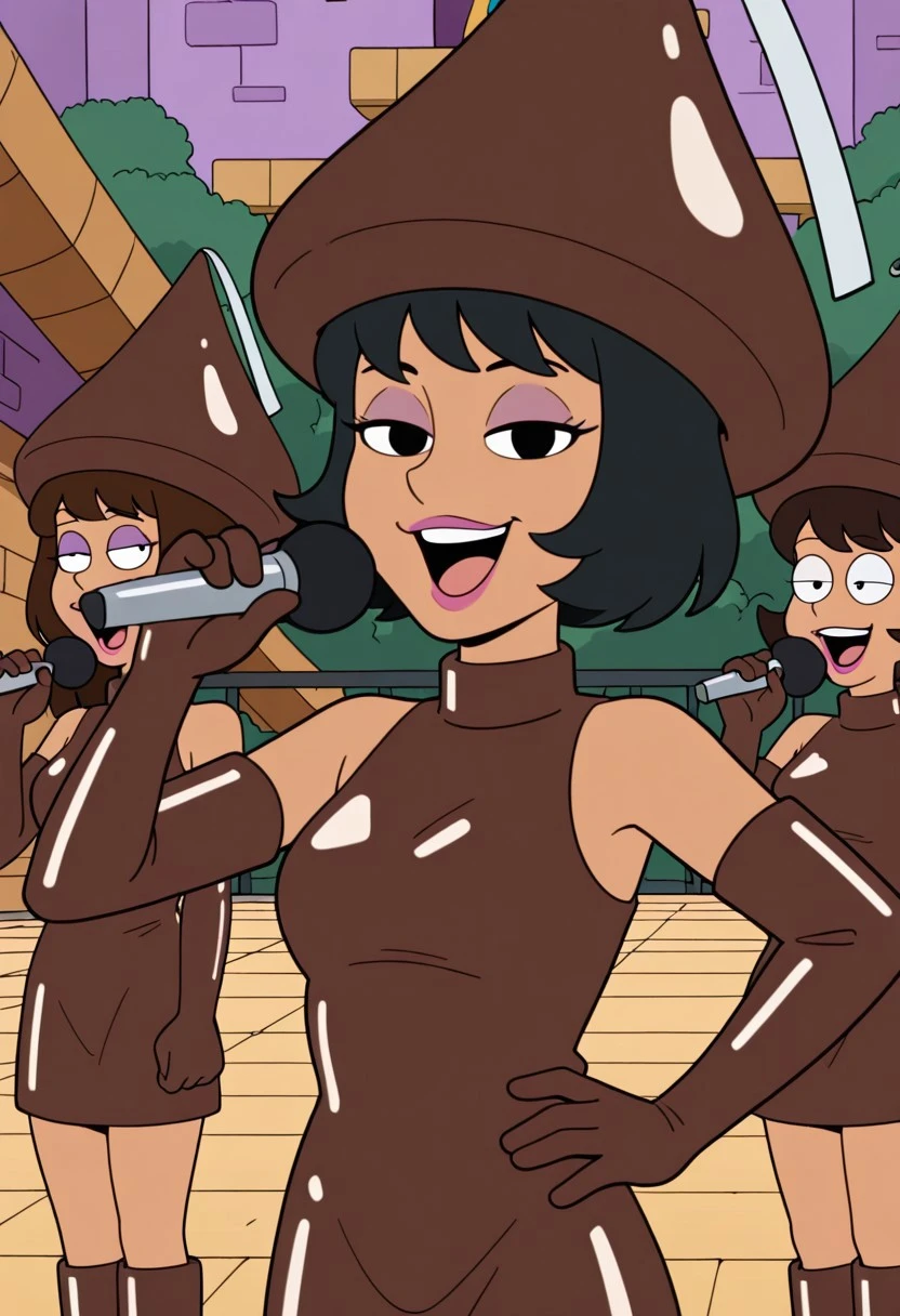 Hershy_ad, 1girl, solo, brown hair, bob cut, purple eyelashes, lipstick, makeup, chocolate hat