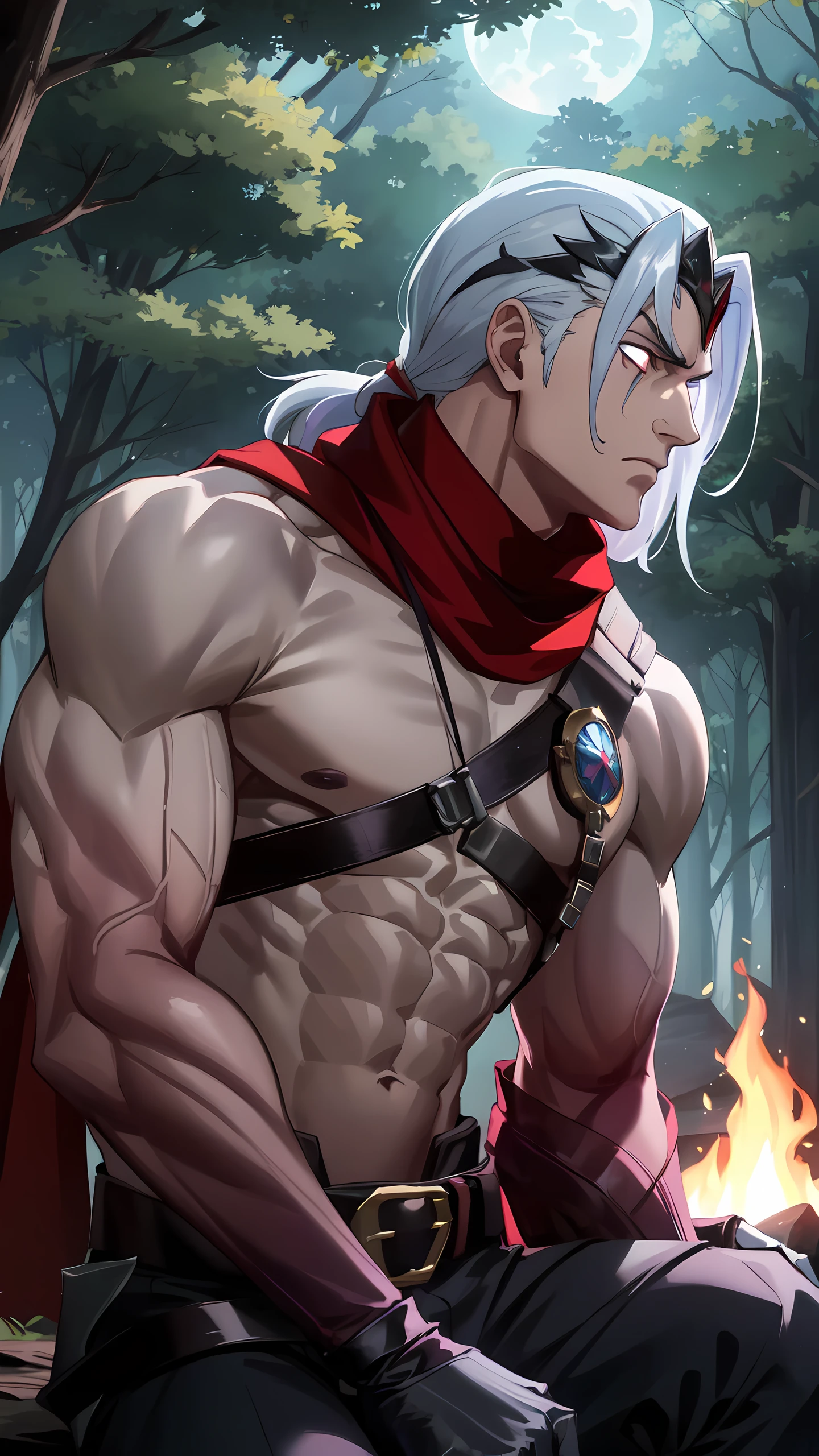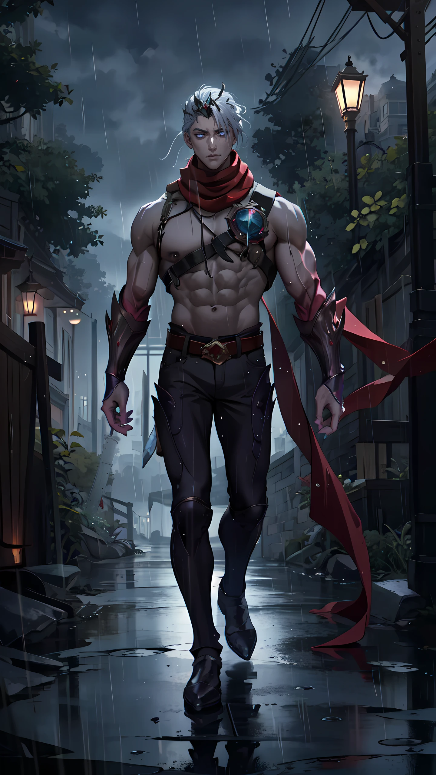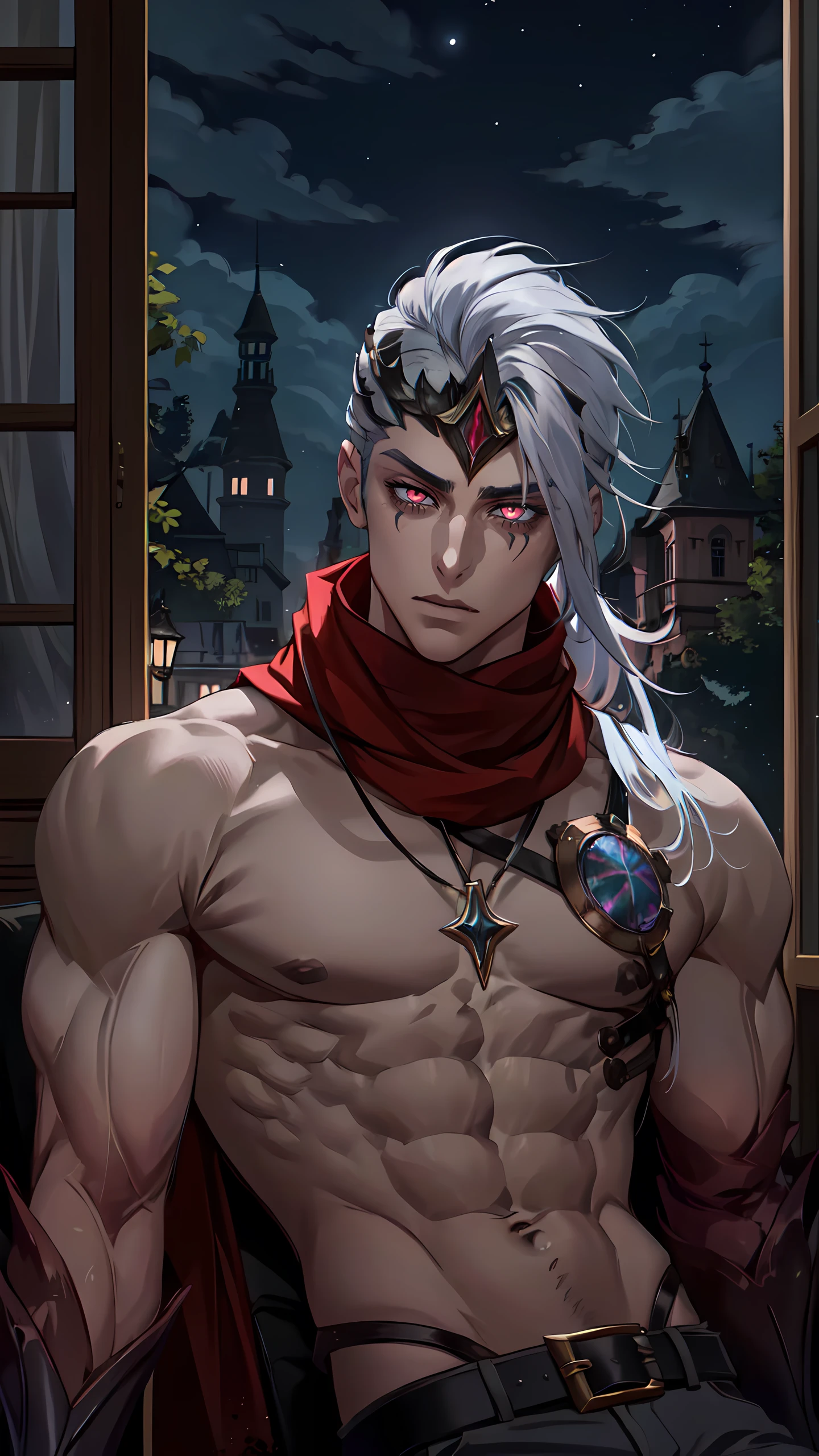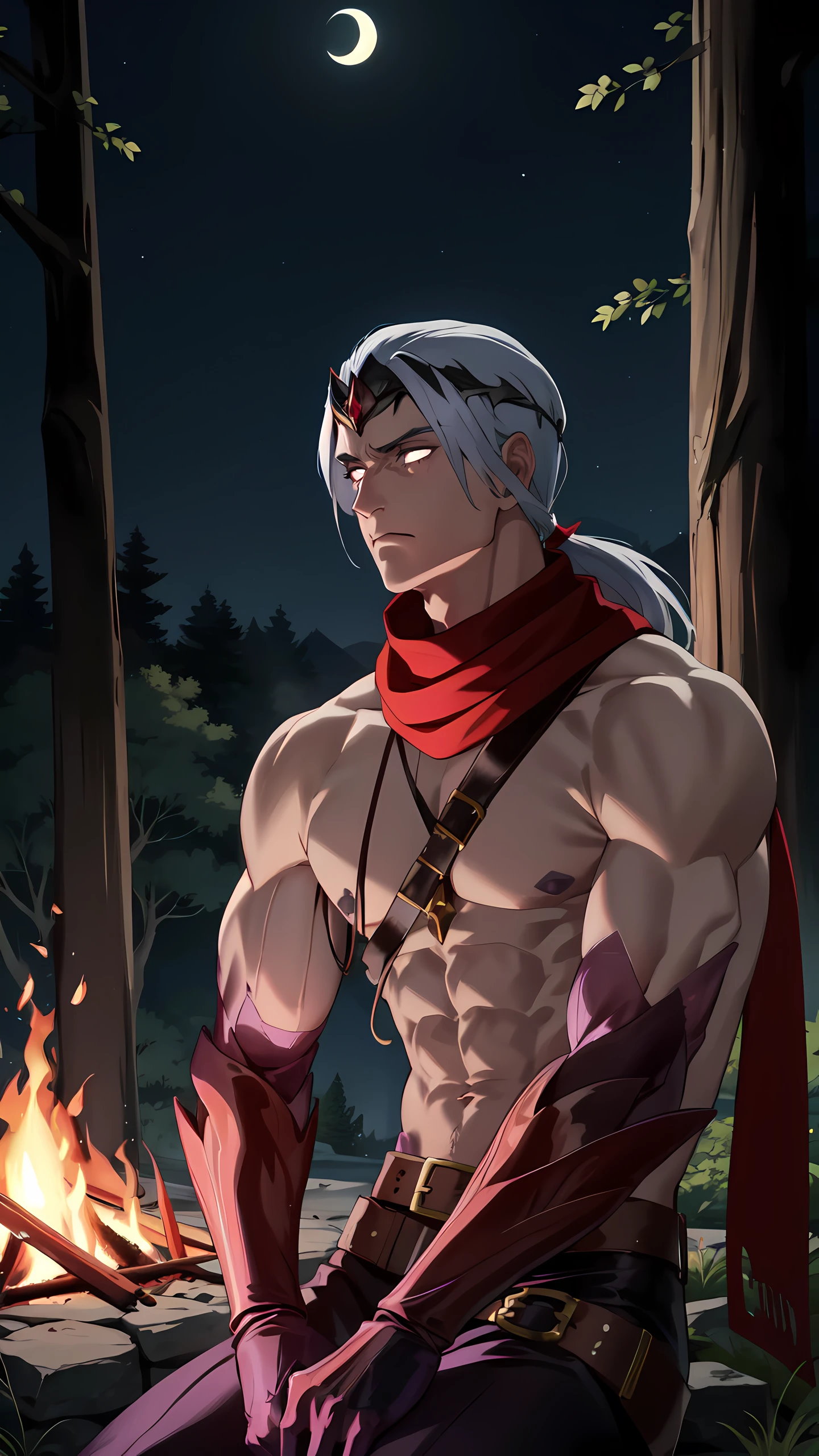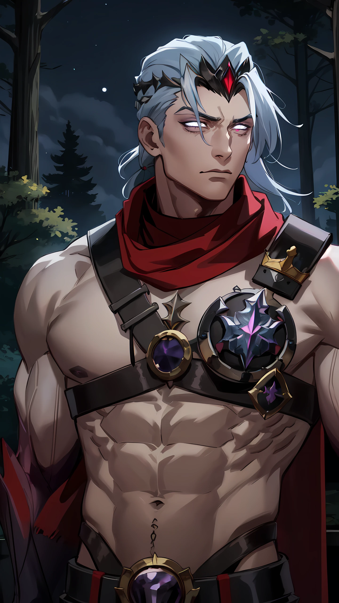 Varus, solo, short hair,1boy, (belt), grey hair, male focus, scarf, armor, muscular, glowing, muscular male, red scarf, crown, glowing eyes, long hair, topless