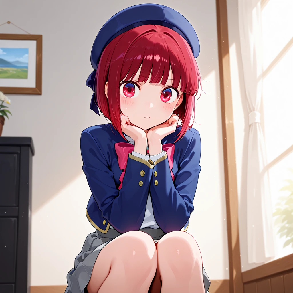 kanao, red hair, short hair, red eyes, beret, white shirt, blue jacket, open jacket, bowtie, grey skirt,