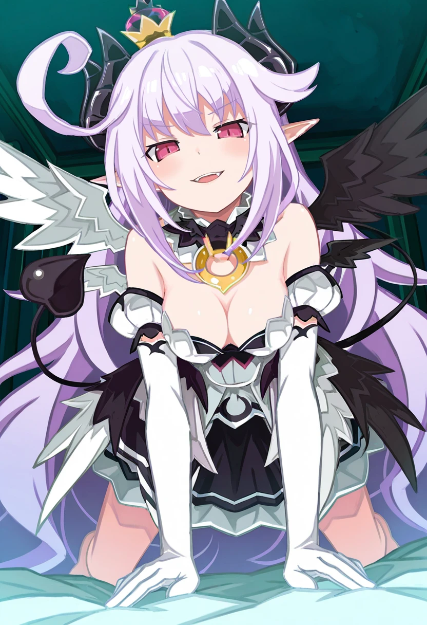 ruche_trillion, grt_ovrlrd_ruche, lavender hair, cowlick, very long hair, pink eyes, demon horns, pointy ears, demon girl, mismatched wings, multiple wings, demon tail, , mini crown, white dress, detached collar, cleavage, o-ring, detached sleeves, white elbow gloves, shoulders, overskirt, layered skirt, black skirt