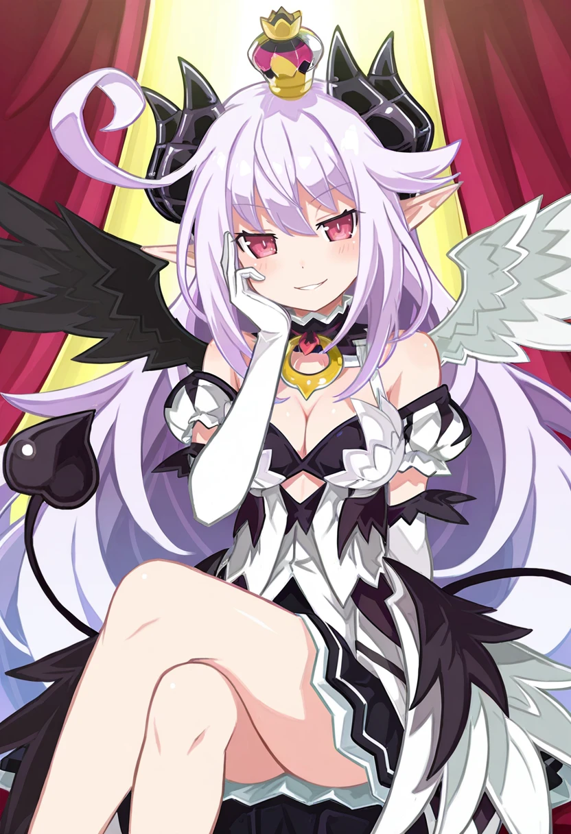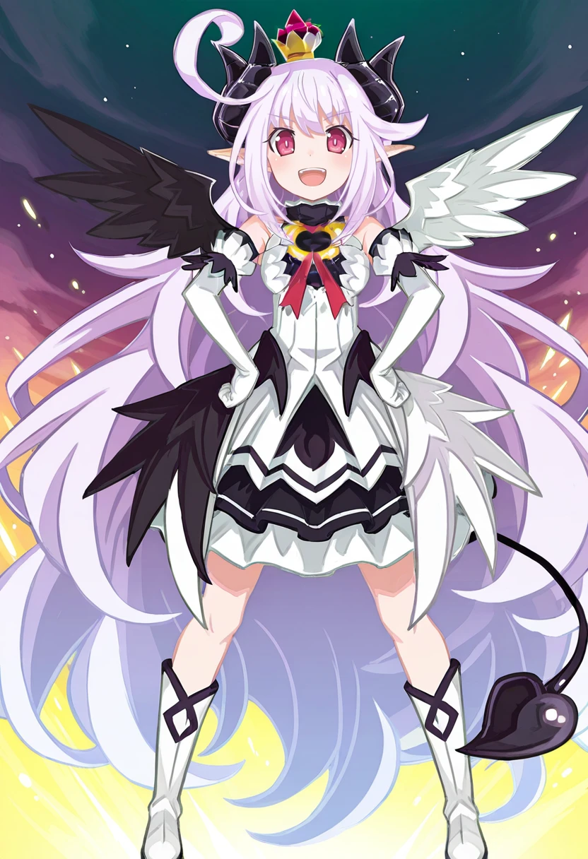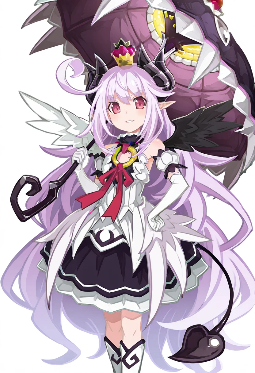 ruche_trillion, ruche_def, lavender hair, cowlick, very long hair, pink eyes, demon horns, pointy ears, demon girl, mismatched wings, demon tail, small , mini crown, white dress, black turtleneck, o-ring, red ribbon, detached sleeves, white elbow gloves, shoulders, overskirt, layered skirt, black skirt, white knee boots