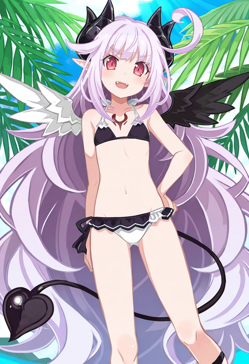ruche_trillion, ruche_swim, lavender hair, cowlick, very long hair, pink eyes, demon horns, pointy ears, demon girl, mismatched wings, demon tail, small breasts, chest tattoo, black bikini top, frilled bikini bottom, multicolored bikini bottom, black ankle straps, sandalsDescription