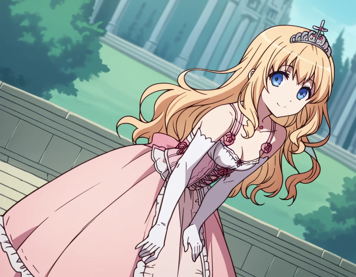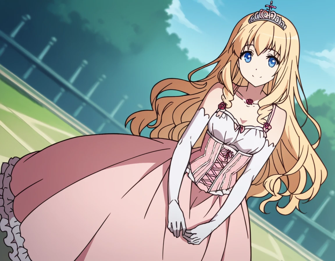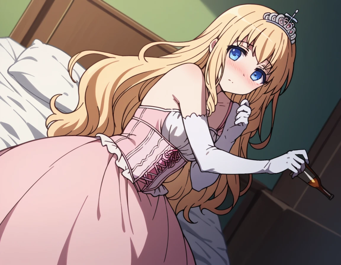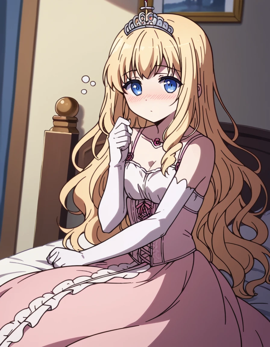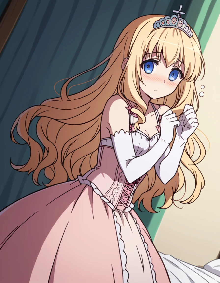 diadem, tiara, elbow gloves, gloves, white gloves, dress, frilled dress, long skirt, frilled skirt, corset, pink dress,