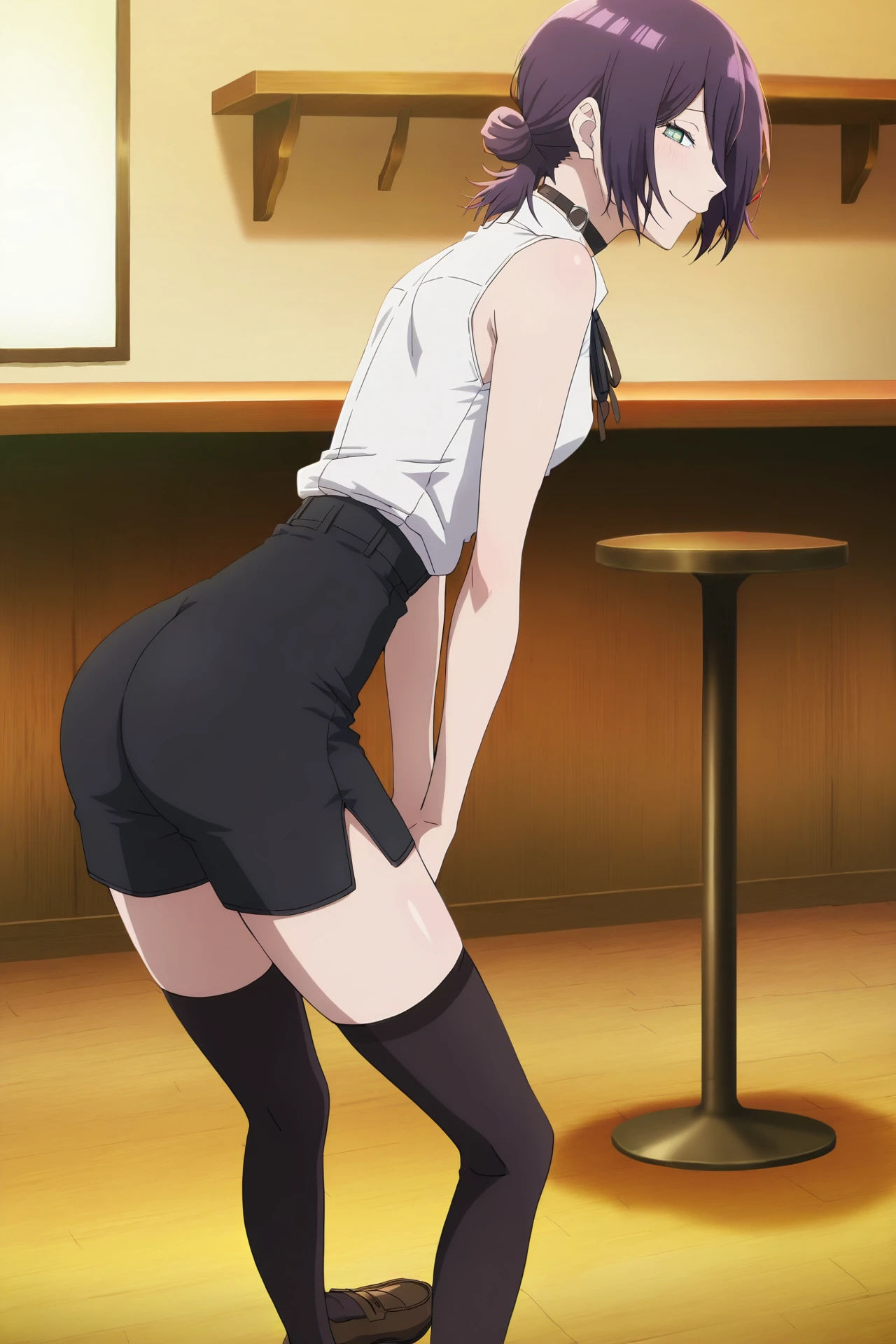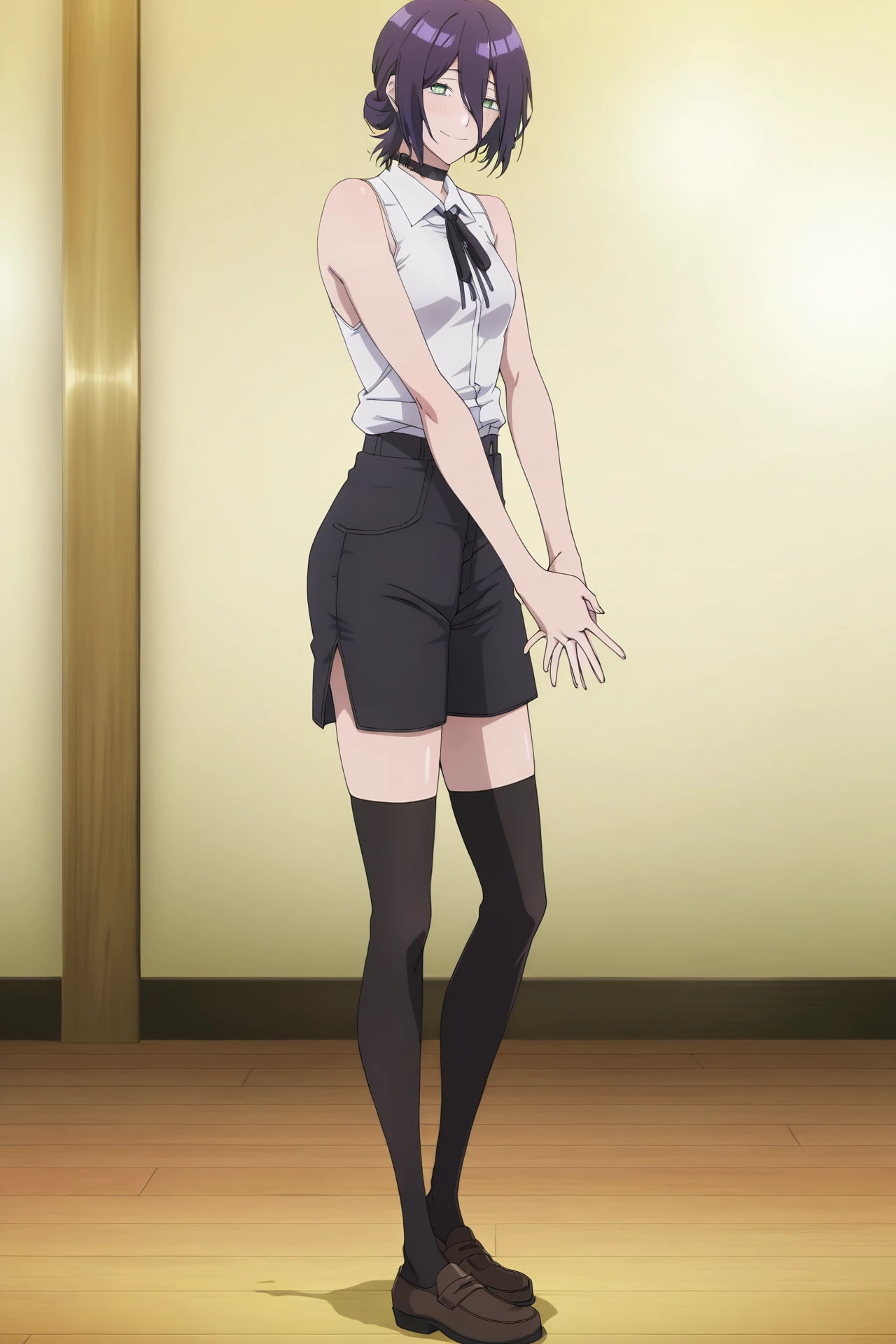 ribbon, white shirt, sleeveless, collared shirt, choker, black thighhighs, hair bun, zettai ryouiki, sleeveless shirt, short shorts neck ribbon, black ribbon, black choker, black shorts, brown footwear, loafers, side slit, shirt tucked in, side slit shorts,