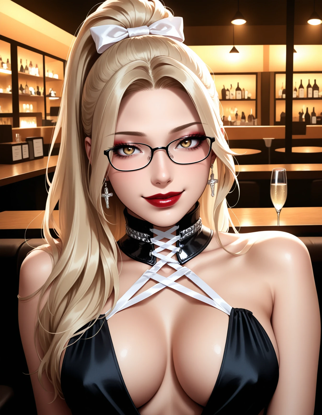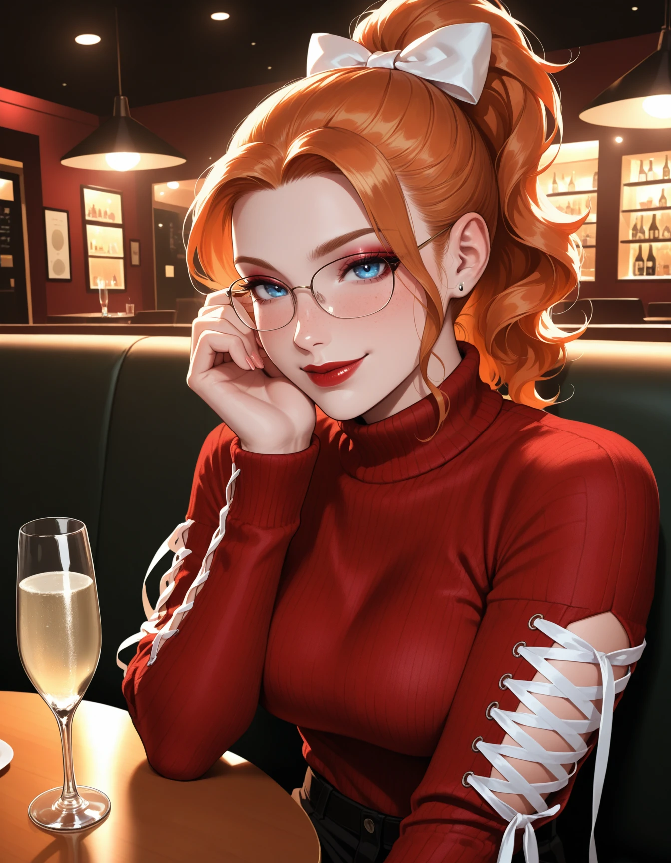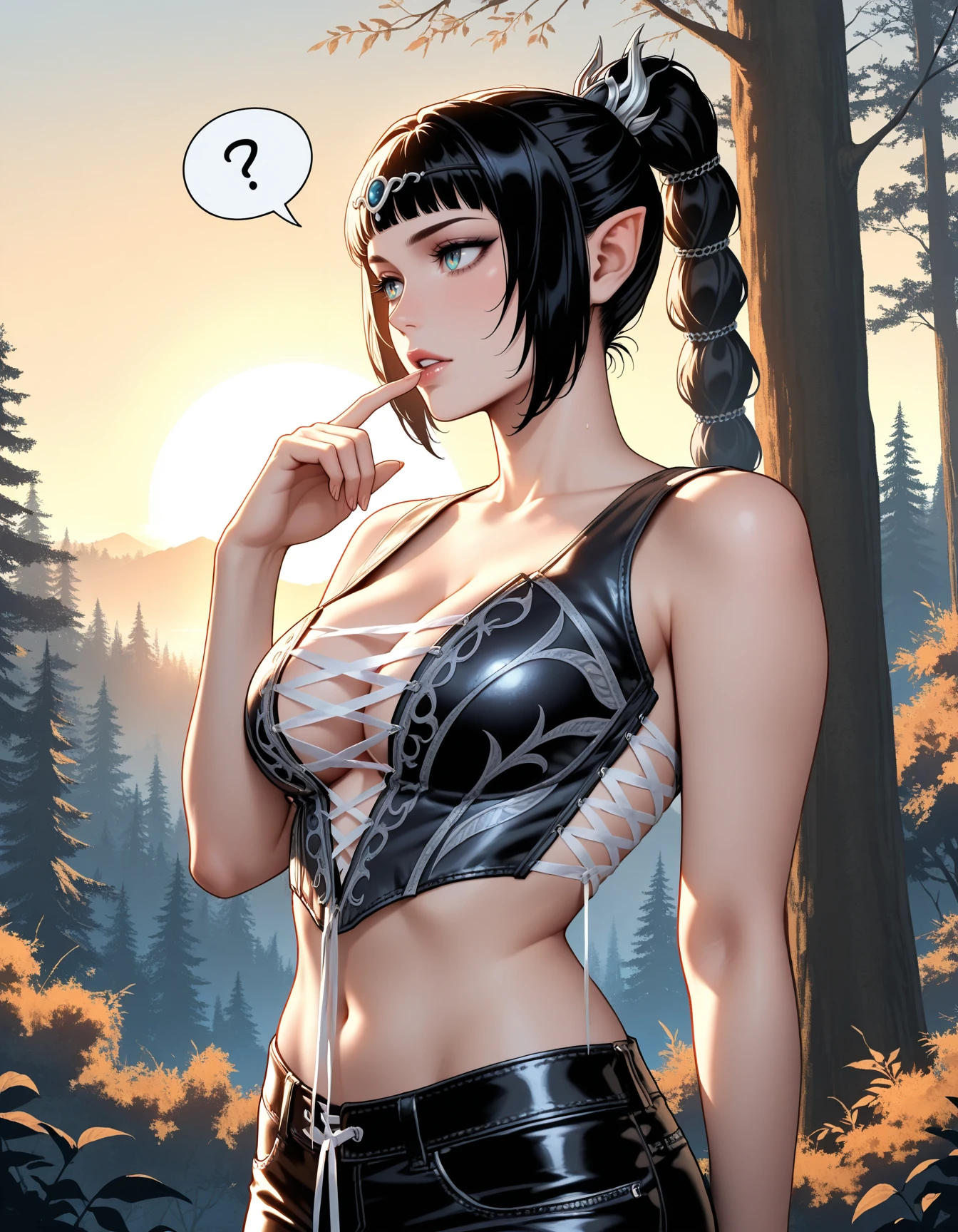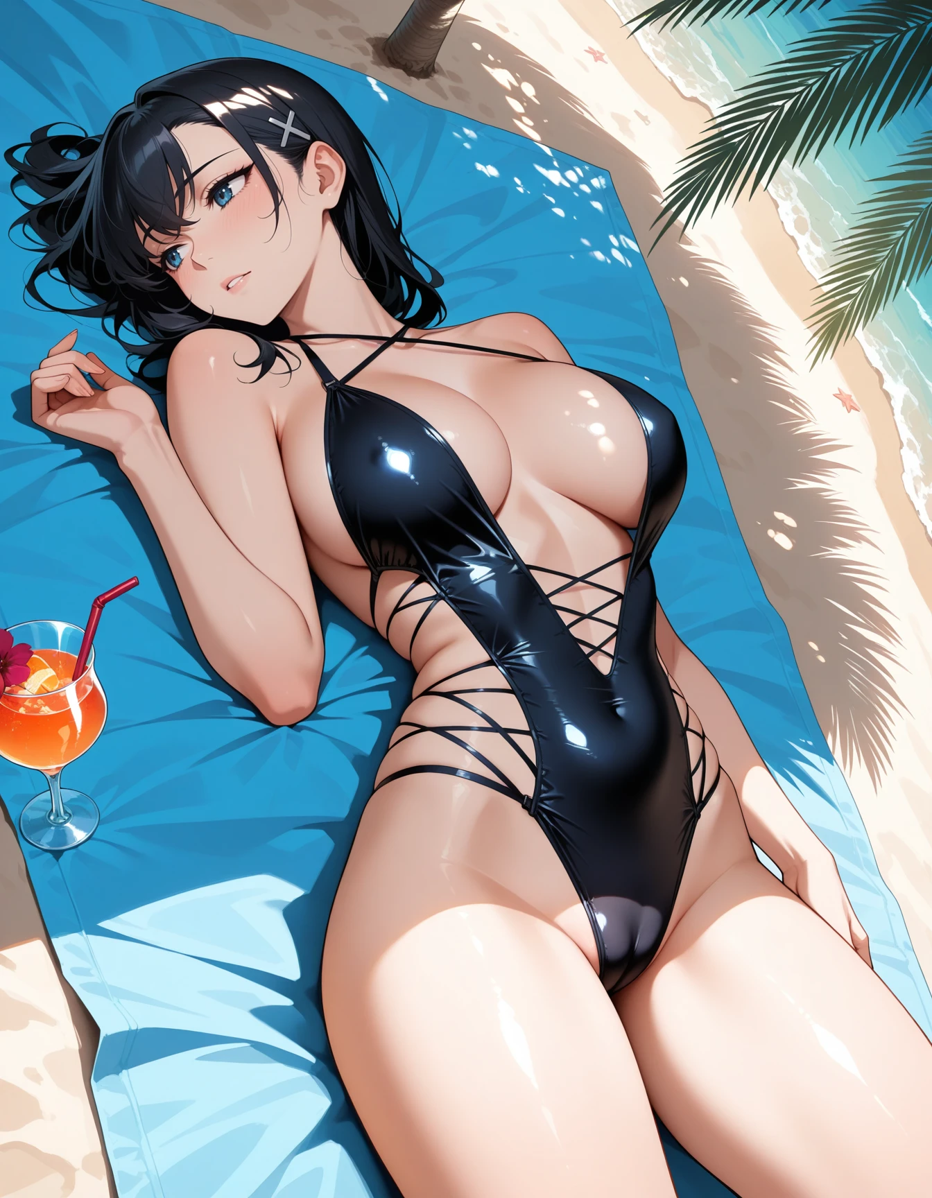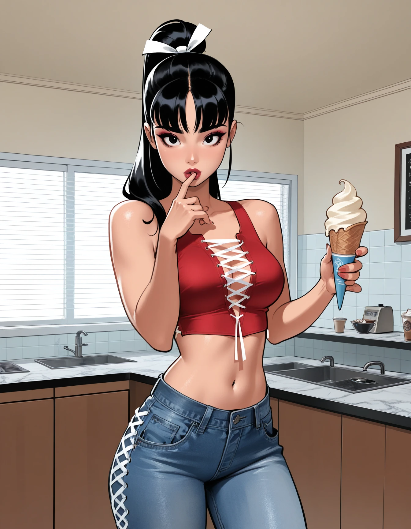 blue cross-laced croptop, cross-laced sides, midriff, navel, white ribbon, cleavage, ribbon drawstrings
