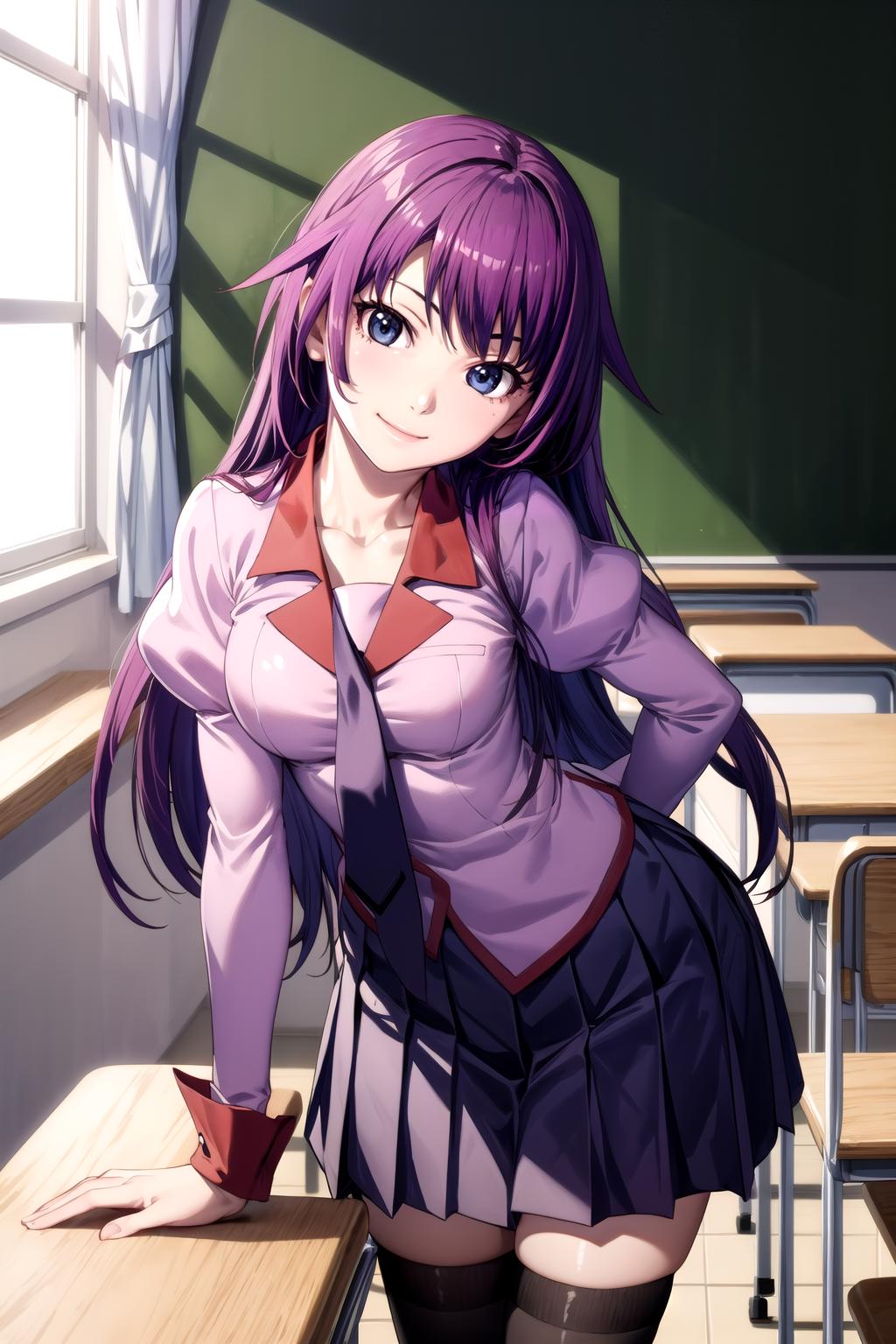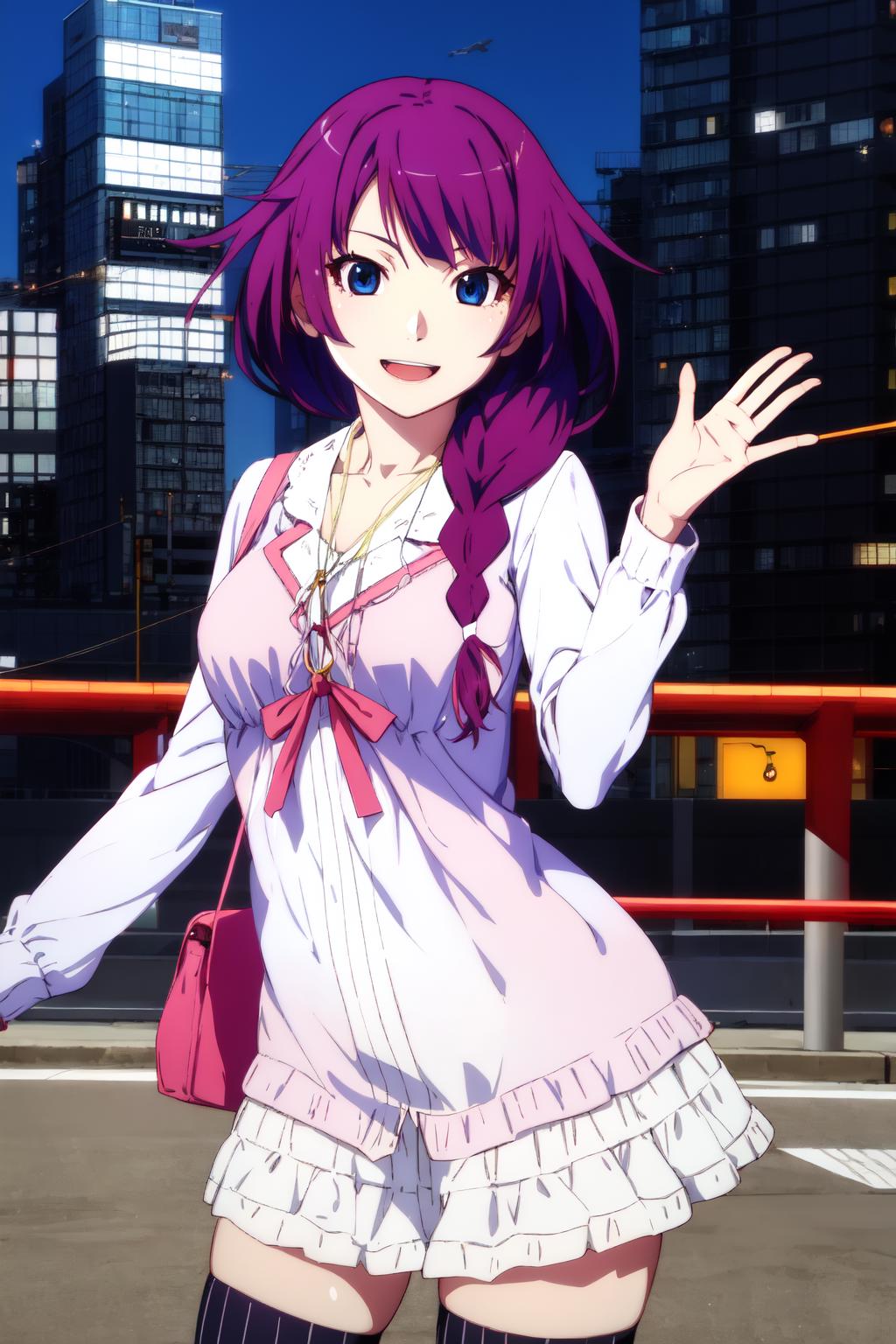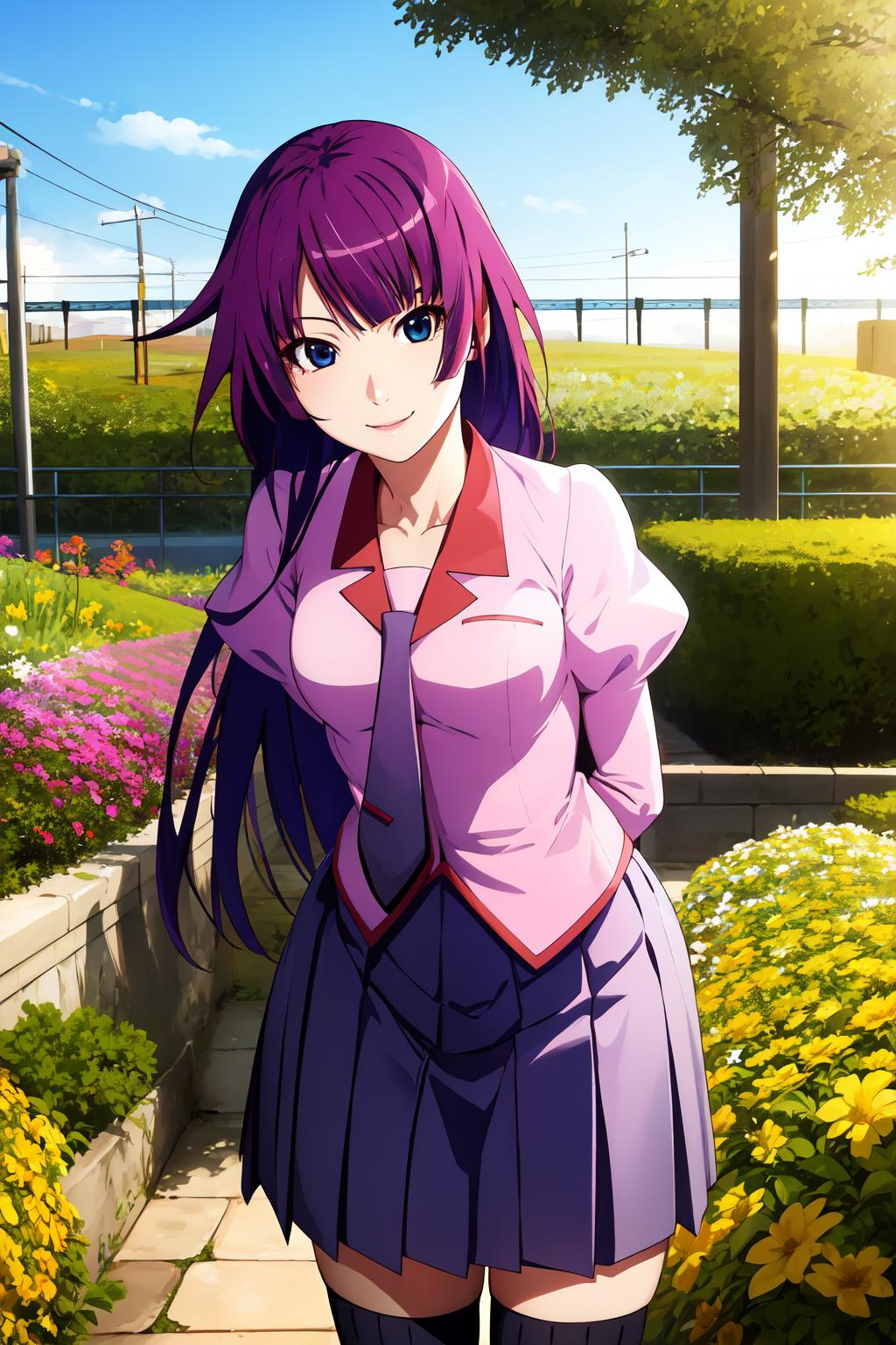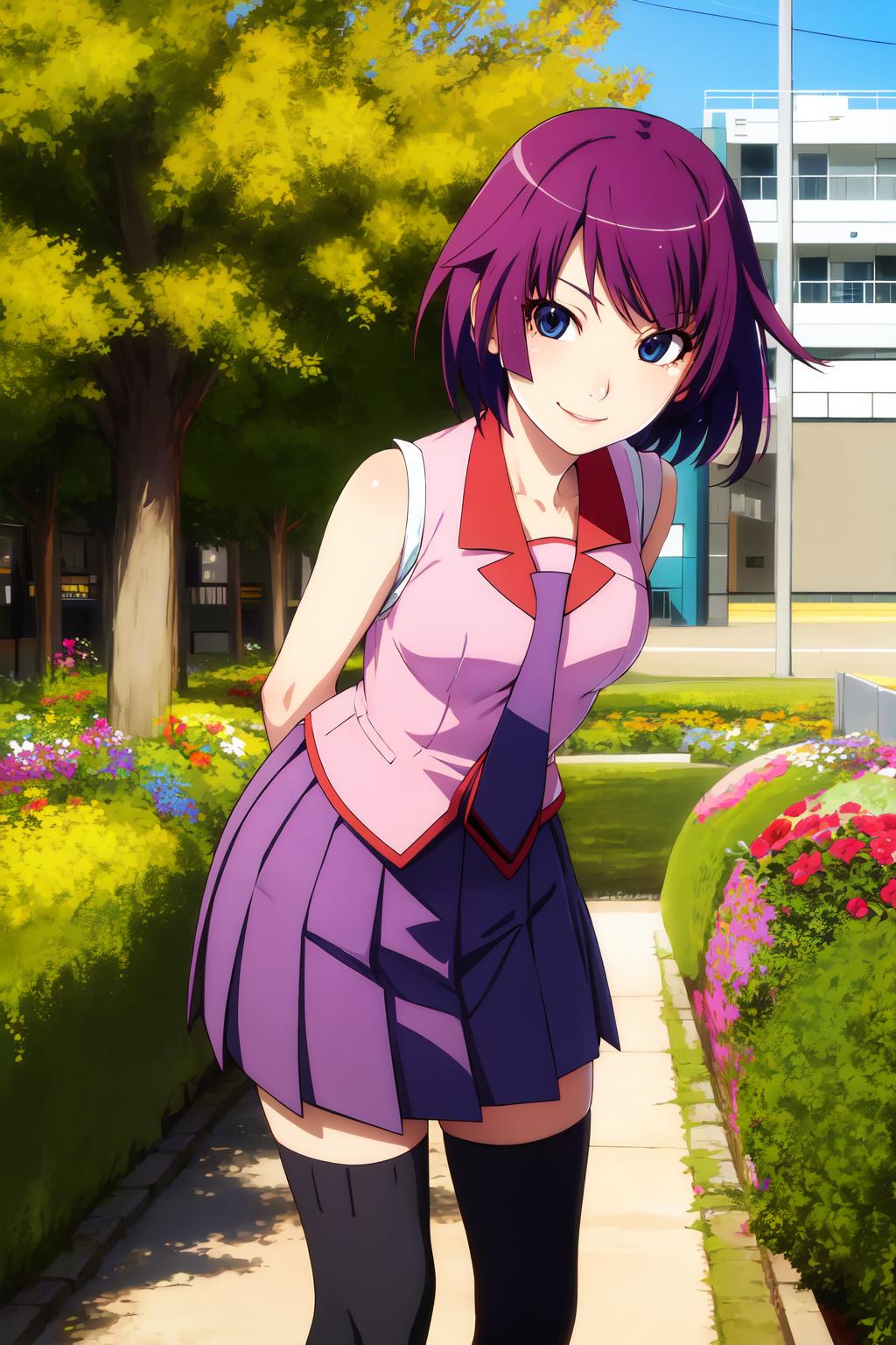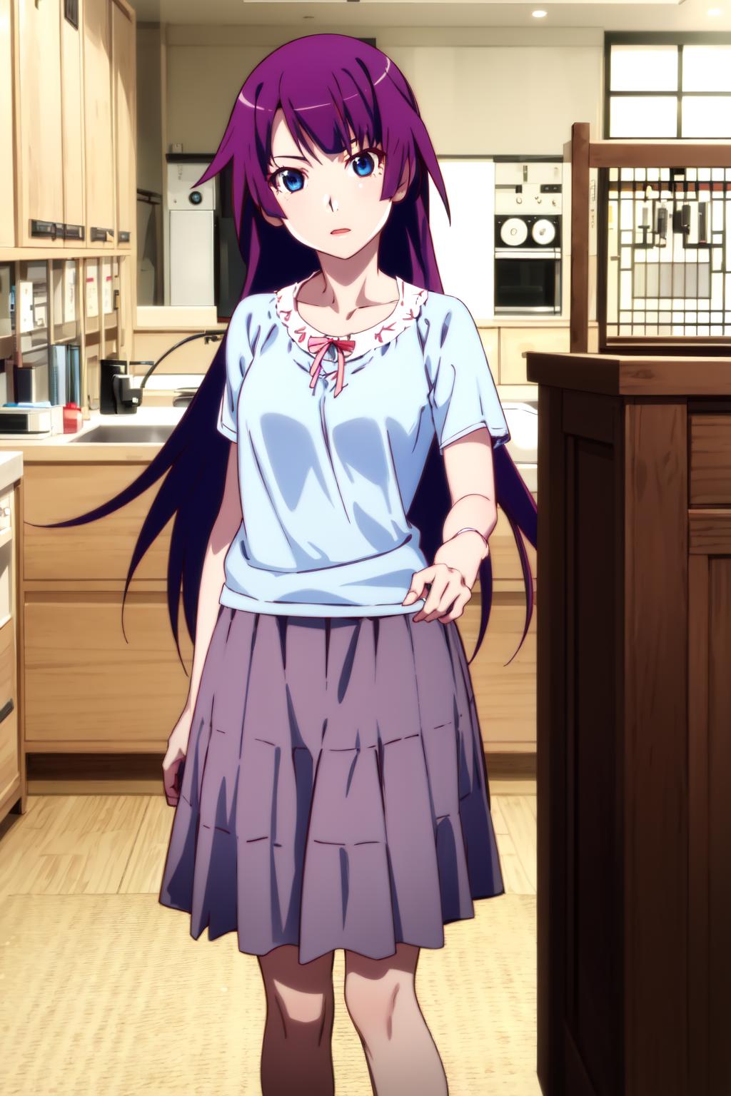 hitagisenjougahara, breasts, red camisole, short hair, blue eyes, cleavage, medium breasts, purple hair, red pajama pantshitagisenjougahara, long hair, blue shirt, looking at viewer, blue eyes, brown skirt, skirt, standing, purple hairHave fun!
