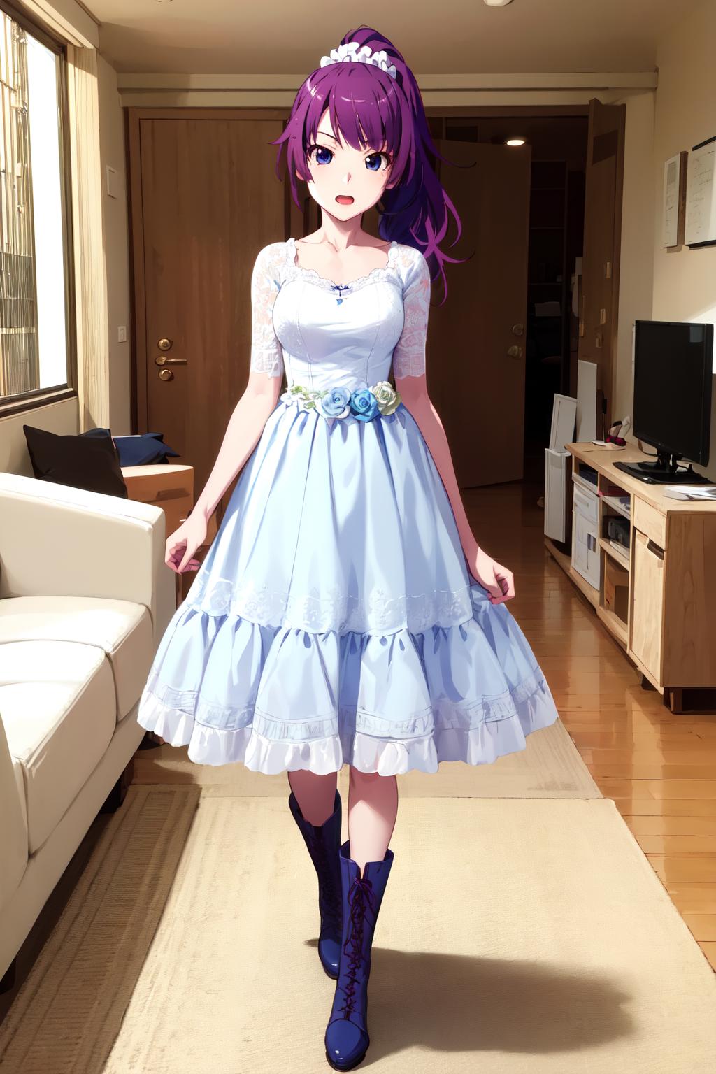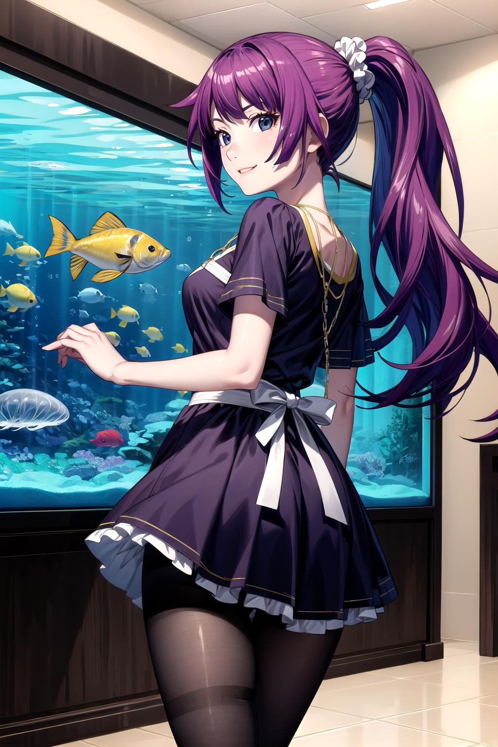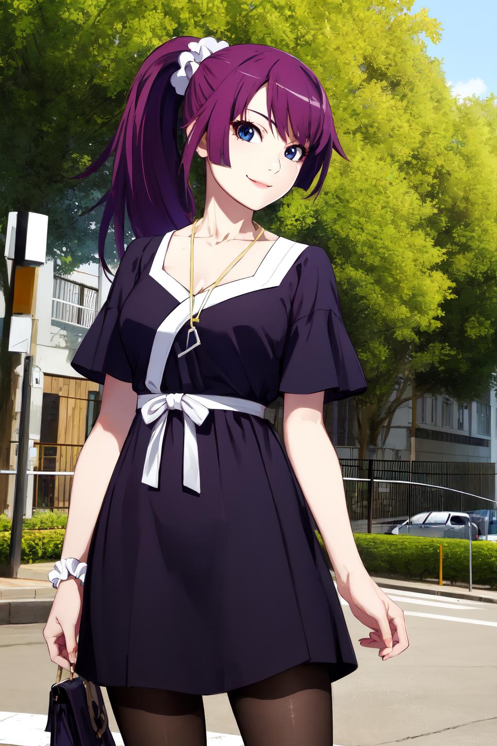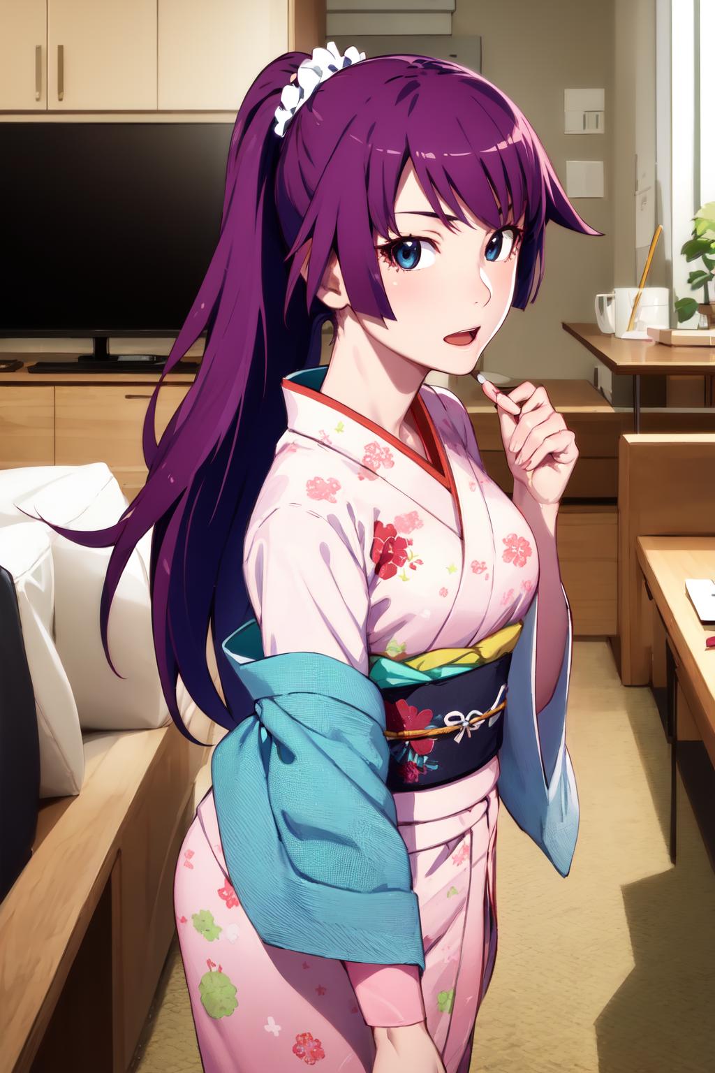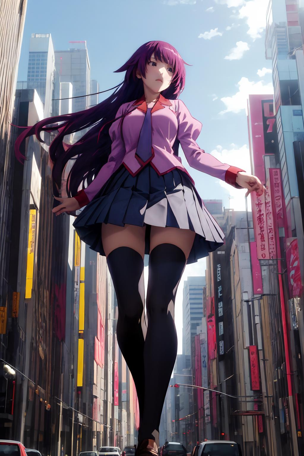 hitagisenjougahara, breasts, red camisole, short hair, blue eyes, cleavage, medium breasts, purple hair, red pajama pantshitagisenjougahara, long hair, blue shirt, looking at viewer, blue eyes, brown skirt, skirt, standing, purple hairHave fun!